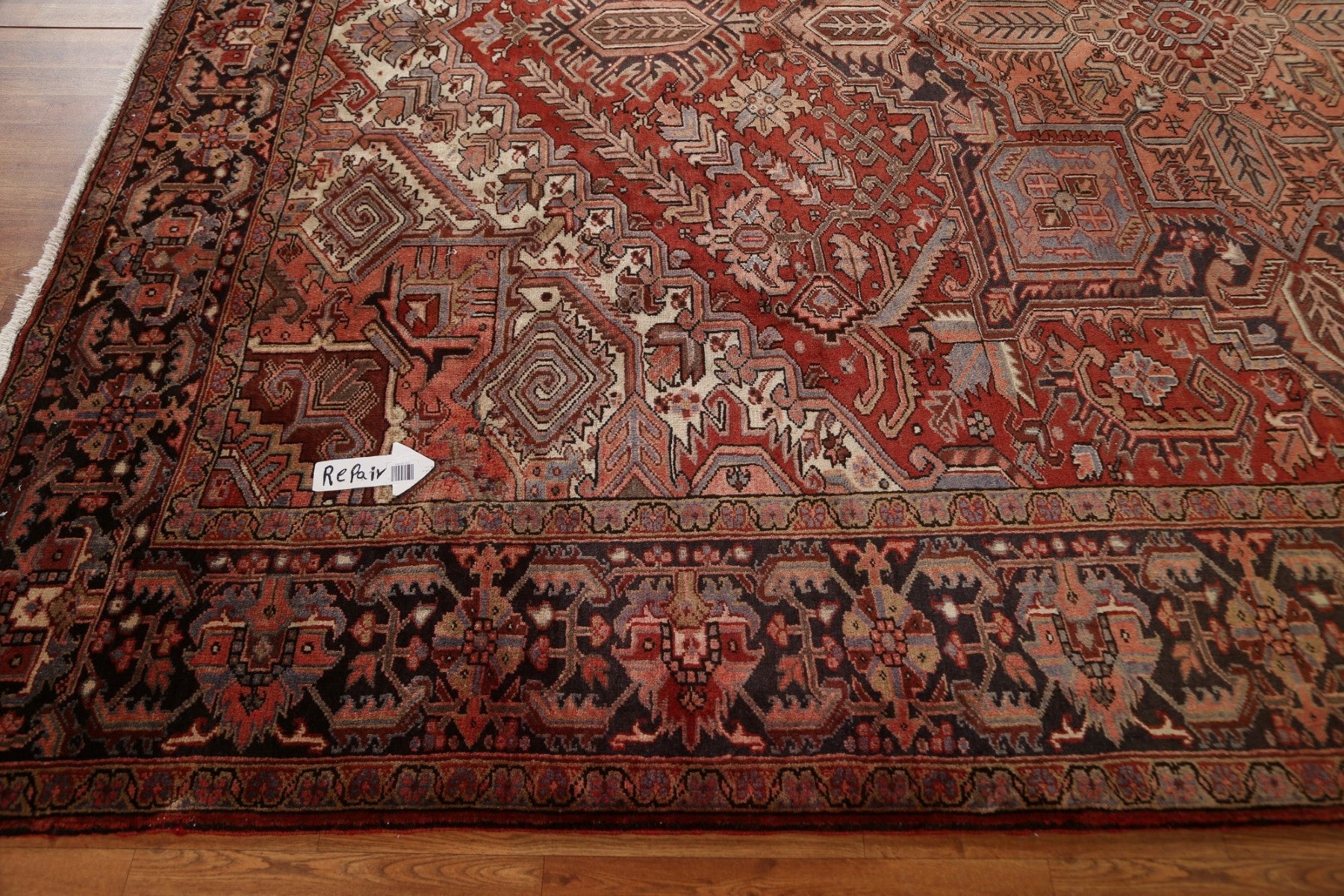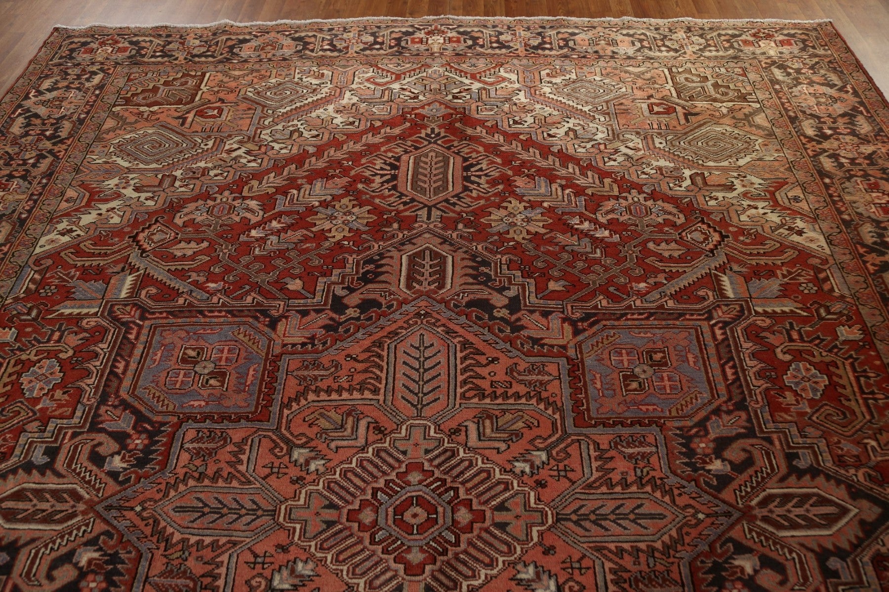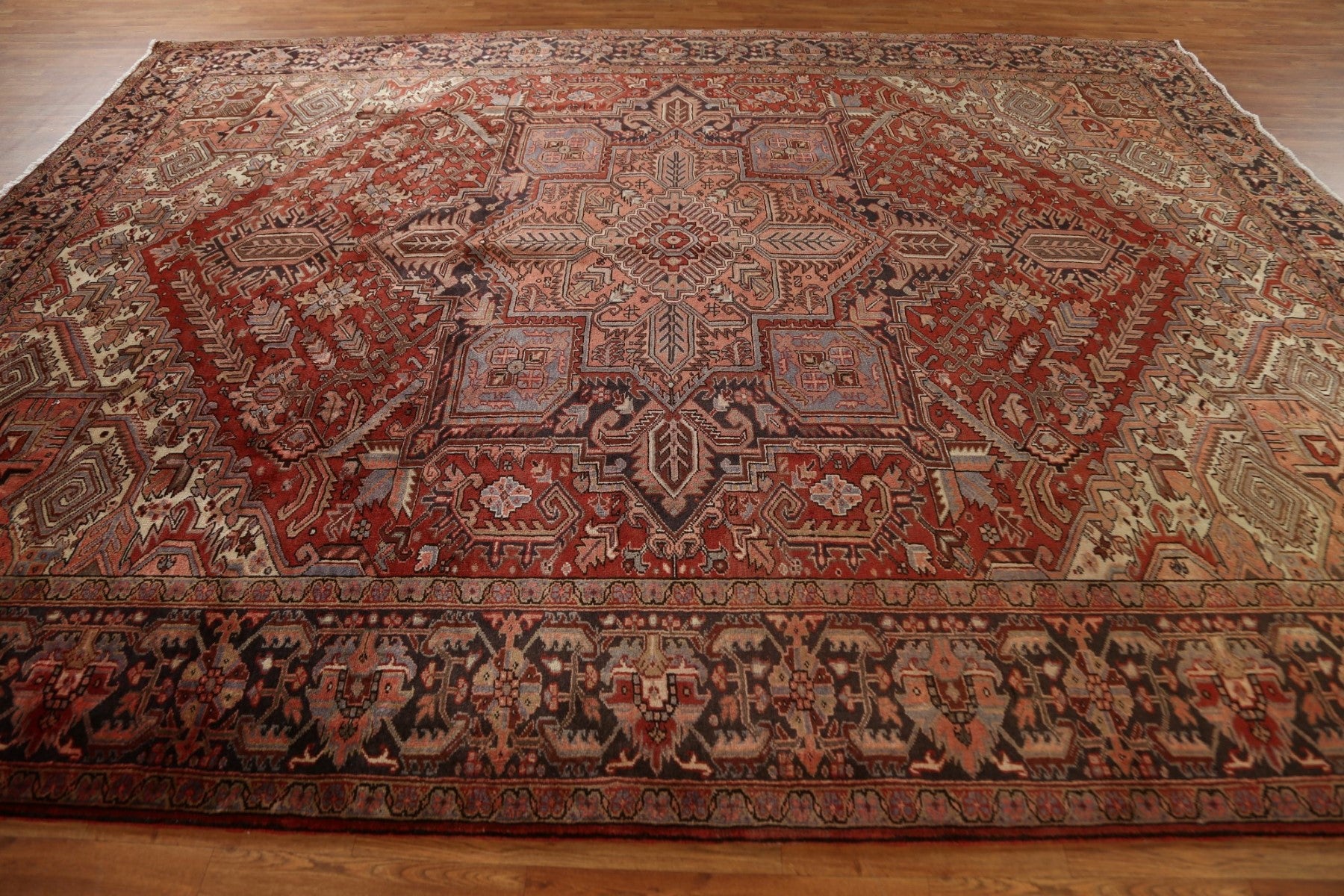 A Beautiful Genuine Persia ( Persia ) Heriz rug is Hand Knotted by skillful weavers in Persia ( Persia ) with 100% Wool Material. This rug is in Very Good (Repair) condition. dimensions are 12' 9'' X 9' 10'' in foot and 389 X 300 in centimeter. the primary color is Red.
