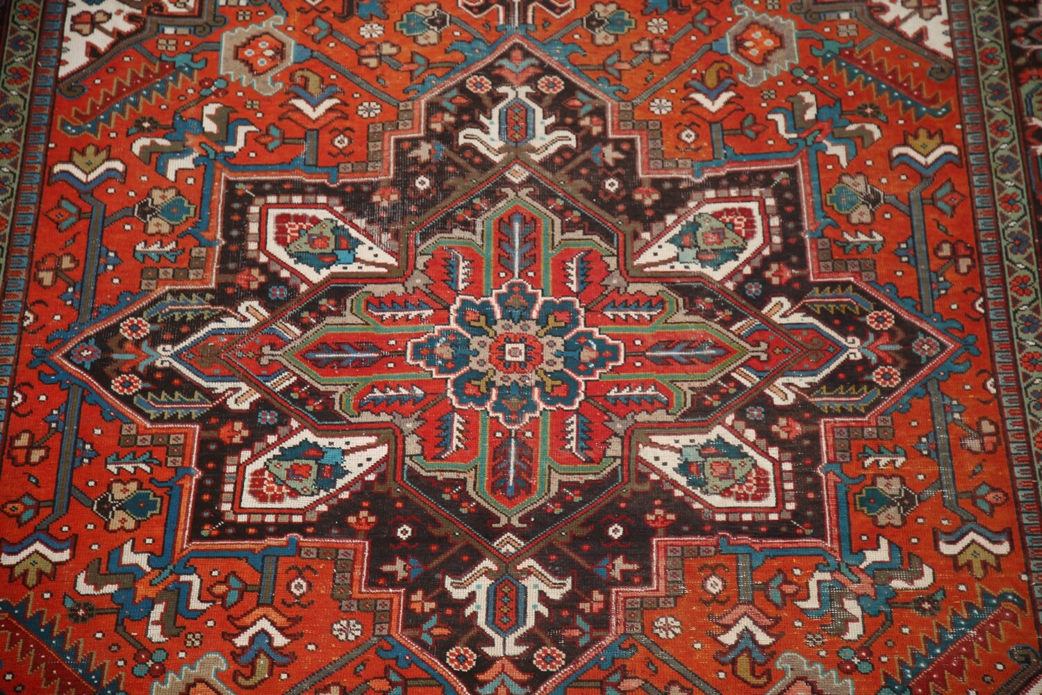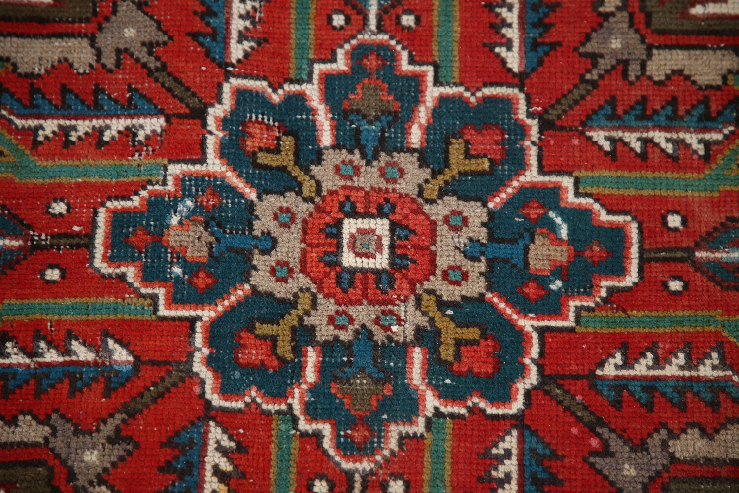 A Beautiful Genuine Persia ( Persia ) Heriz rug is Hand Knotted by skillful weavers in Persia ( Persia ) with 100% Wool Material. This rug is in Very Good ( Low Pile ) condition. dimensions are 10' 7'' X 7' 2'' in foot and 323 X 218 in centimeter. the primary color is Red.