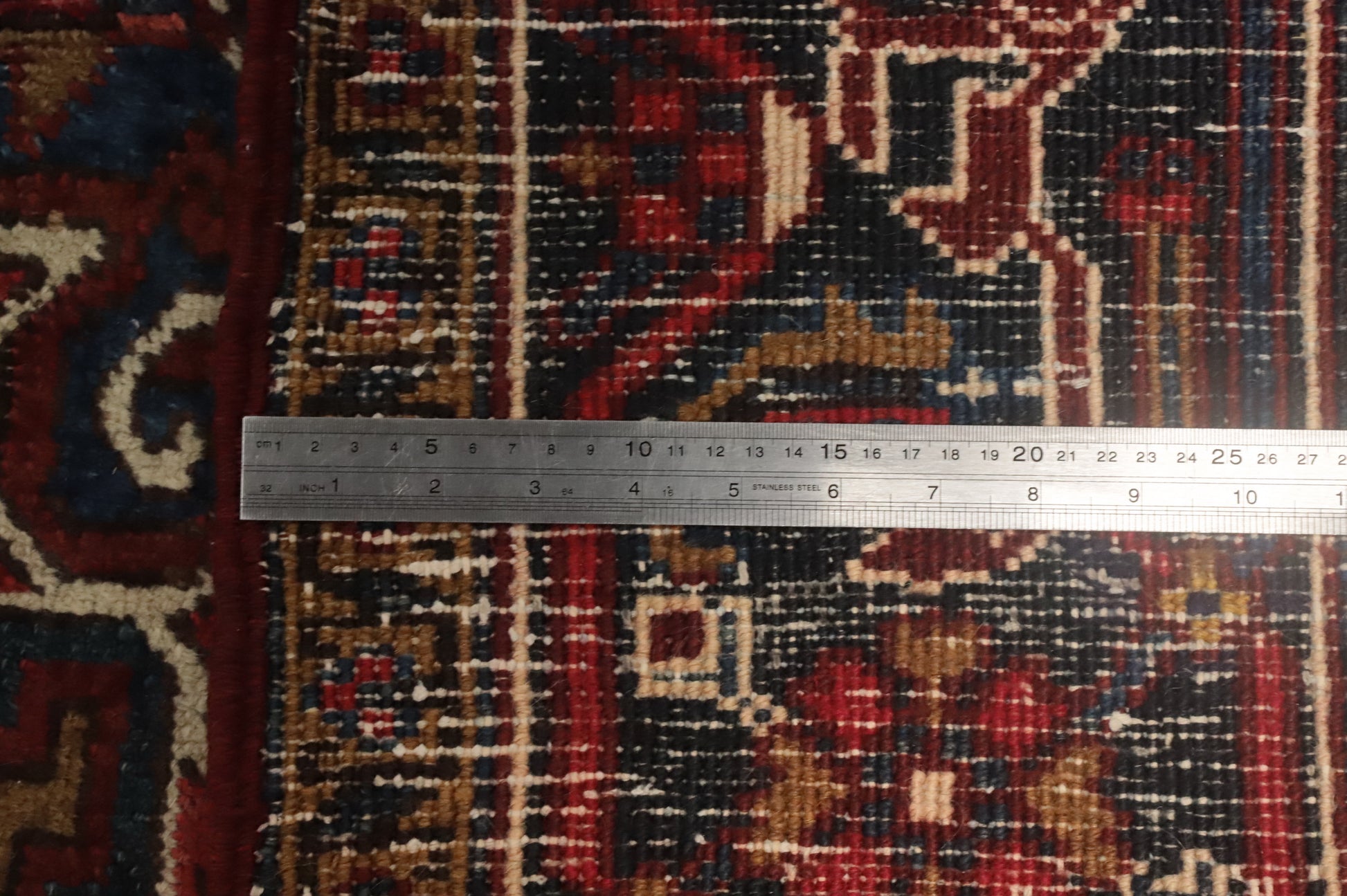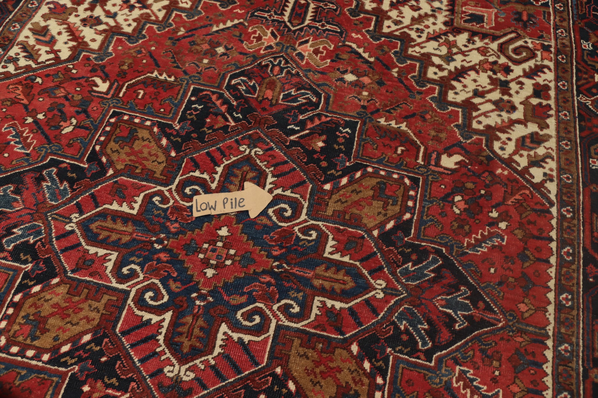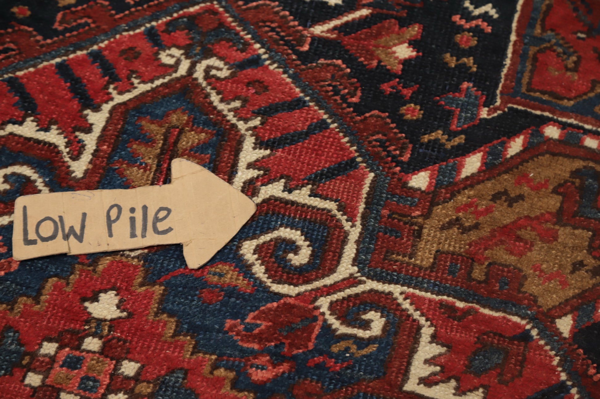 A Beautiful Genuine Persia ( Persia ) Heriz rug is Hand Knotted by skillful weavers in Persia ( Persia ) with 100% Wool Material. This rug is in Very Good ( Low Pile ) condition. dimensions are 9' 5'' X 7' 2'' in foot and 287 X 218 in centimeter. the primary color is Oranges & Rust.