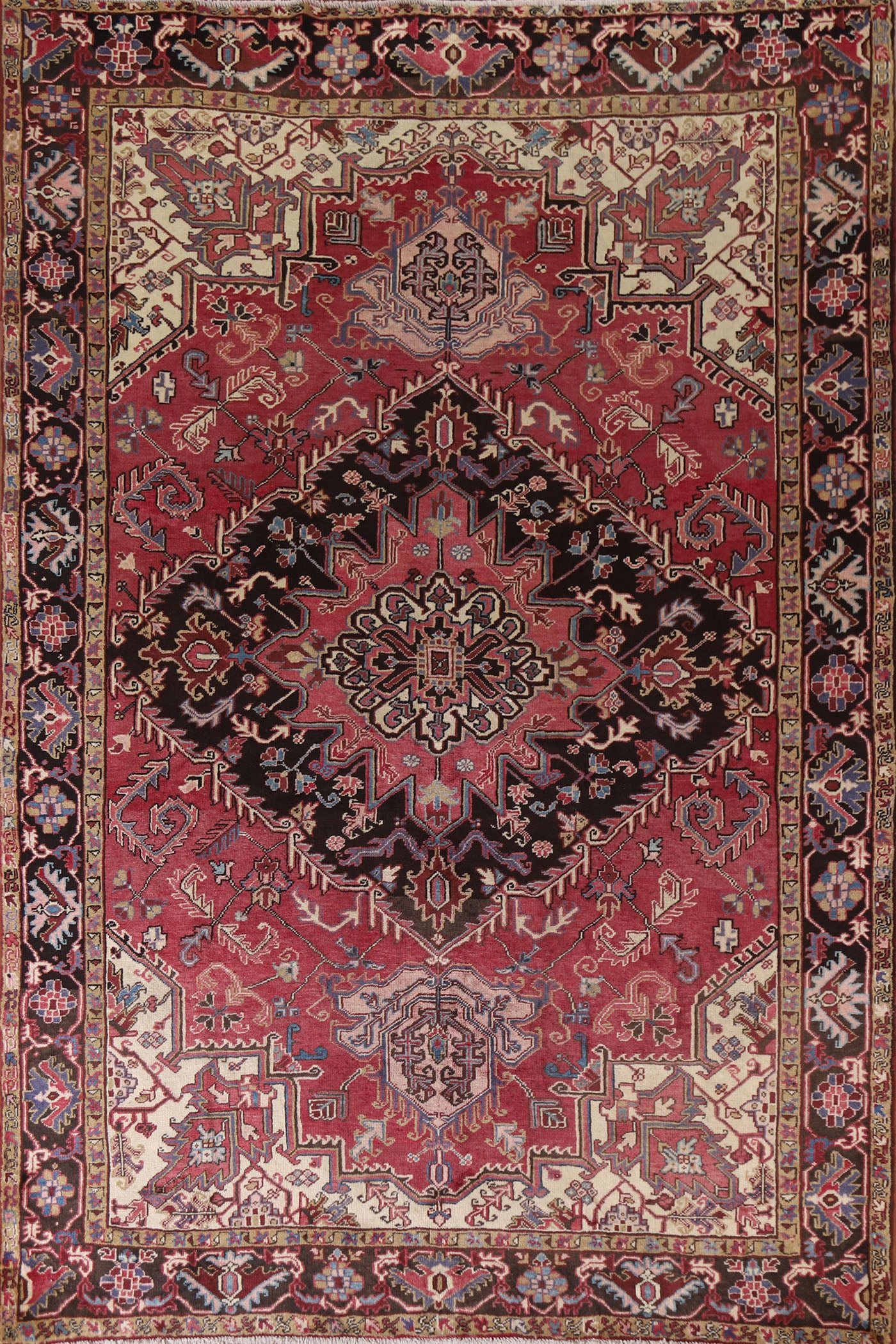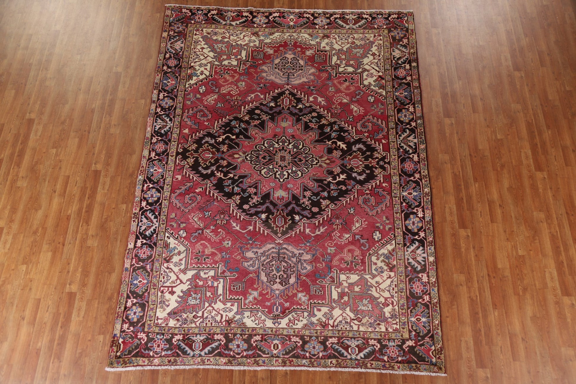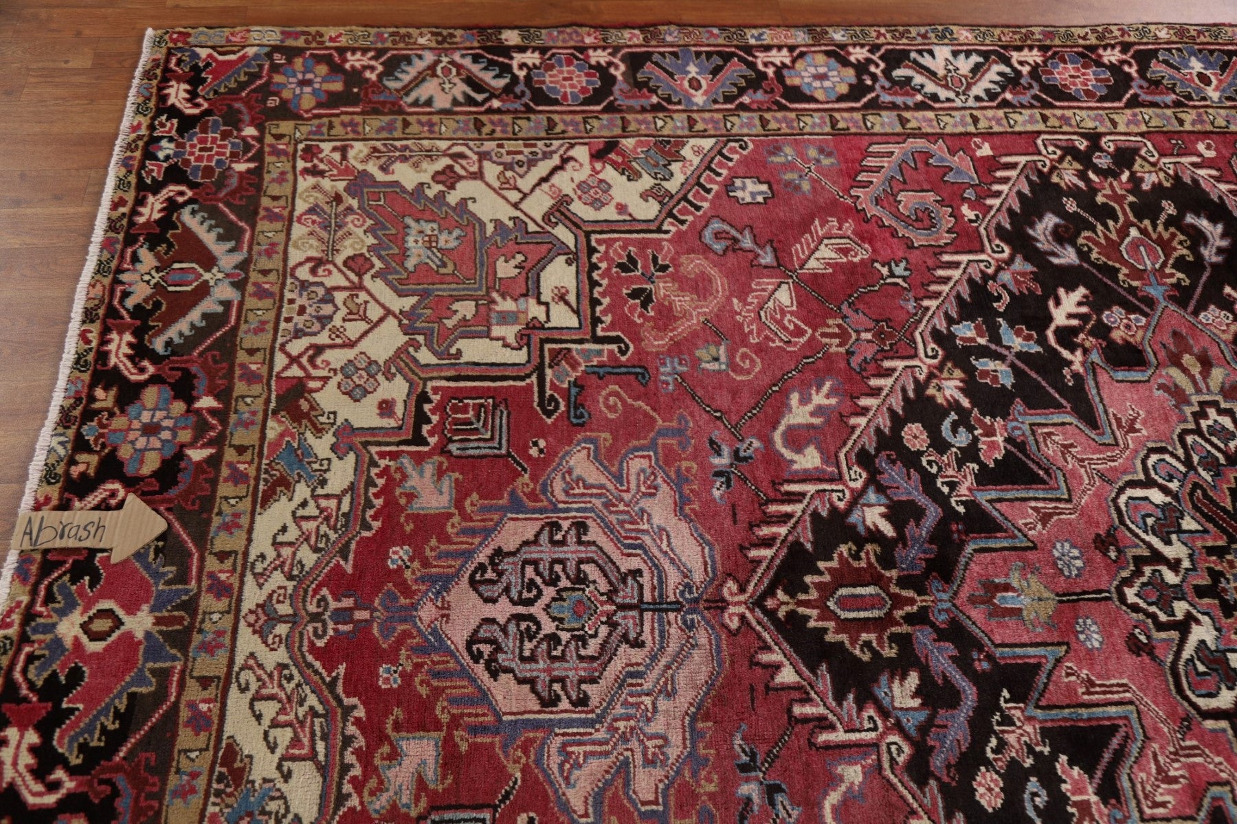 A Beautiful Genuine Persia ( Persia ) Heriz rug is Hand Knotted by skillful weavers in Persia ( Persia ) with 100% Wool Material. This rug is in Very Good (Low Pile-Abrash) condition. dimensions are 10' 7'' X 7' 8'' in foot and 323 X 234 in centimeter. the primary color is Pink.