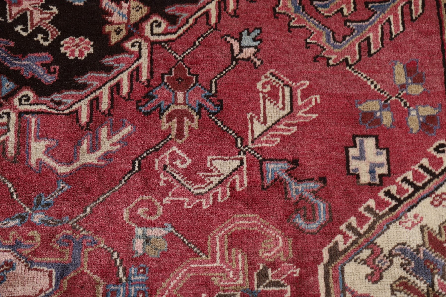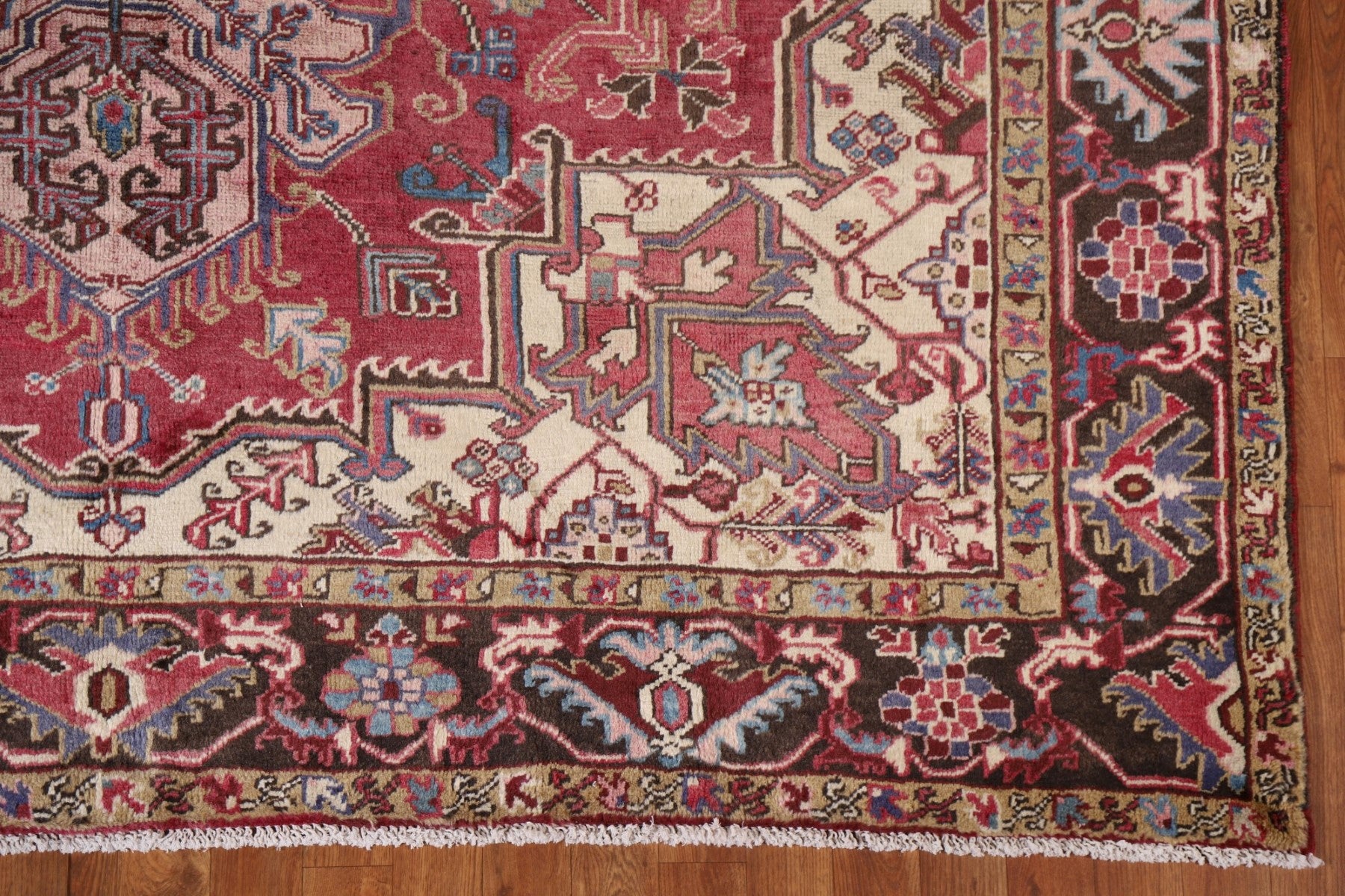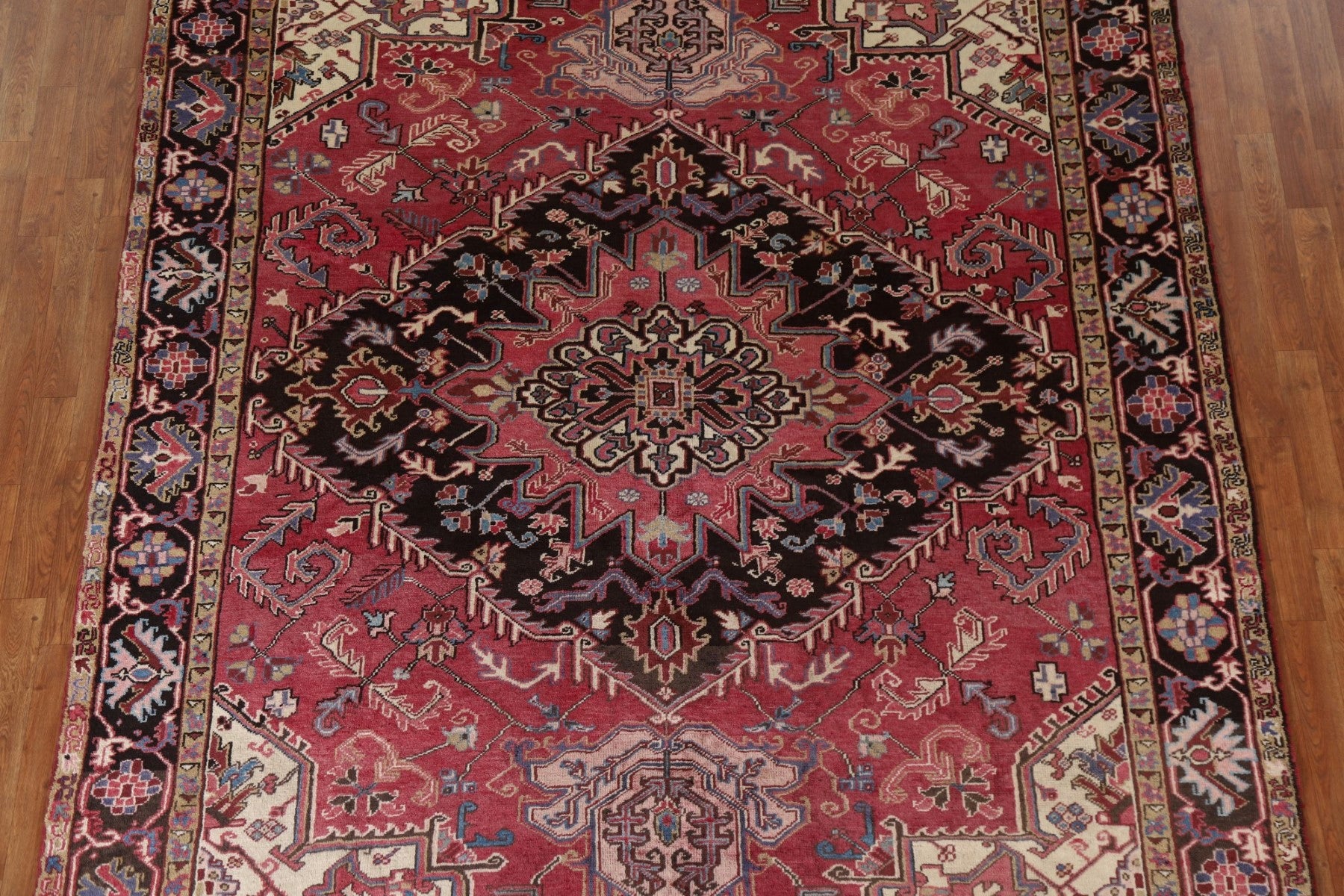 A Beautiful Genuine Persia ( Persia ) Heriz rug is Hand Knotted by skillful weavers in Persia ( Persia ) with 100% Wool Material. This rug is in Very Good (Low Pile-Abrash) condition. dimensions are 10' 7'' X 7' 8'' in foot and 323 X 234 in centimeter. the primary color is Pink.