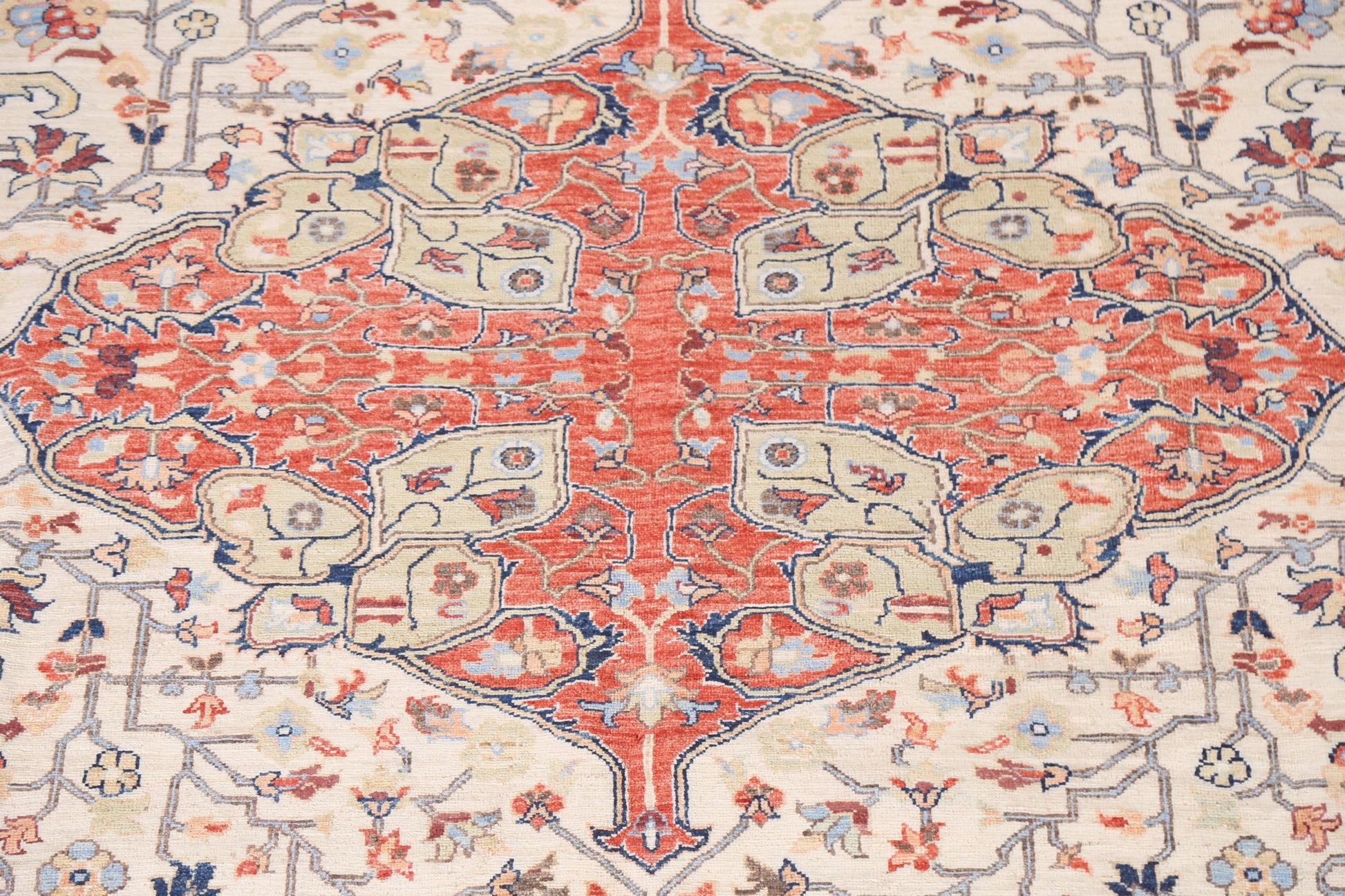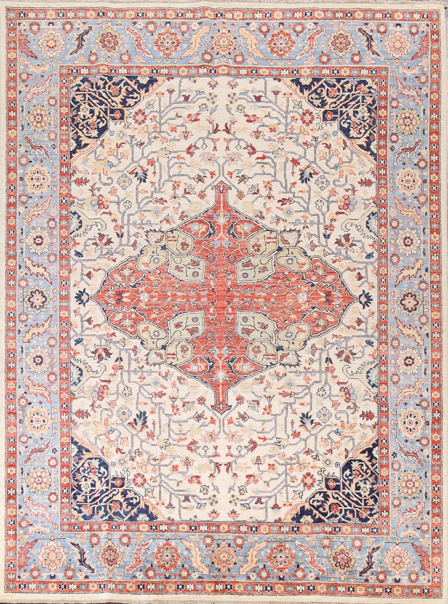A Beautiful Genuine Pakistan Heriz (serapi) rug is Hand Knotted by skillful weavers in Pakistan with 100% Wool Material. This rug is in New, First Quality condition. dimensions are 9' 9'' X 7' 9'' in foot and 297 X 236 in centimeter. the primary color is Beige & Ivories.
