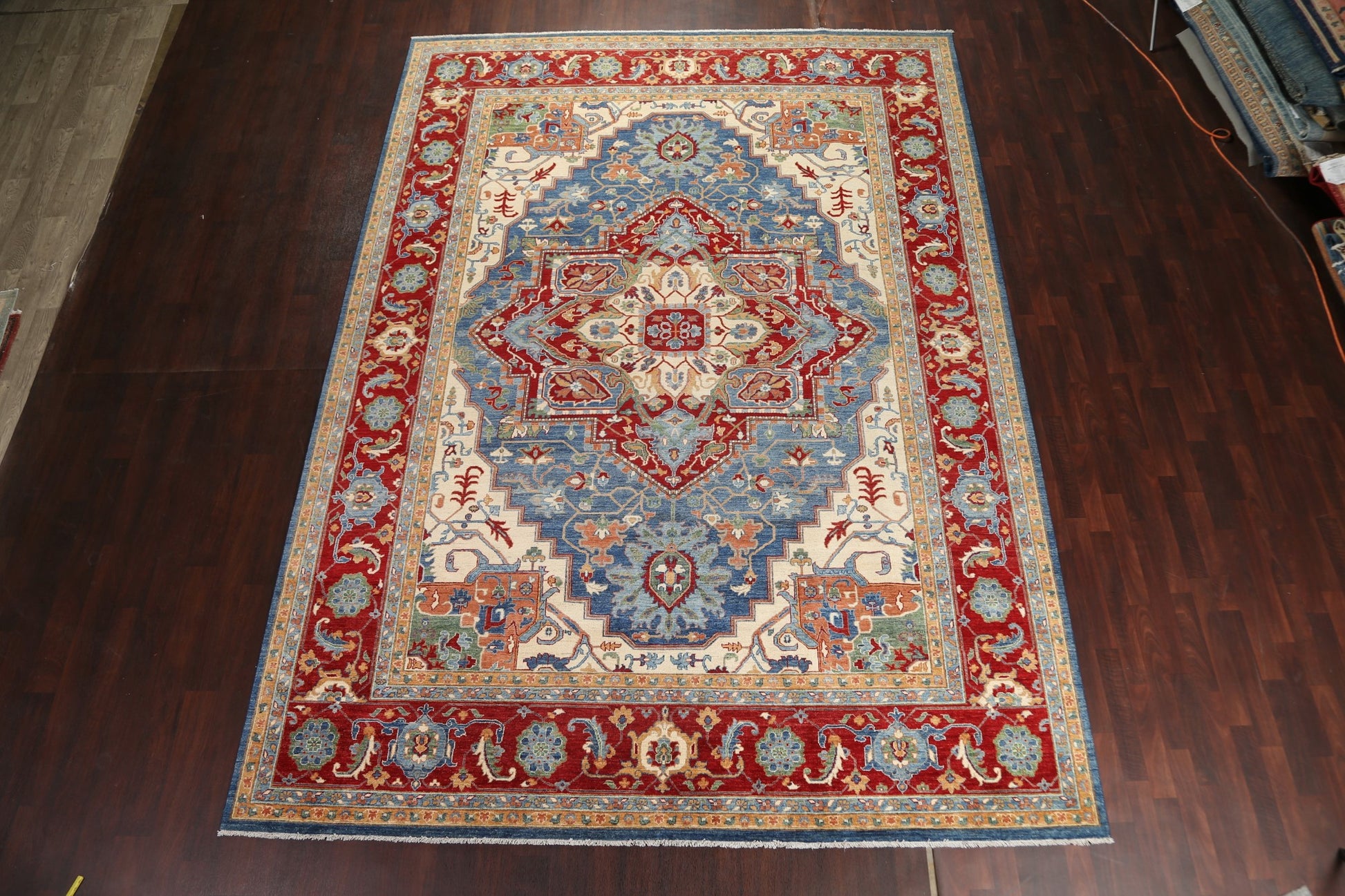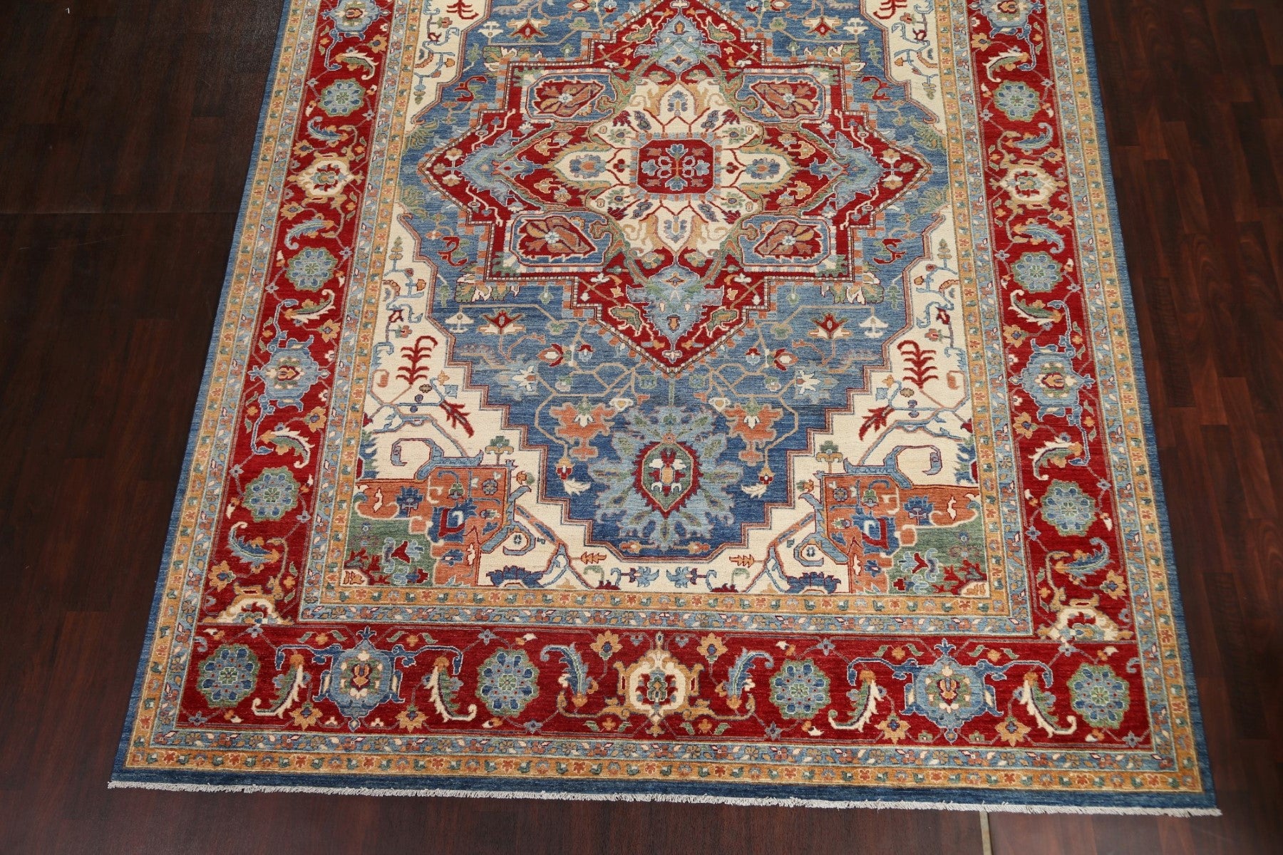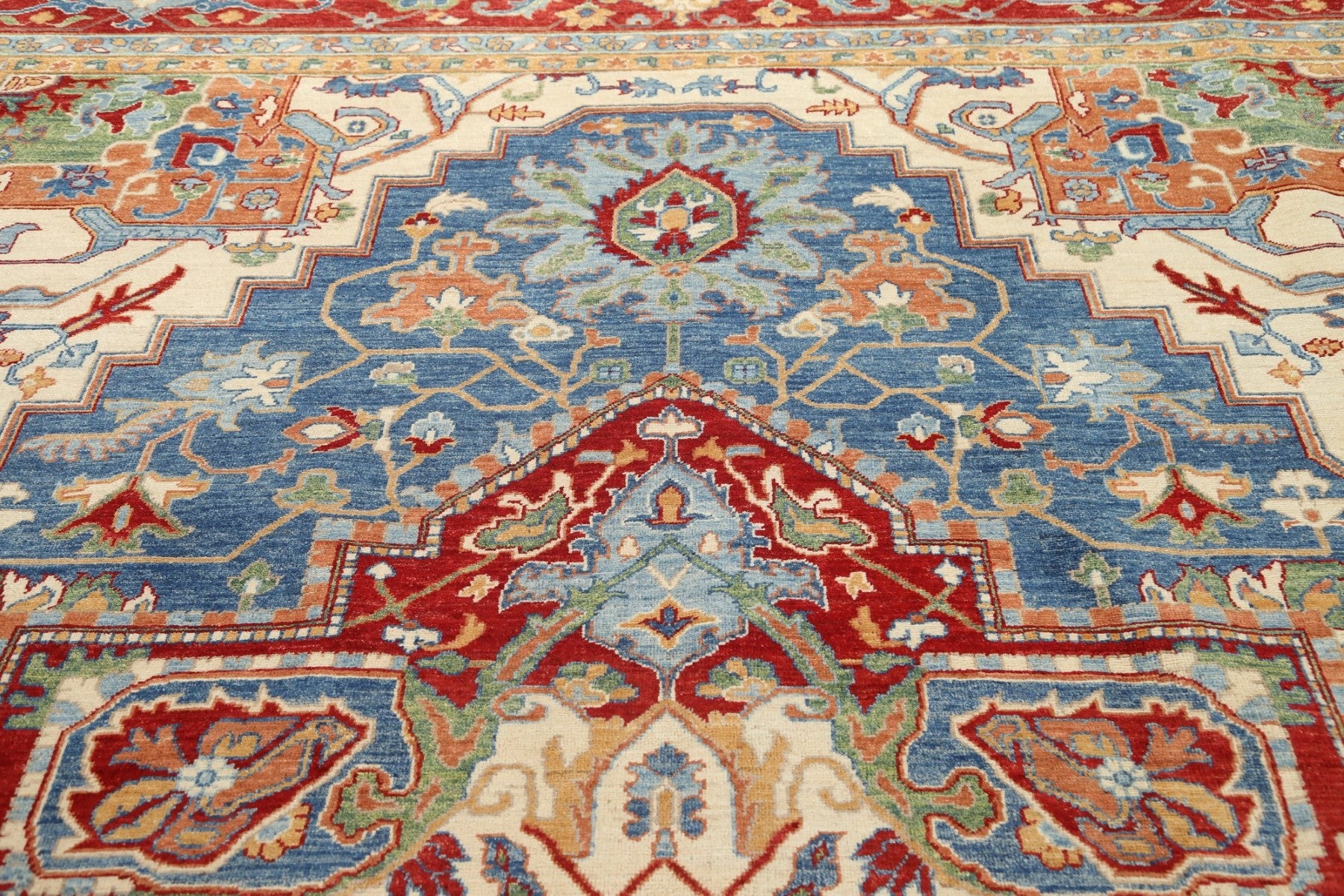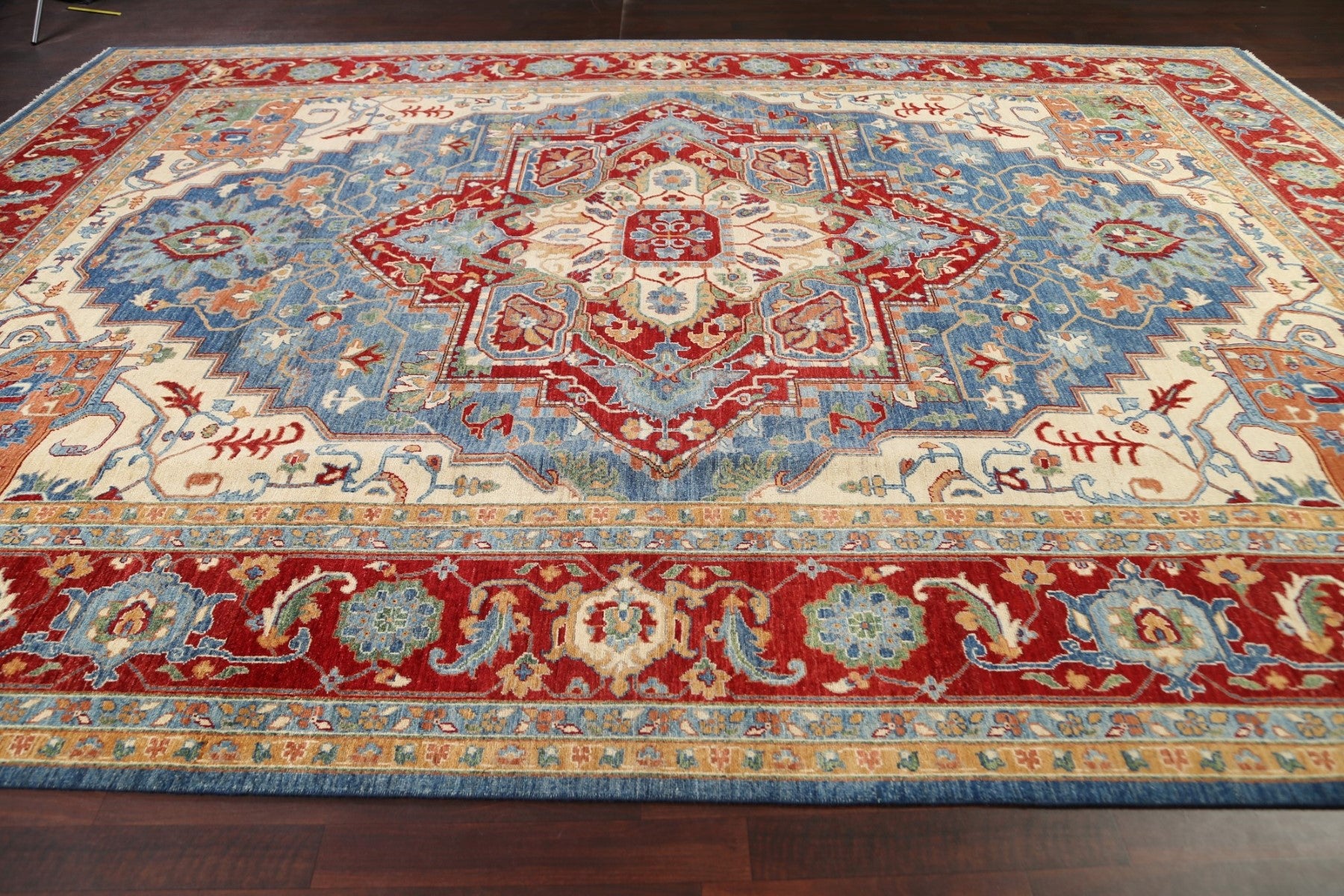 A Beautiful Genuine Pakistan Heriz (serapi) rug is Hand Knotted by skillful weavers in Pakistan with 100% Wool Material. This rug is in New, First Quality condition. dimensions are 13' 8'' X 9' 9'' in foot and 417 X 297 in centimeter. the primary color is Navy Blue & Blues.