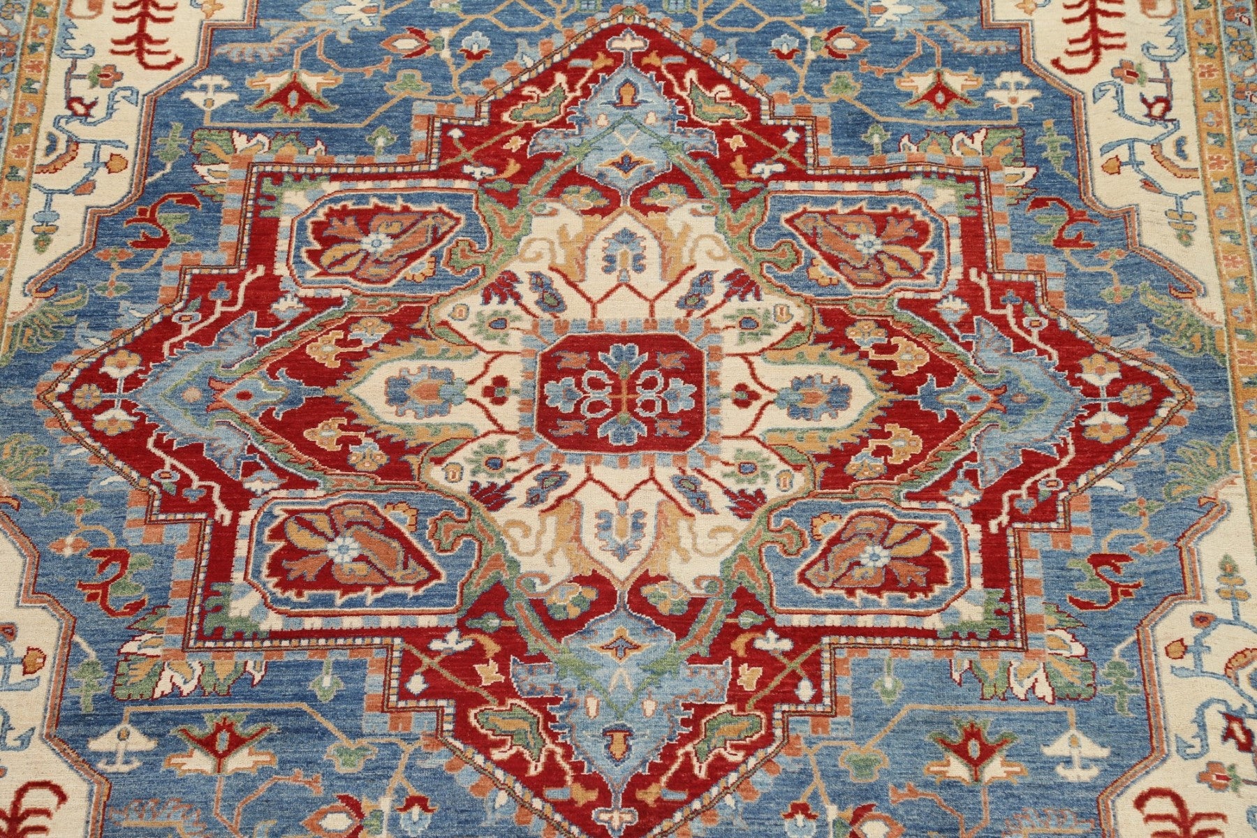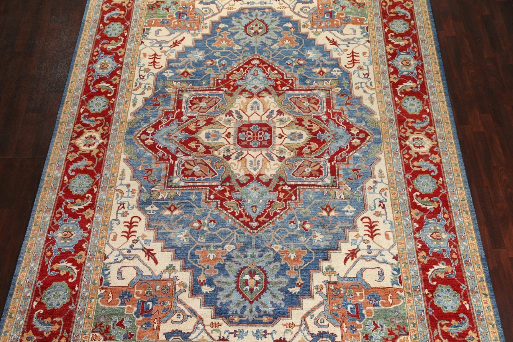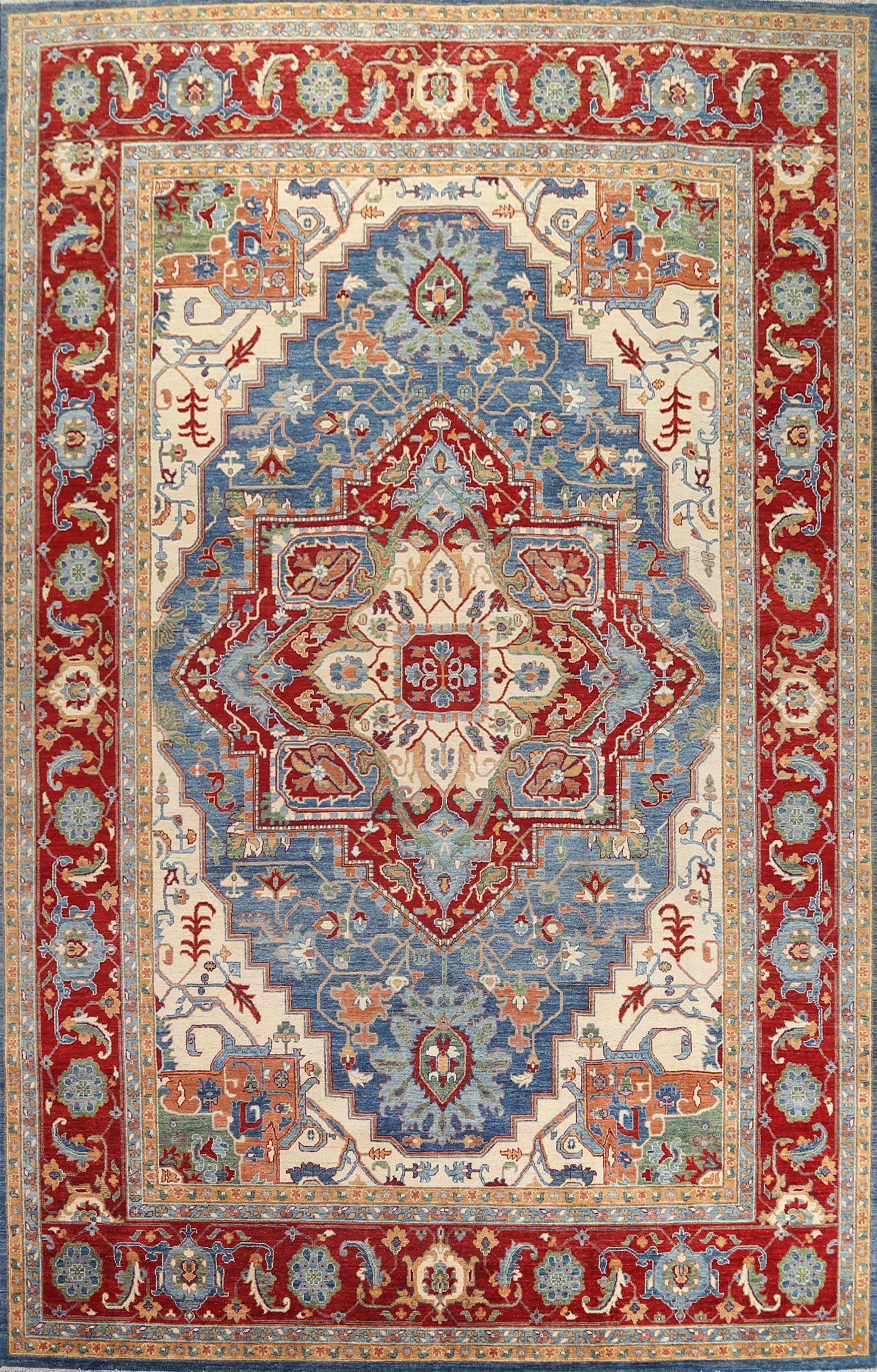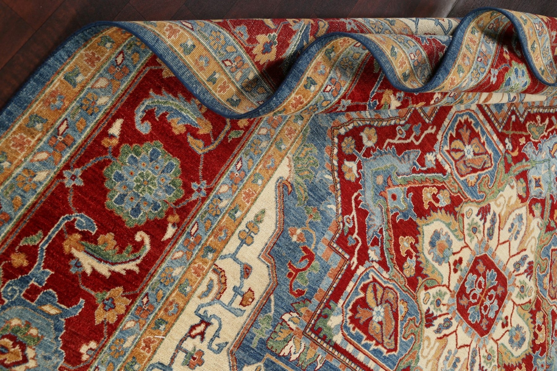 A Beautiful Genuine Pakistan Heriz (serapi) rug is Hand Knotted by skillful weavers in Pakistan with 100% Wool Material. This rug is in New, First Quality condition. dimensions are 13' 8'' X 9' 9'' in foot and 417 X 297 in centimeter. the primary color is Navy Blue & Blues.