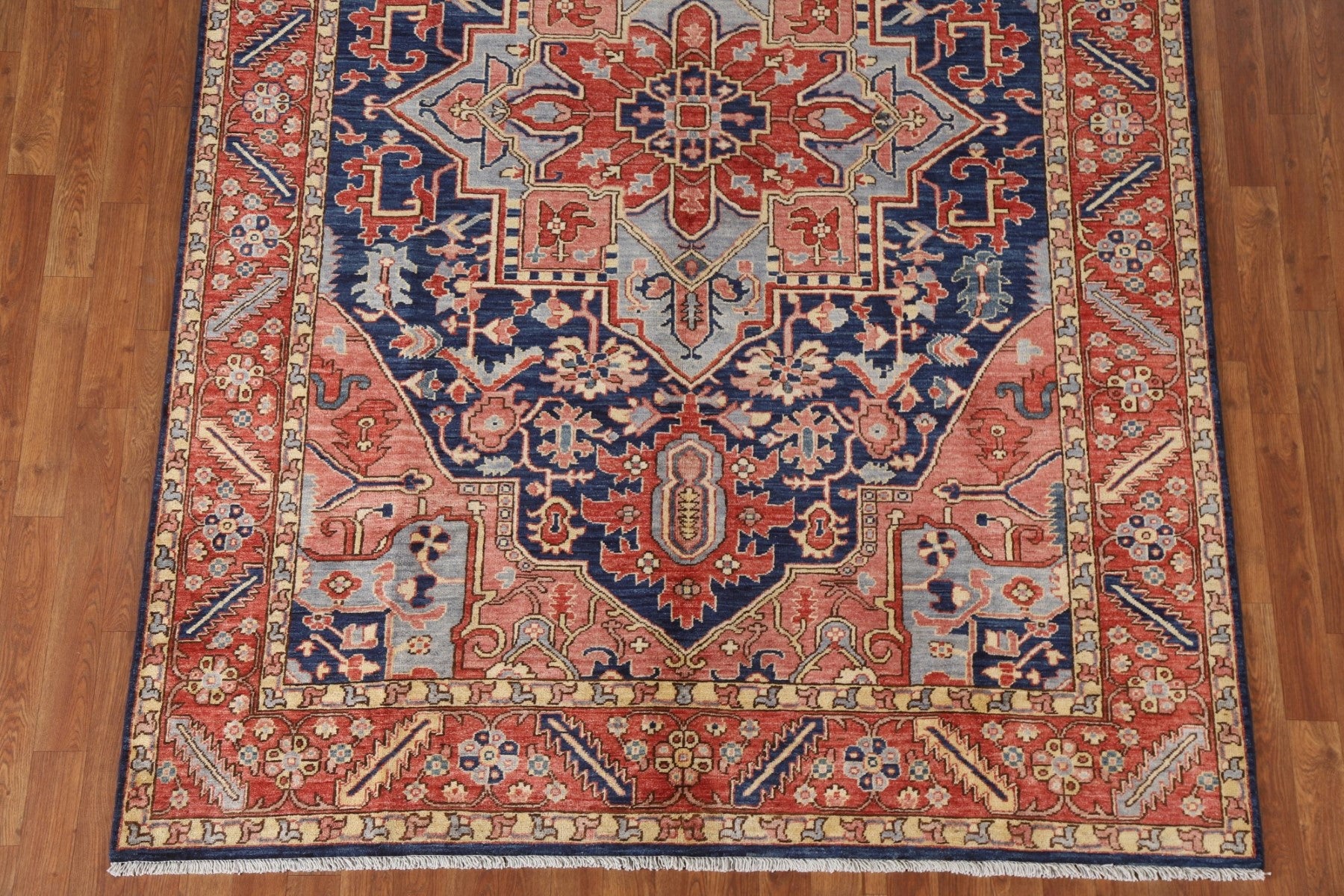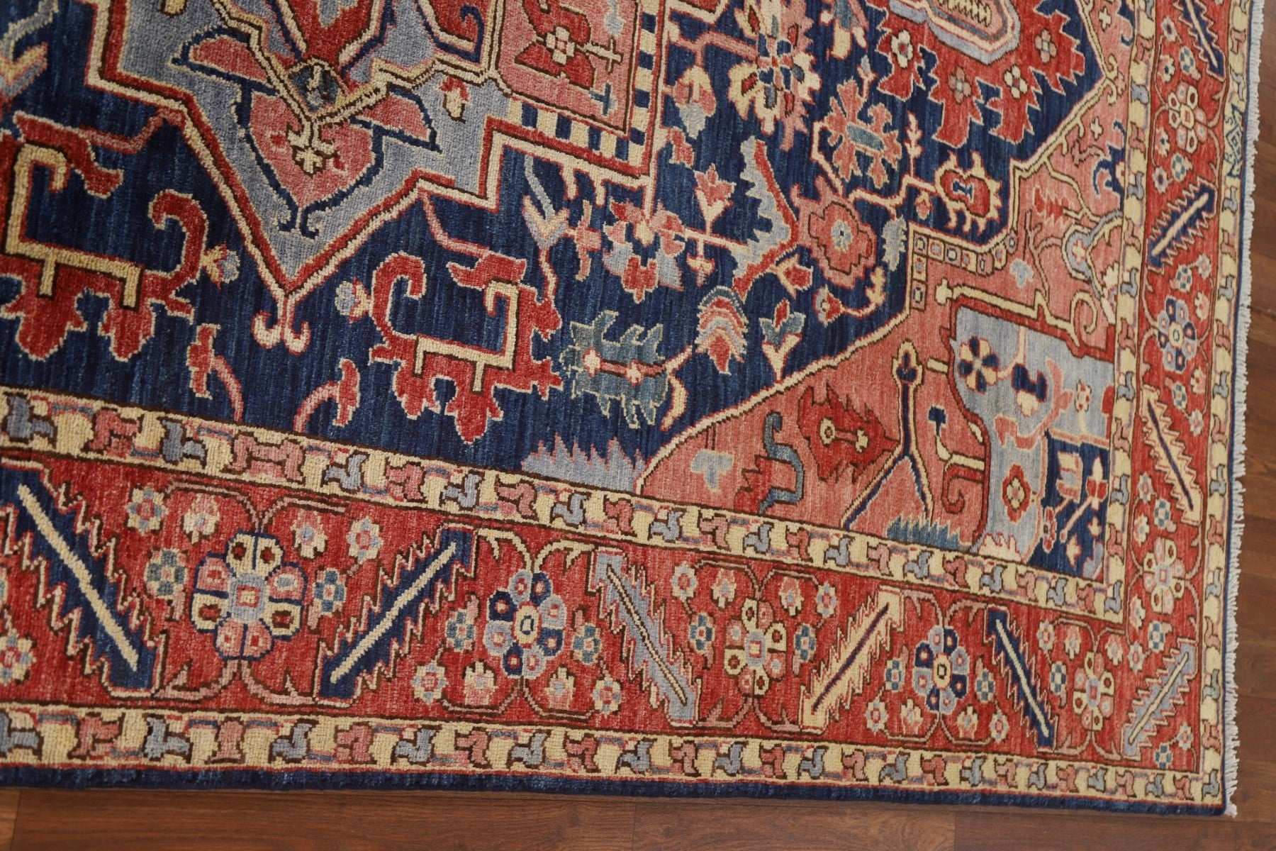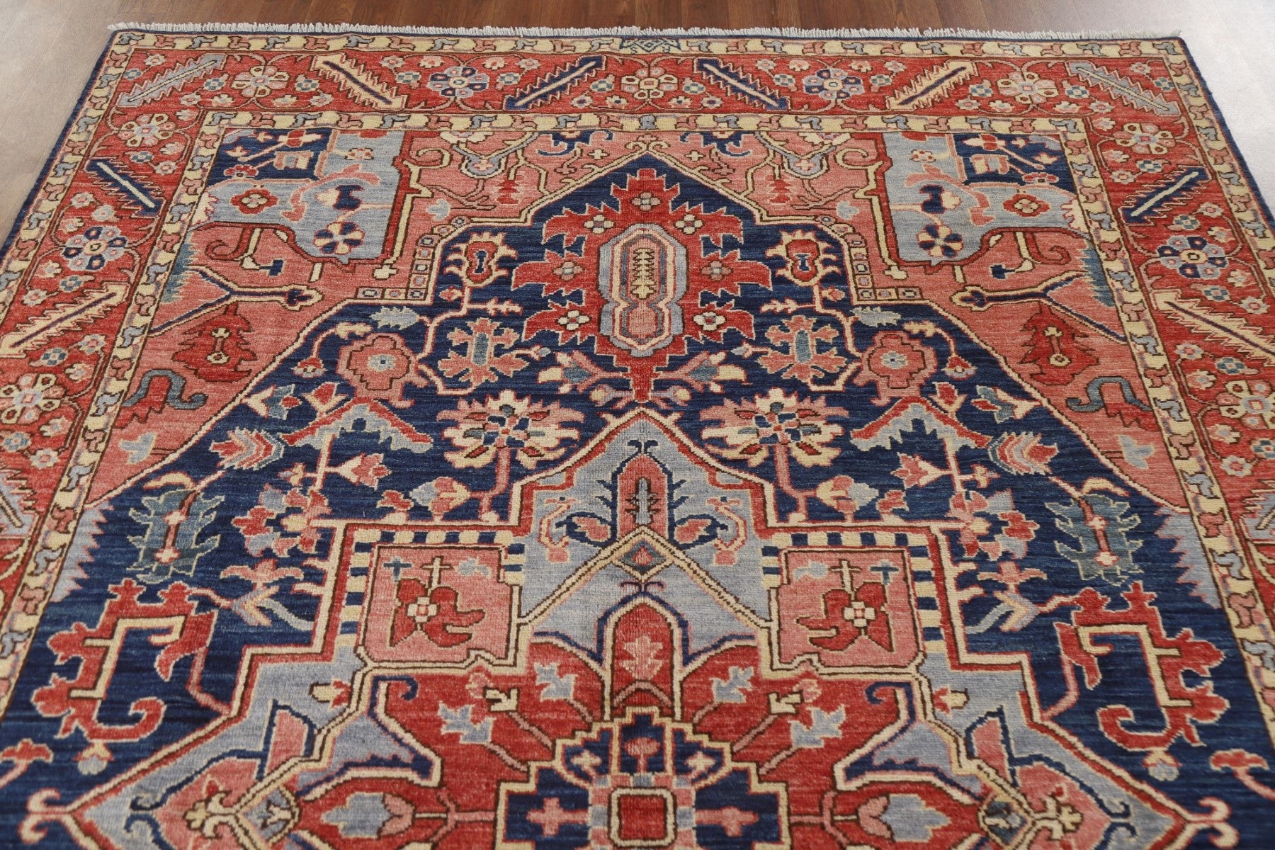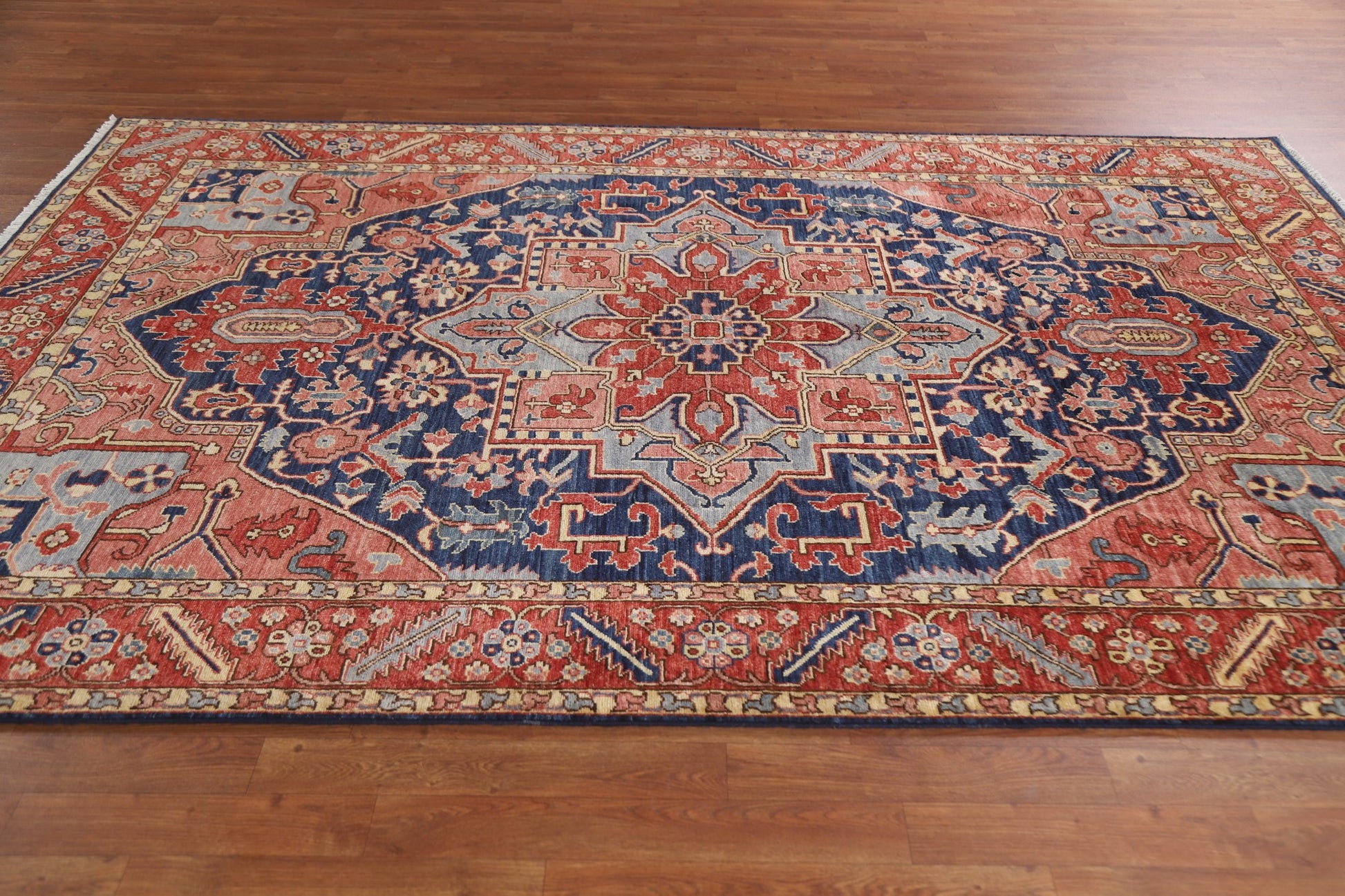 A Beautiful Genuine Pakistan Heriz (serapi) rug is Hand Knotted by skillful weavers in Pakistan with 100% Wool Material. This rug is in New, First Quality condition. dimensions are 9' 0'' X 6' 1'' in foot and 274 X 185 in centimeter. the primary color is Navy Blue & Blues.