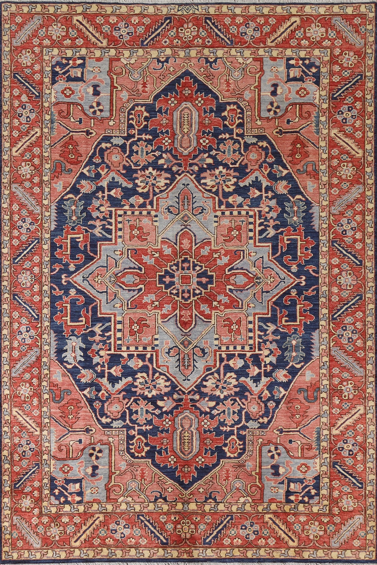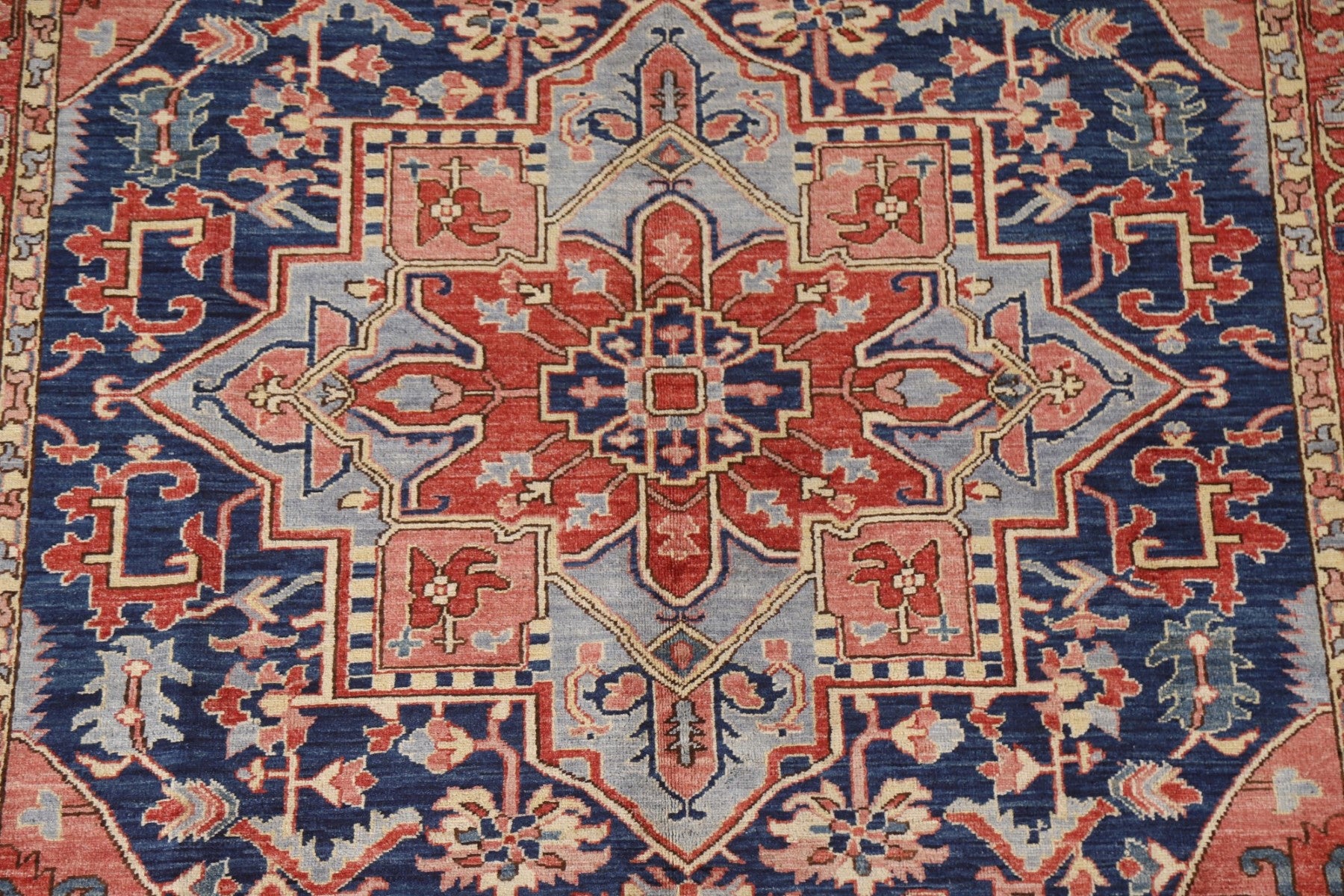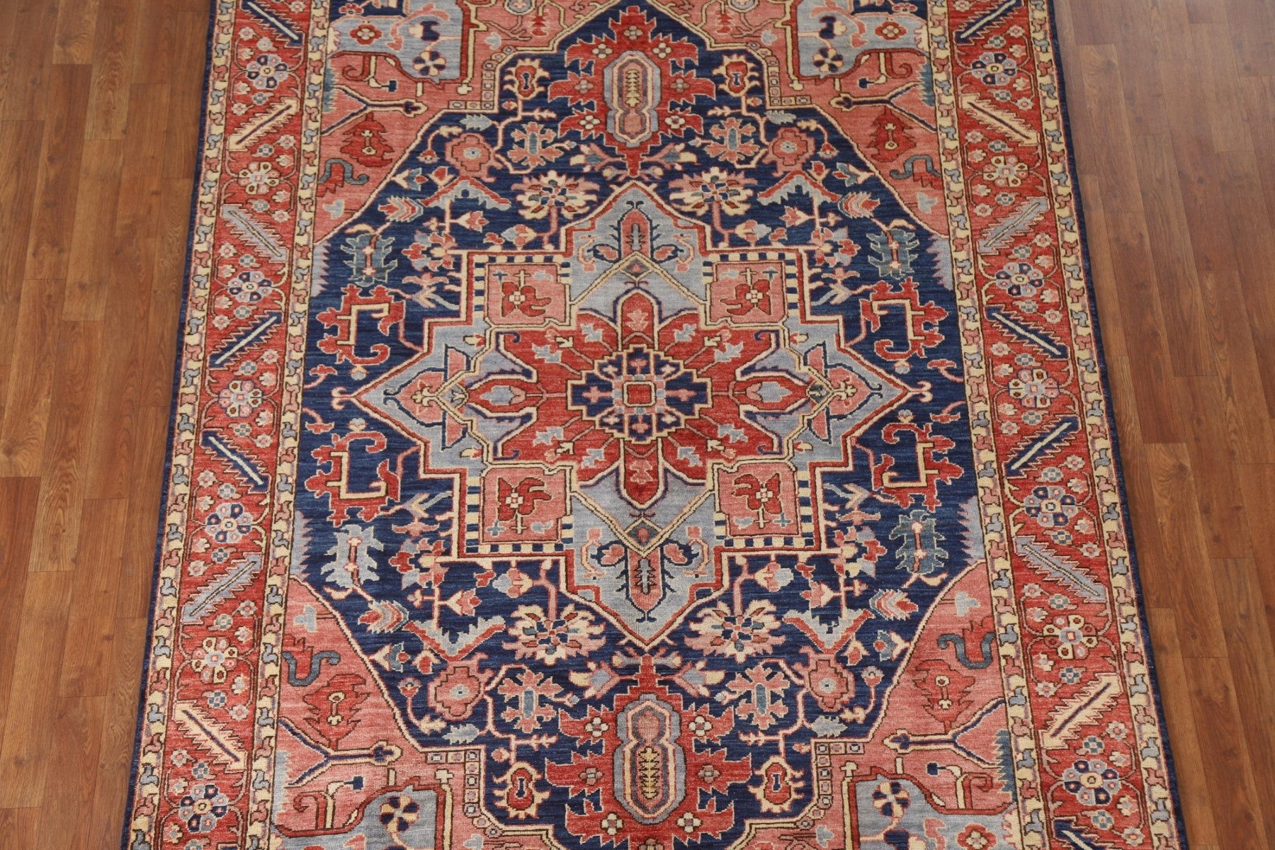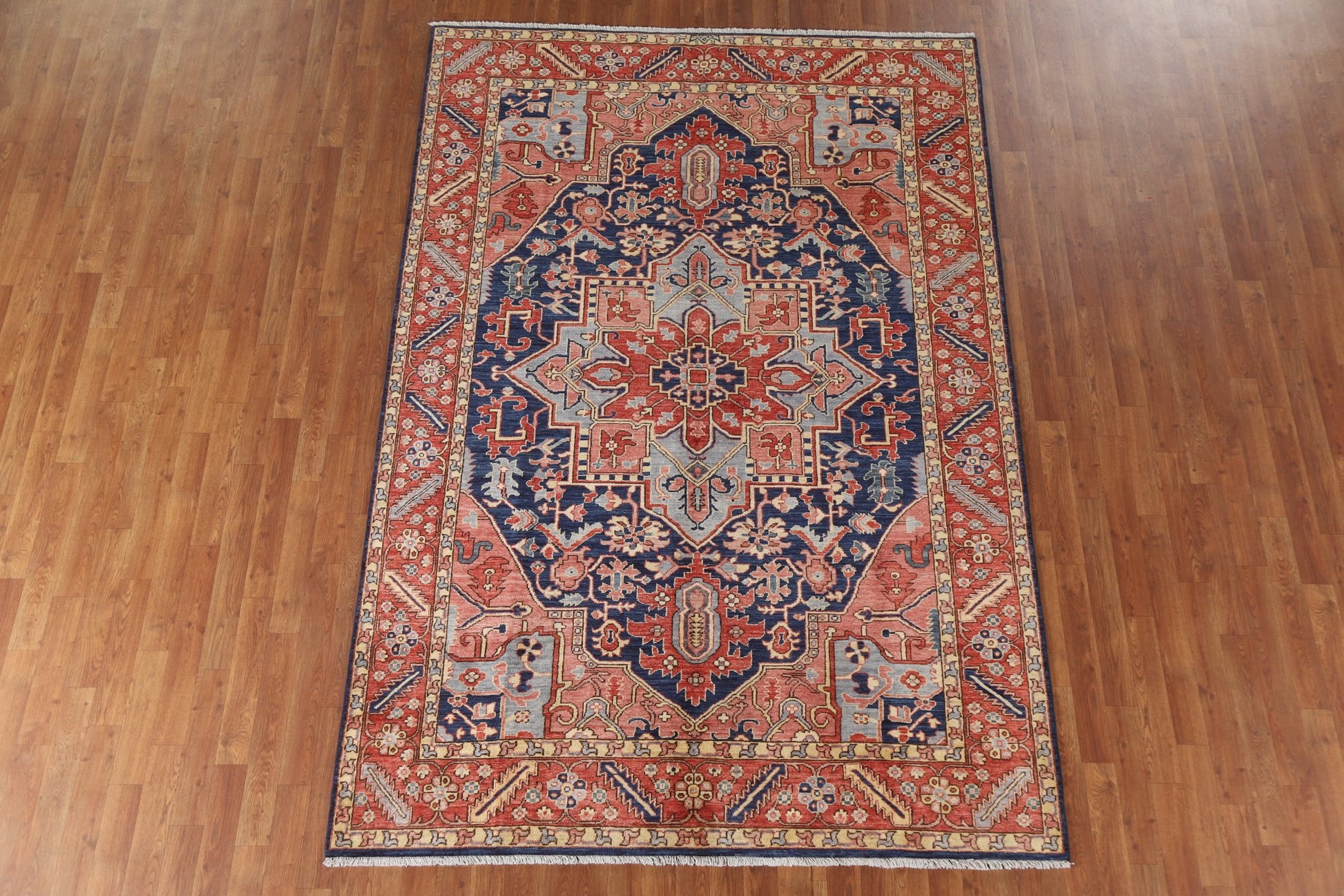 A Beautiful Genuine Pakistan Heriz (serapi) rug is Hand Knotted by skillful weavers in Pakistan with 100% Wool Material. This rug is in New, First Quality condition. dimensions are 9' 0'' X 6' 1'' in foot and 274 X 185 in centimeter. the primary color is Navy Blue & Blues.
