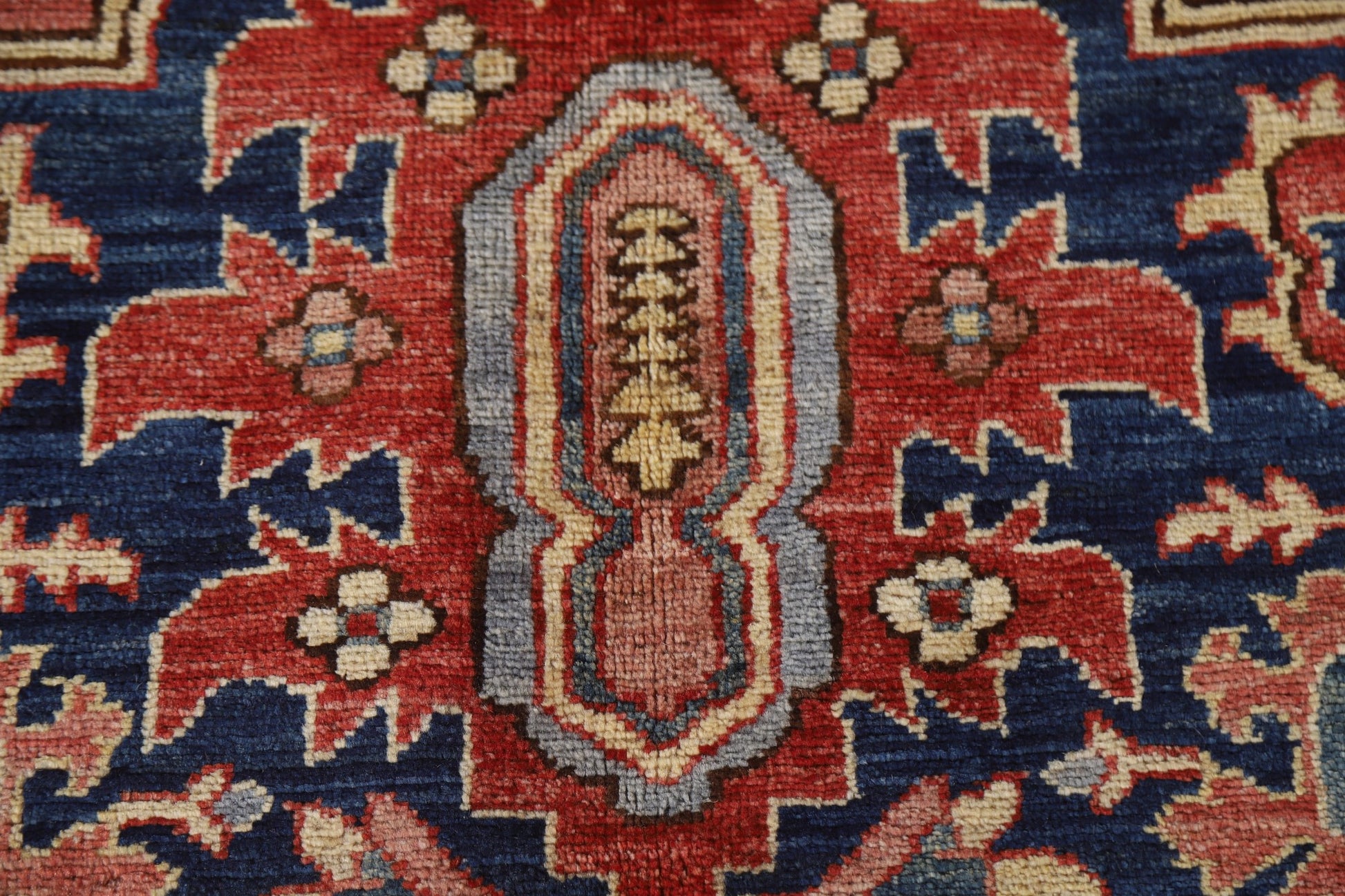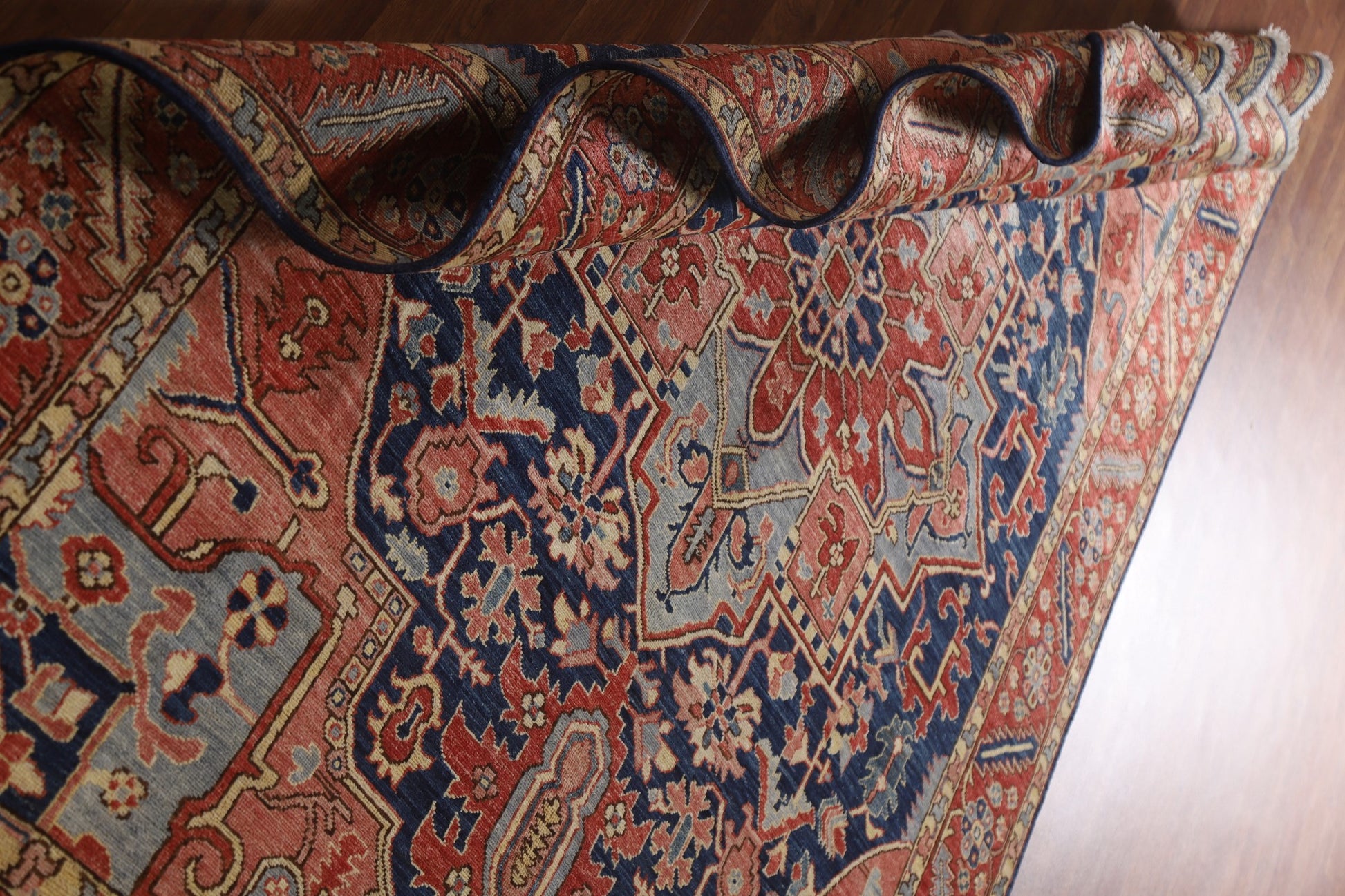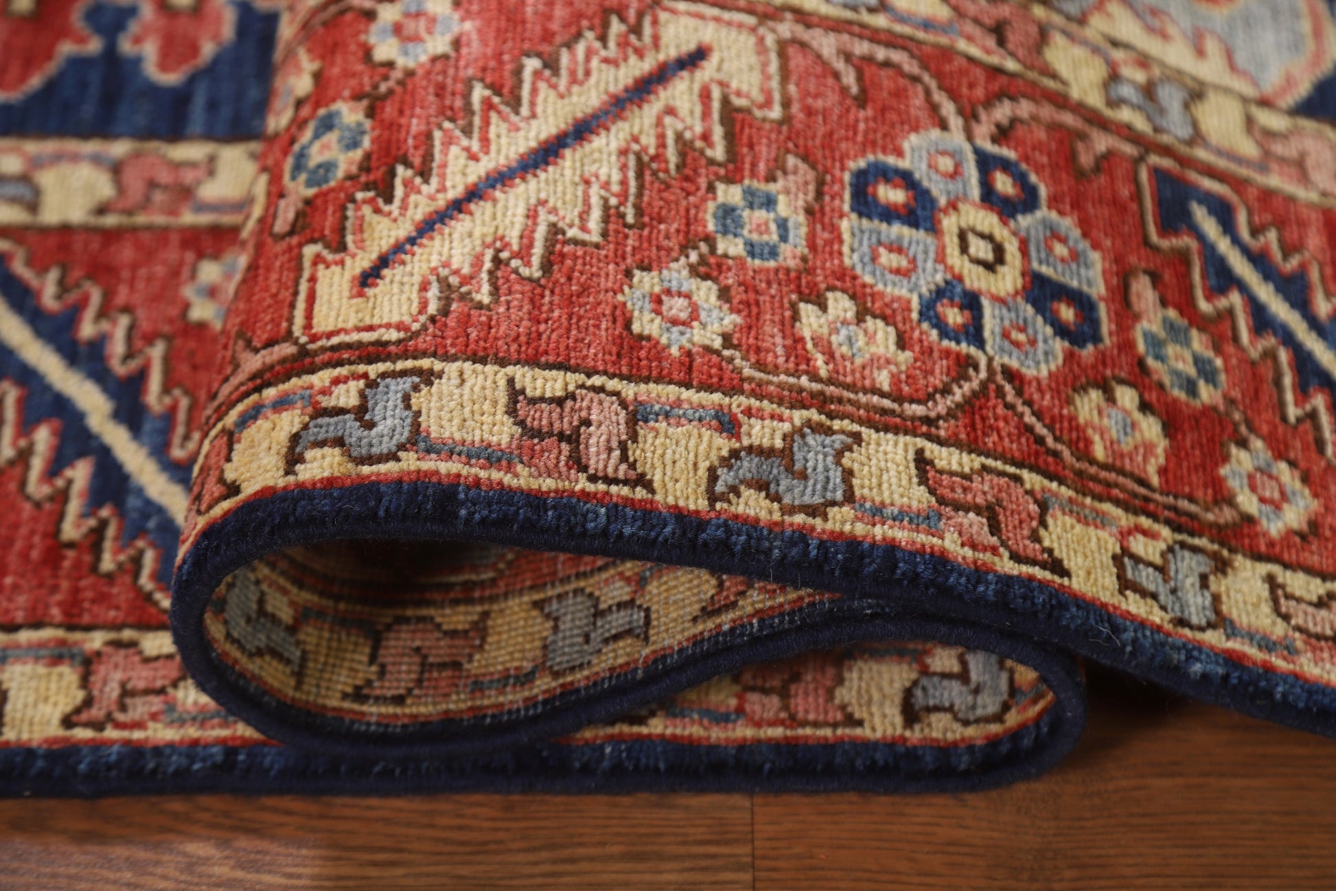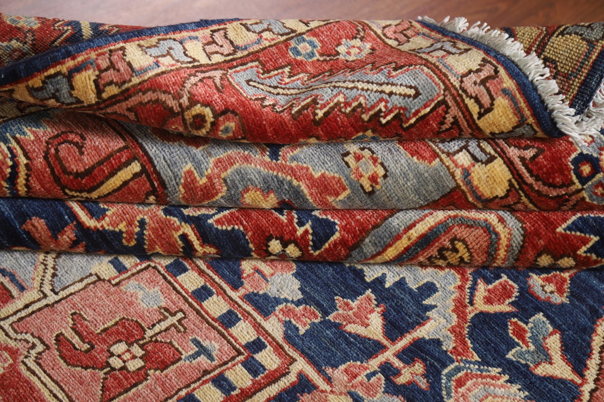 A Beautiful Genuine Pakistan Heriz (serapi) rug is Hand Knotted by skillful weavers in Pakistan with 100% Wool Material. This rug is in New, First Quality condition. dimensions are 9' 0'' X 6' 1'' in foot and 274 X 185 in centimeter. the primary color is Navy Blue & Blues.