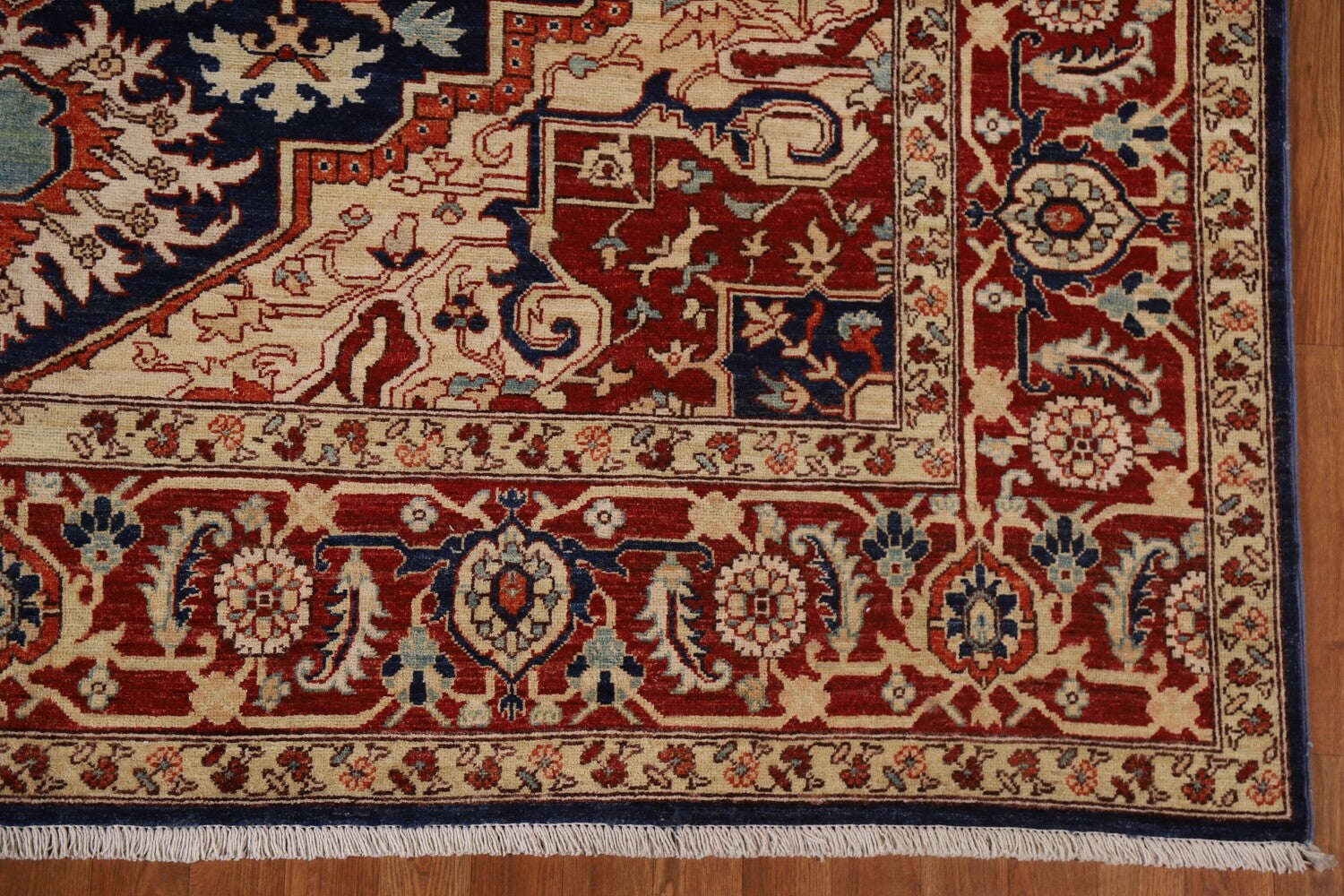 A Beautiful Genuine Pakistan Heriz (serapi) rug is Hand Knotted by skillful weavers in Pakistan with 100% Wool Material. This rug is in New, First Quality condition. dimensions are 9' 11'' X 7' 11'' in foot and 302 X 241 in centimeter. the primary color is Navy Blue & Blues.