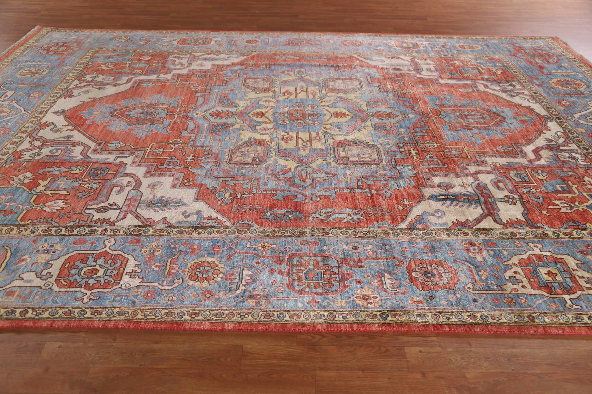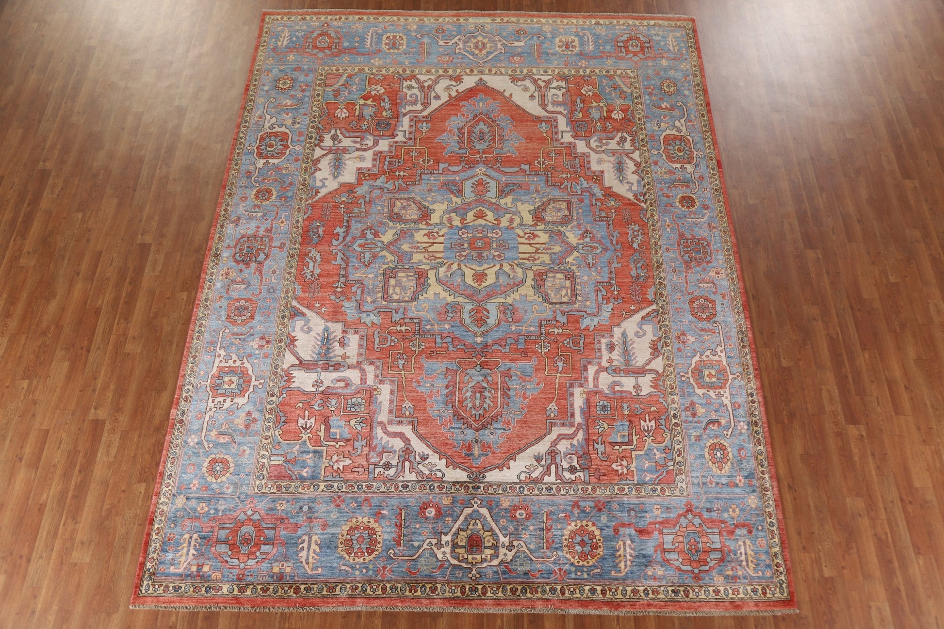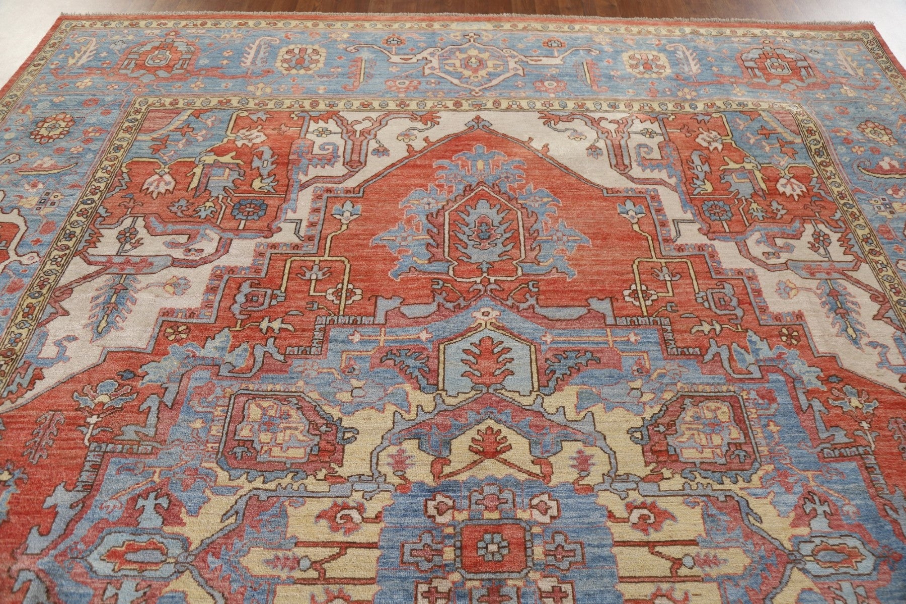 A Beautiful Genuine Pakistan Heriz (serapi) rug is Hand Knotted by skillful weavers in Pakistan with 100% Wool Material. This rug is in New, First Quality condition. dimensions are 11' 11'' X 9' 2'' in foot and 363 X 279 in centimeter. the primary color is Red.