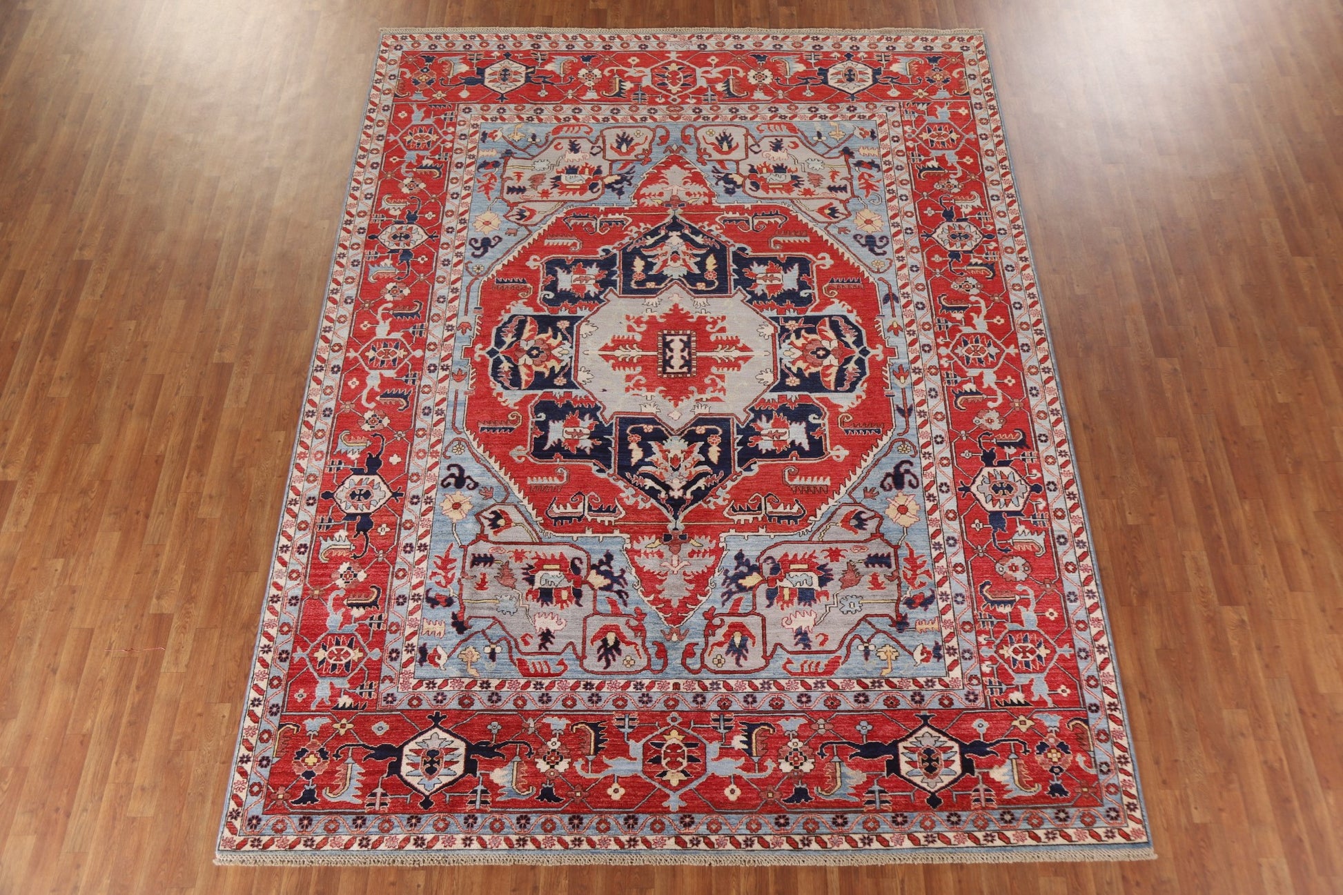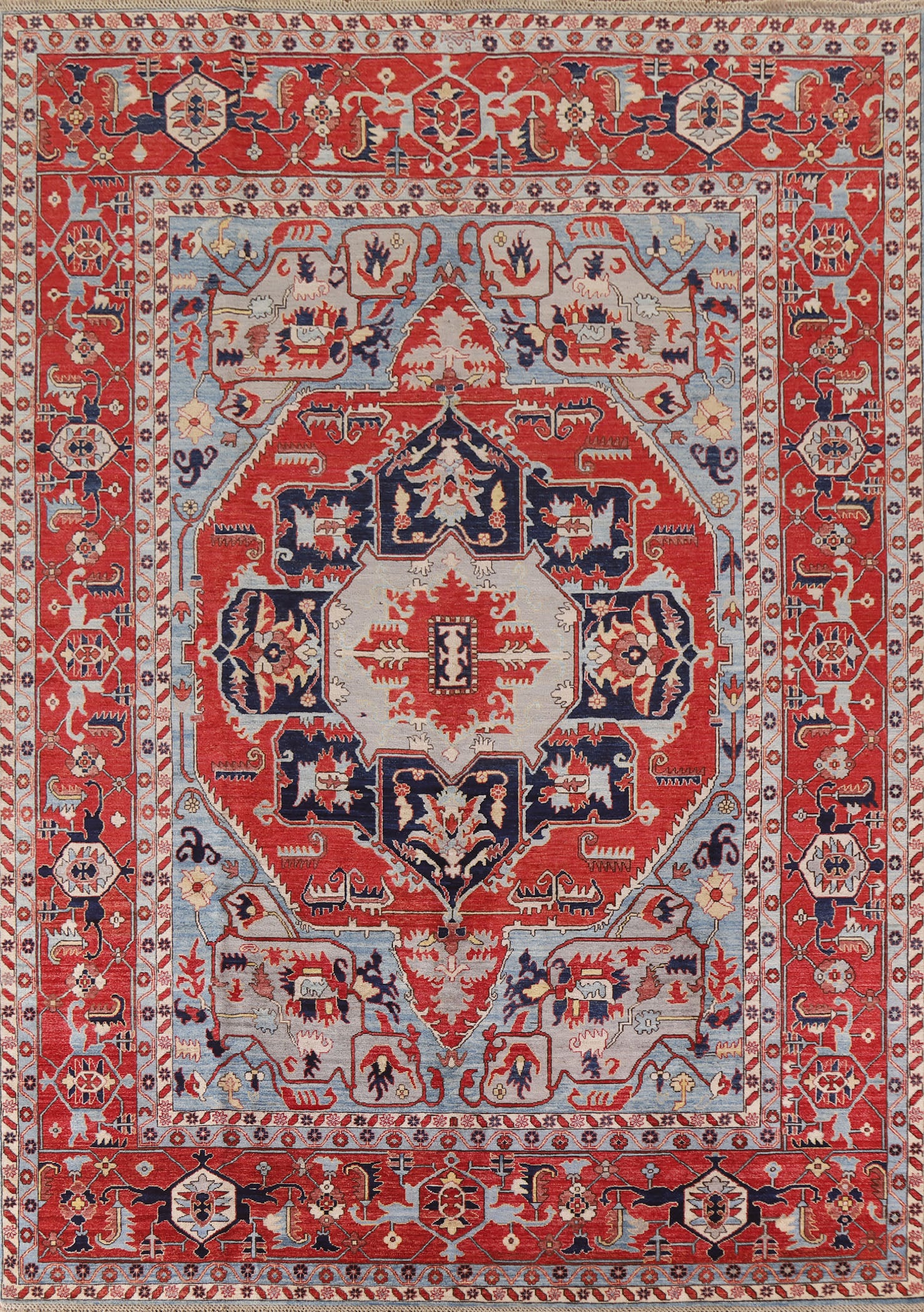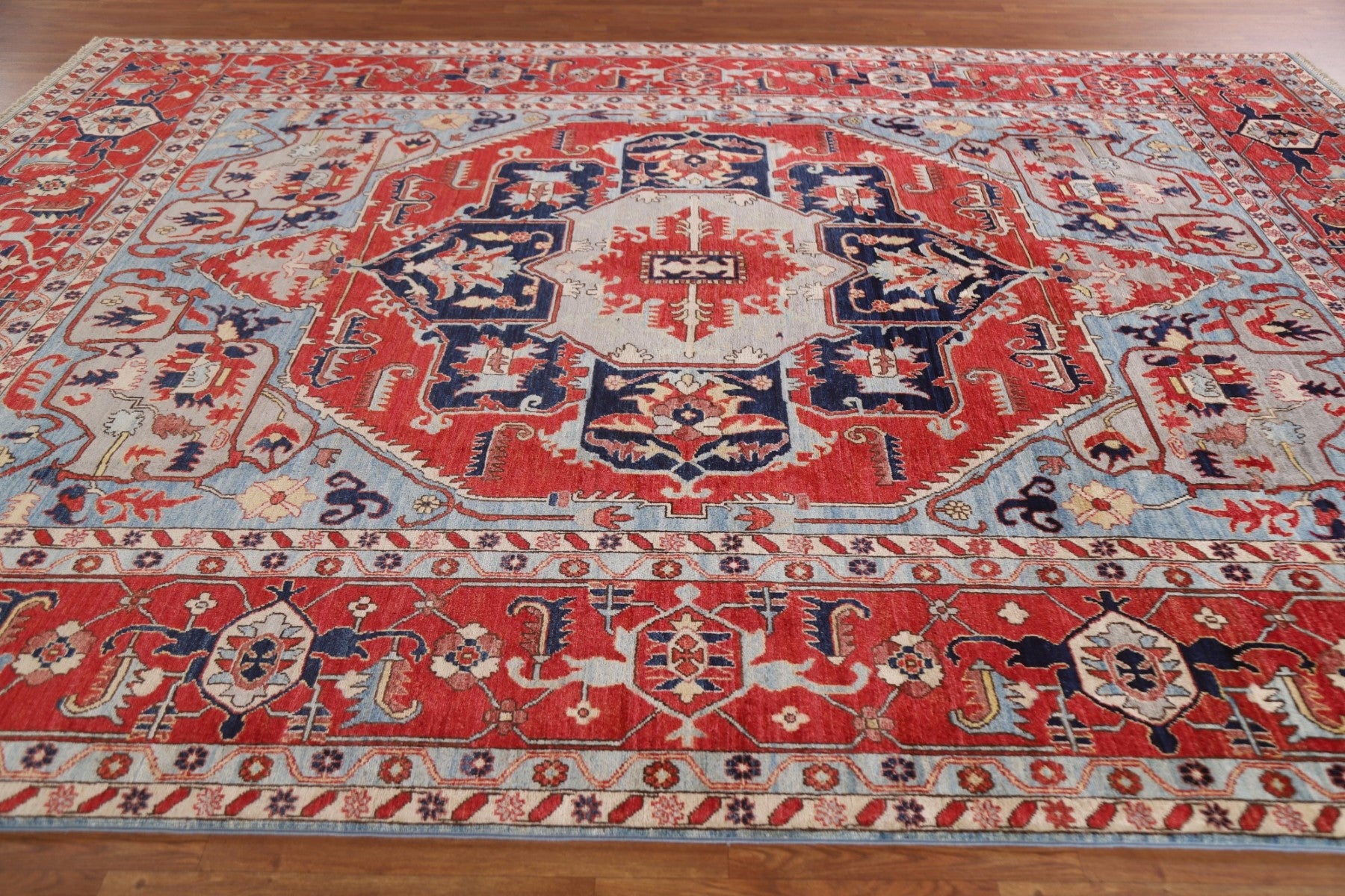 A Beautiful Genuine Pakistan Heriz (serapi) rug is Hand Knotted by skillful weavers in Pakistan with 100% Wool Material. This rug is in New, First Quality condition. dimensions are 11' 9'' X 9' 1'' in foot and 358 X 277 in centimeter. the primary color is Red.