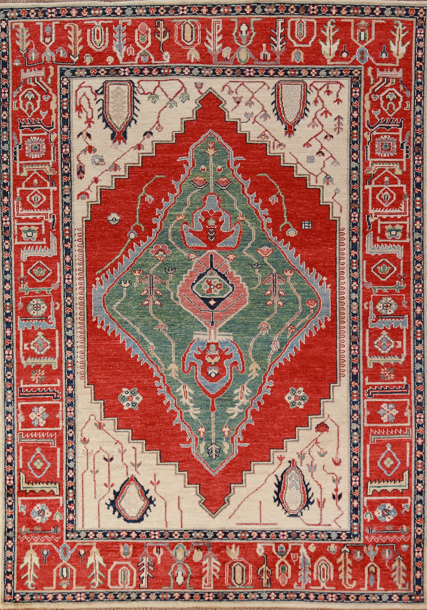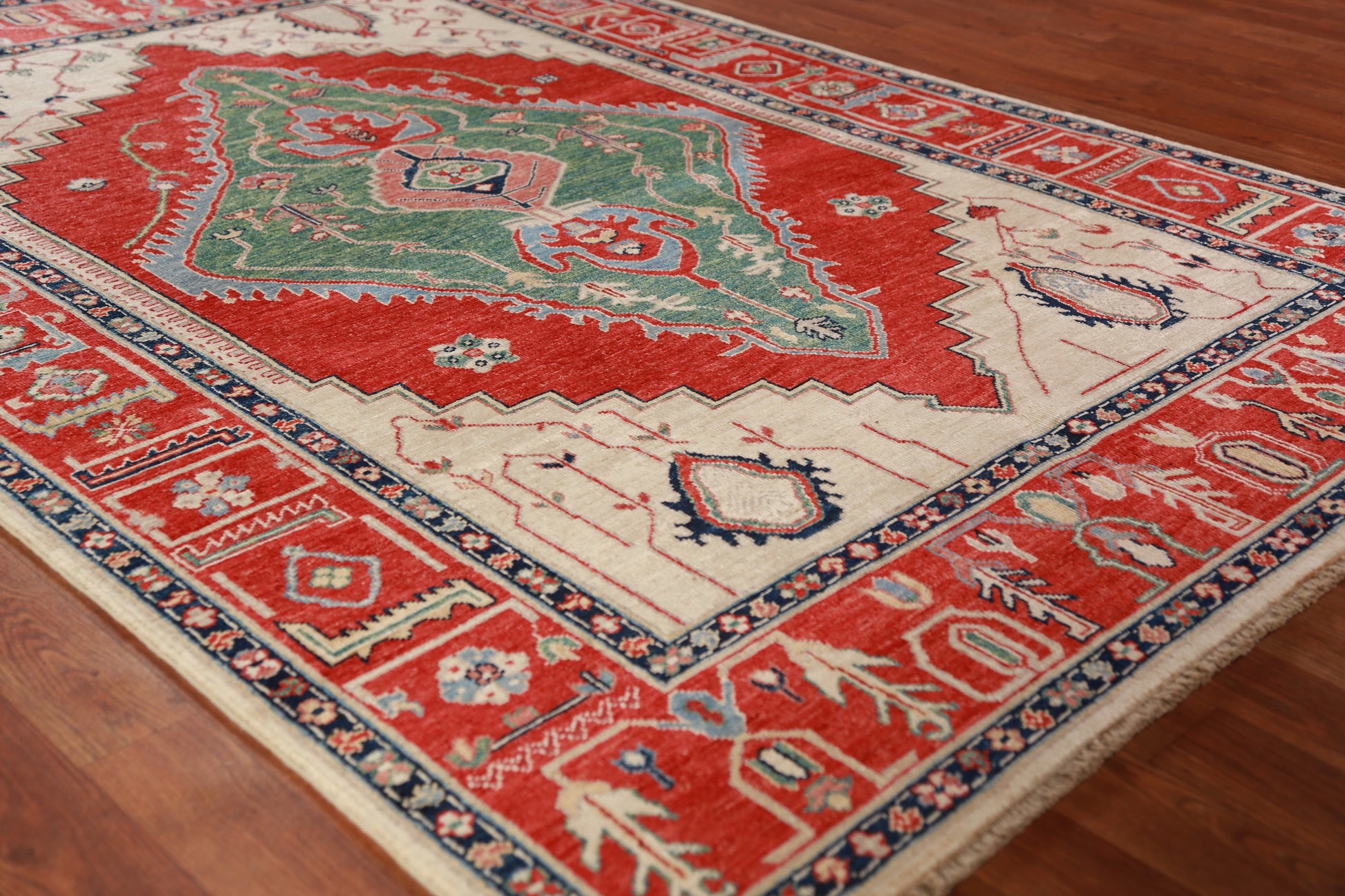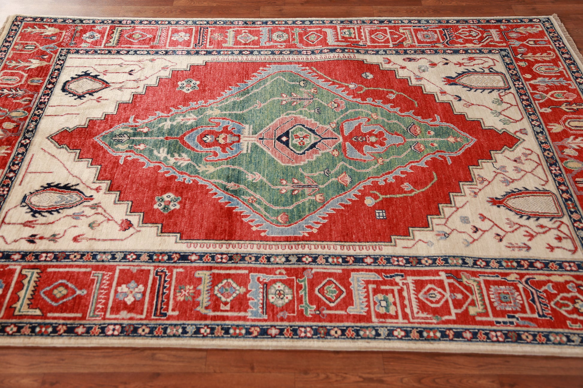 A Beautiful Genuine Pakistan Heriz (serapi) rug is Hand Knotted by skillful weavers in Pakistan with 100% Wool Material. This rug is in New, First Quality condition. dimensions are 6' 10'' X 4' 10'' in foot and 208 X 147 in centimeter. the primary color is Red.