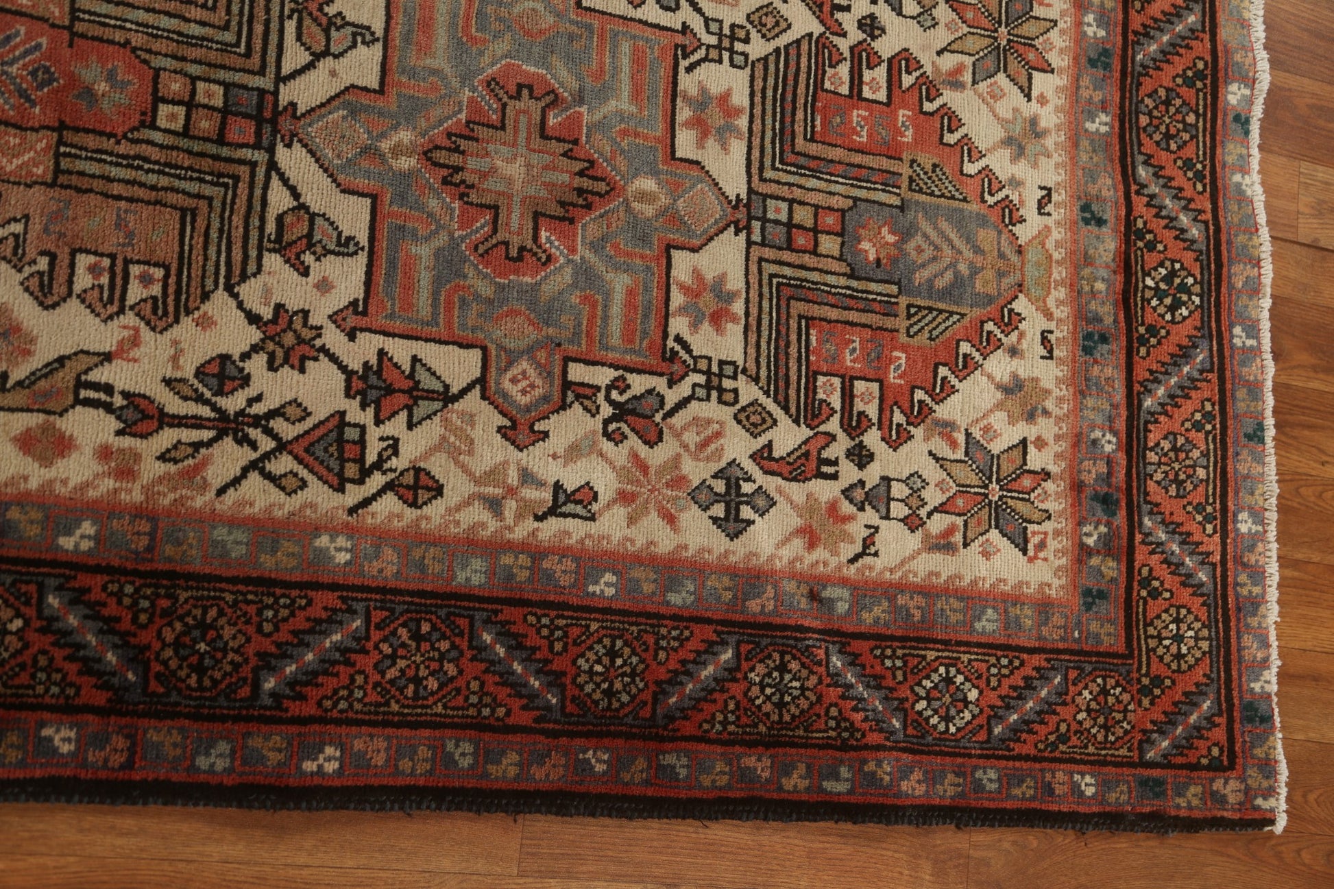 A Beautiful Genuine Persia ( Persia ) Heriz (serapi) rug is Hand Knotted by skillful weavers in Persia ( Persia ) with 100% Wool Material. This rug is in Very Good condition. dimensions are 14' 3'' X 3' 3'' in foot and 434 X 99 in centimeter. the primary color is Beige & Ivories.