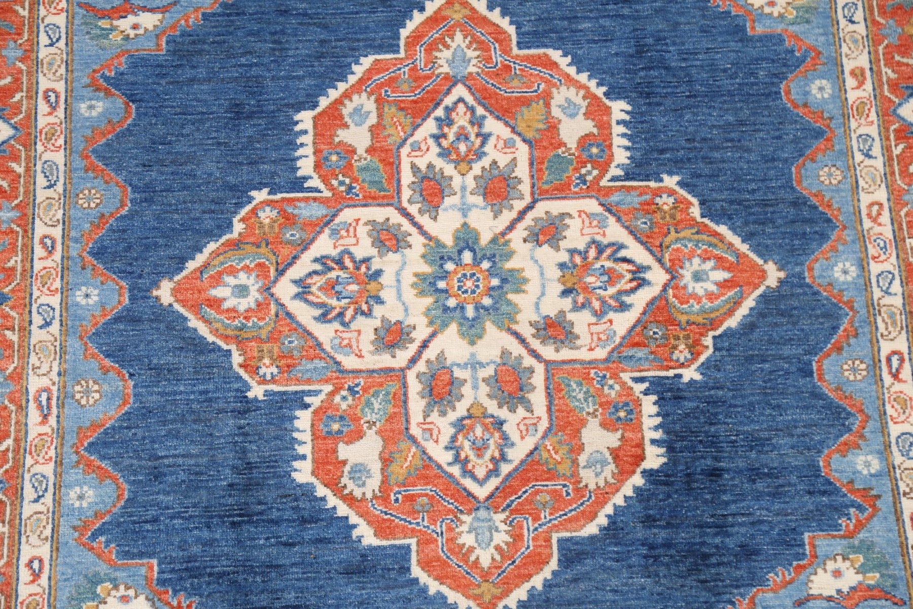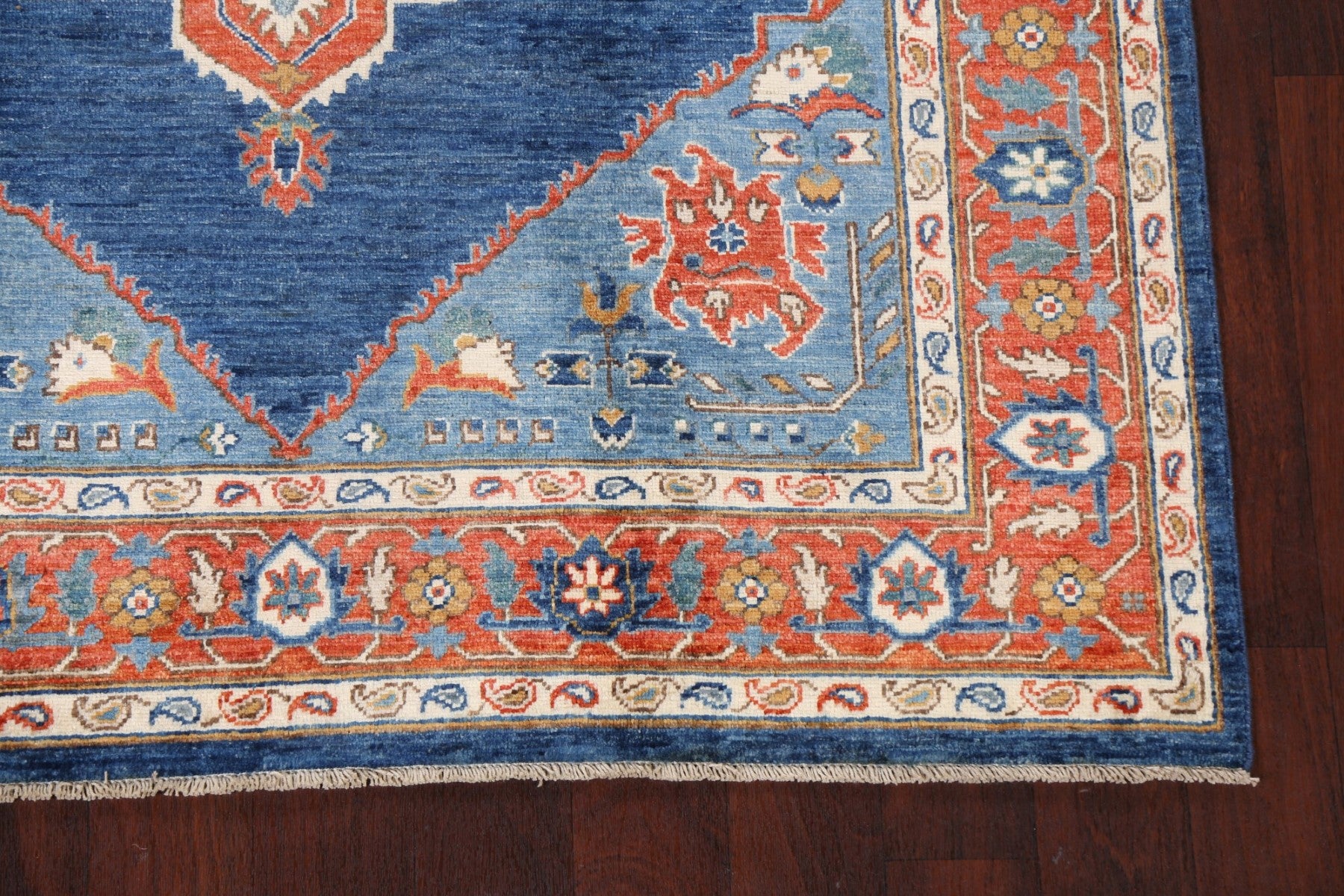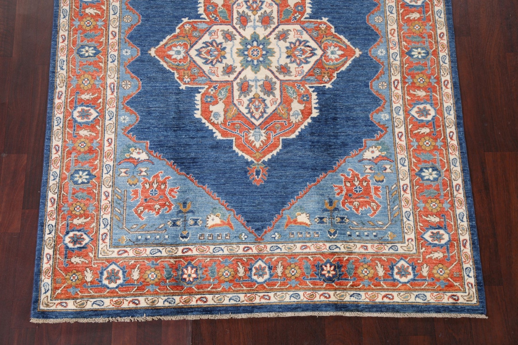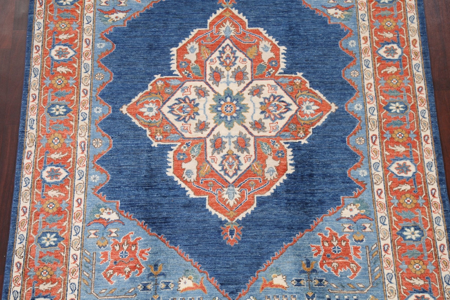A Beautiful Genuine Pakistan Heriz (serapi) rug is Hand Knotted by skillful weavers in Pakistan with 100% Wool Material. This rug is in New, First Quality condition. dimensions are 6' 9'' X 5' 2'' in foot and 206 X 157 in centimeter. the primary color is Navy Blue & Blues.