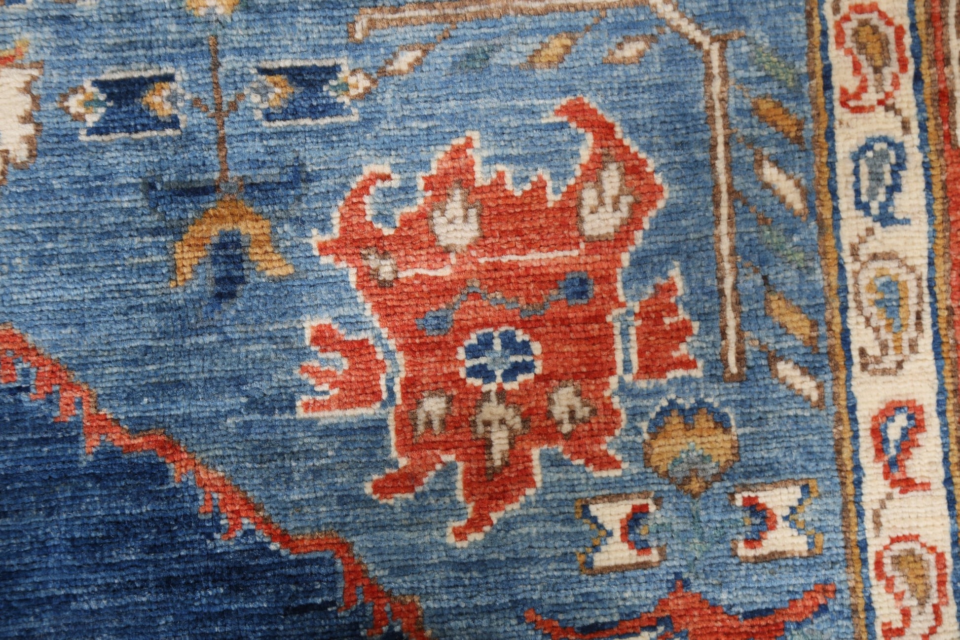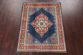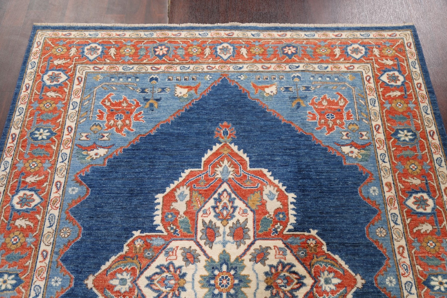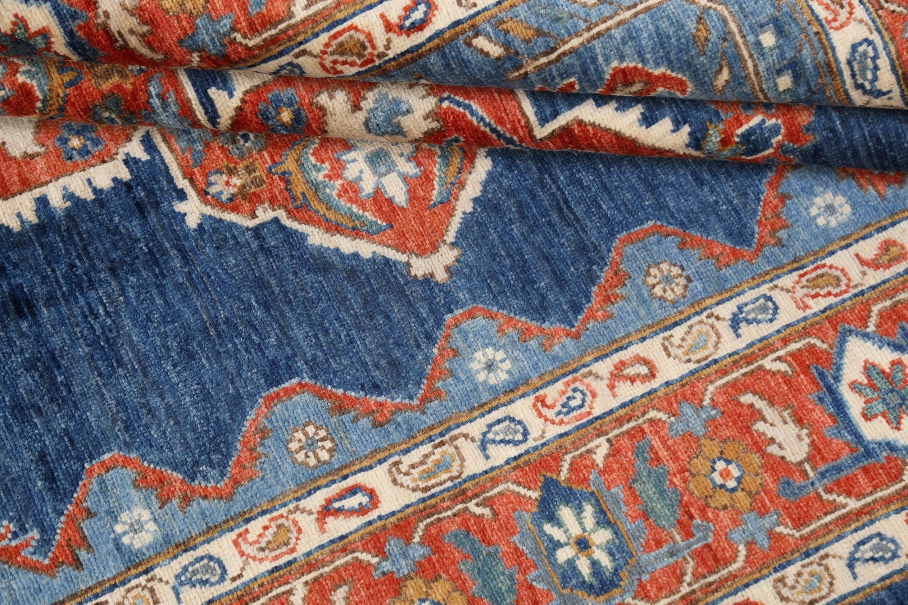 A Beautiful Genuine Pakistan Heriz (serapi) rug is Hand Knotted by skillful weavers in Pakistan with 100% Wool Material. This rug is in New, First Quality condition. dimensions are 6' 9'' X 5' 2'' in foot and 206 X 157 in centimeter. the primary color is Navy Blue & Blues.