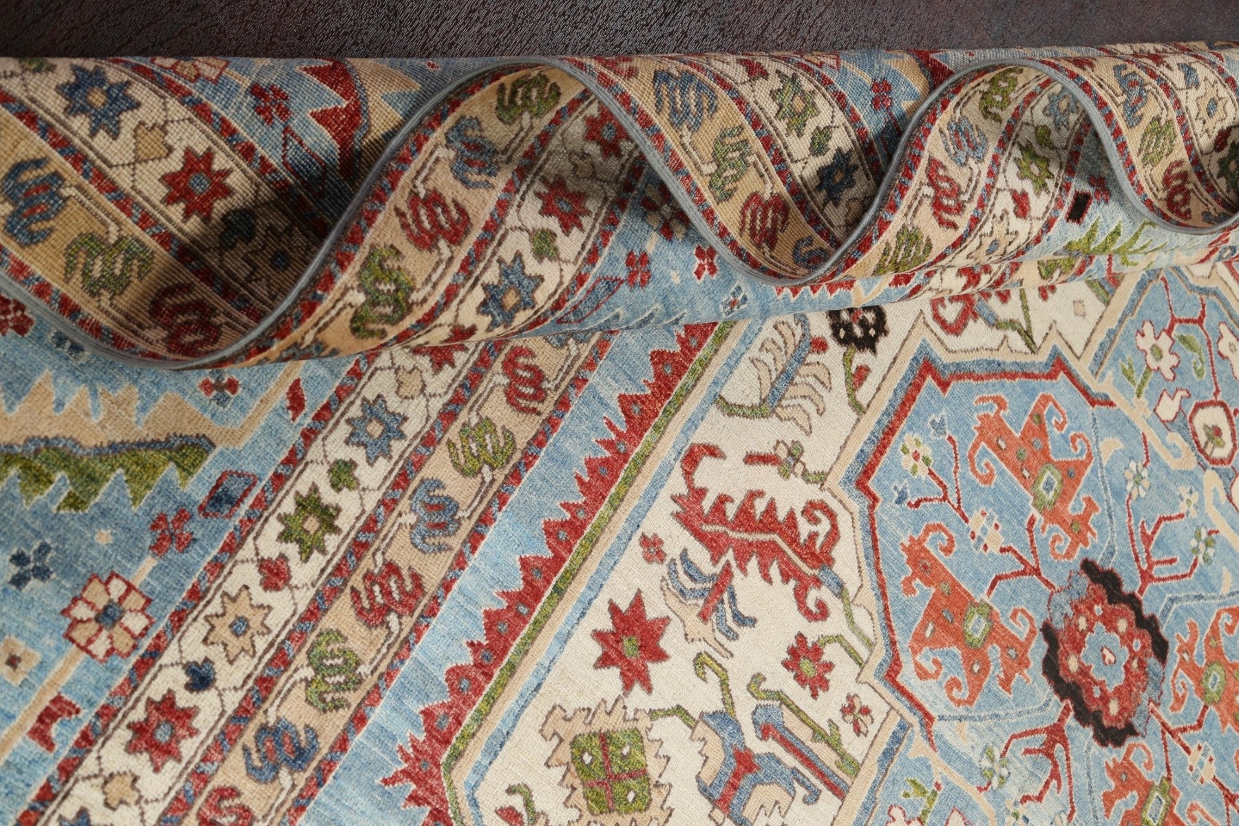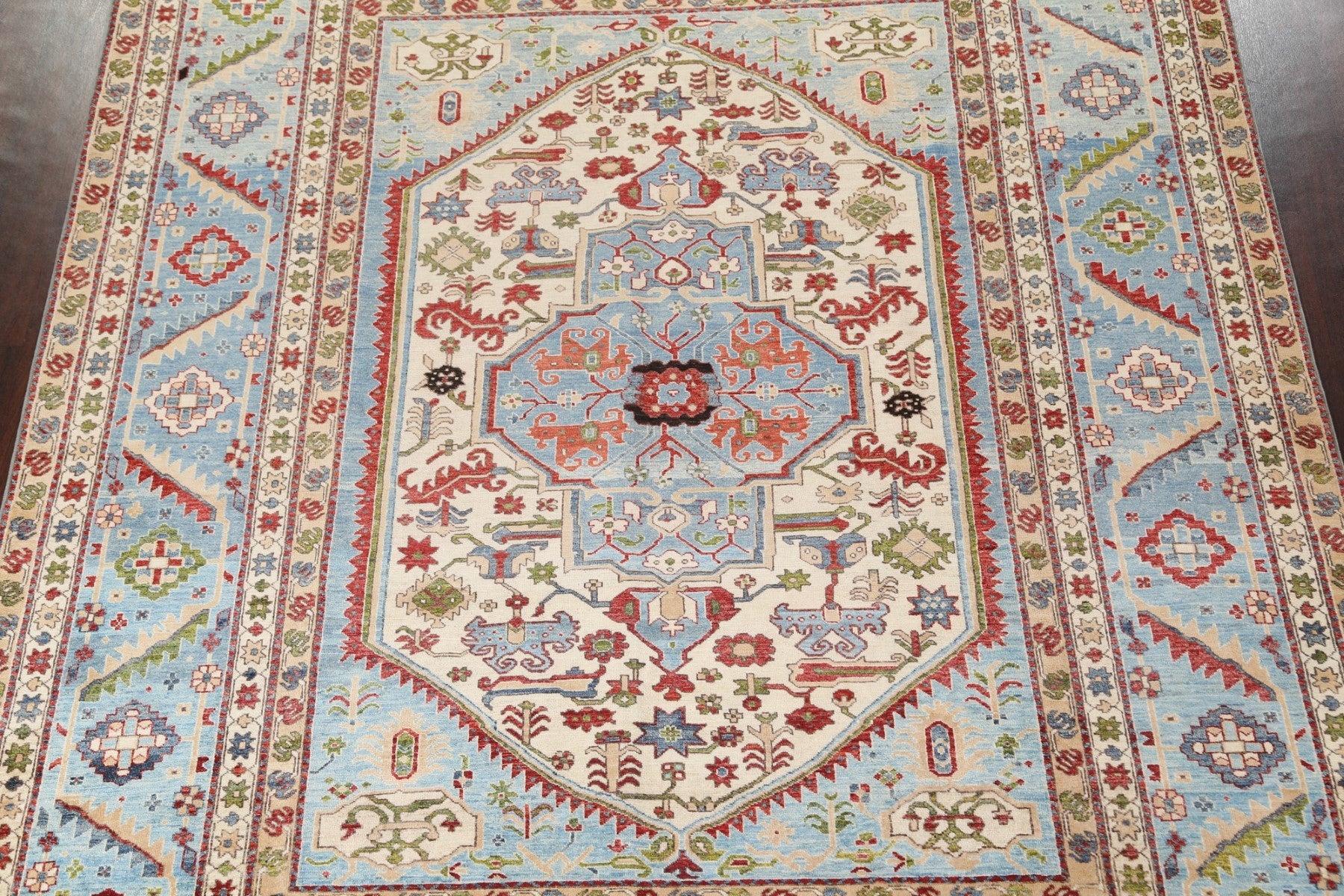 A Beautiful Genuine Pakistan Heriz (serapi) rug is Hand Knotted by skillful weavers in Pakistan with 100% Wool Material. This rug is in New, First Quality condition. dimensions are 11' 8'' X 9' 2'' in foot and 356 X 279 in centimeter. the primary color is Navy Blue & Blues.