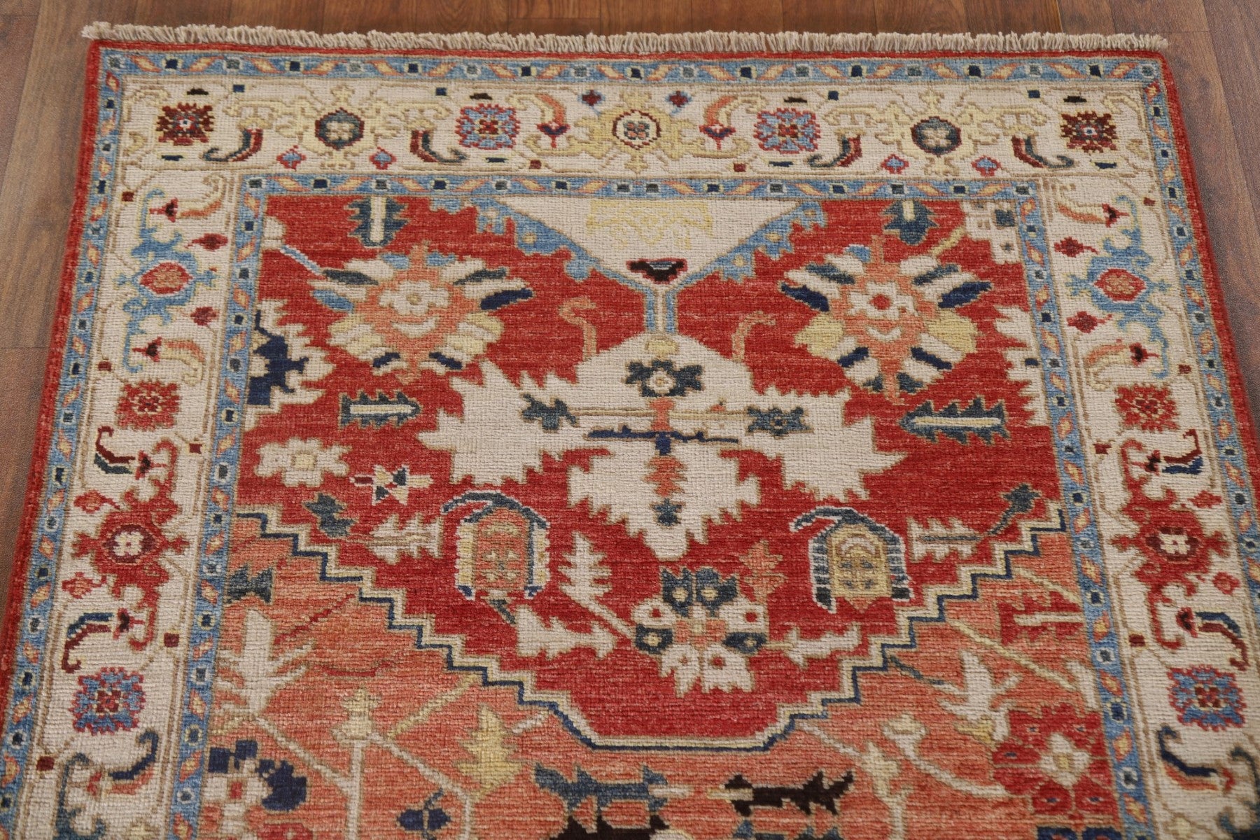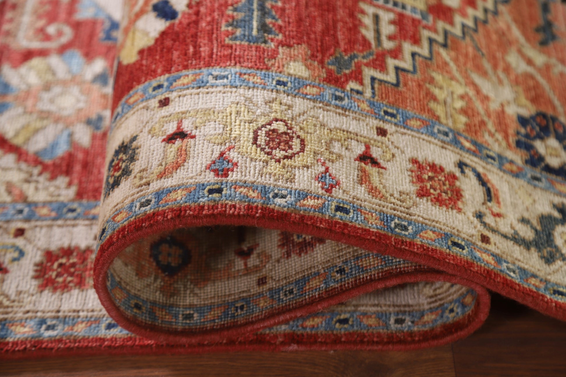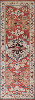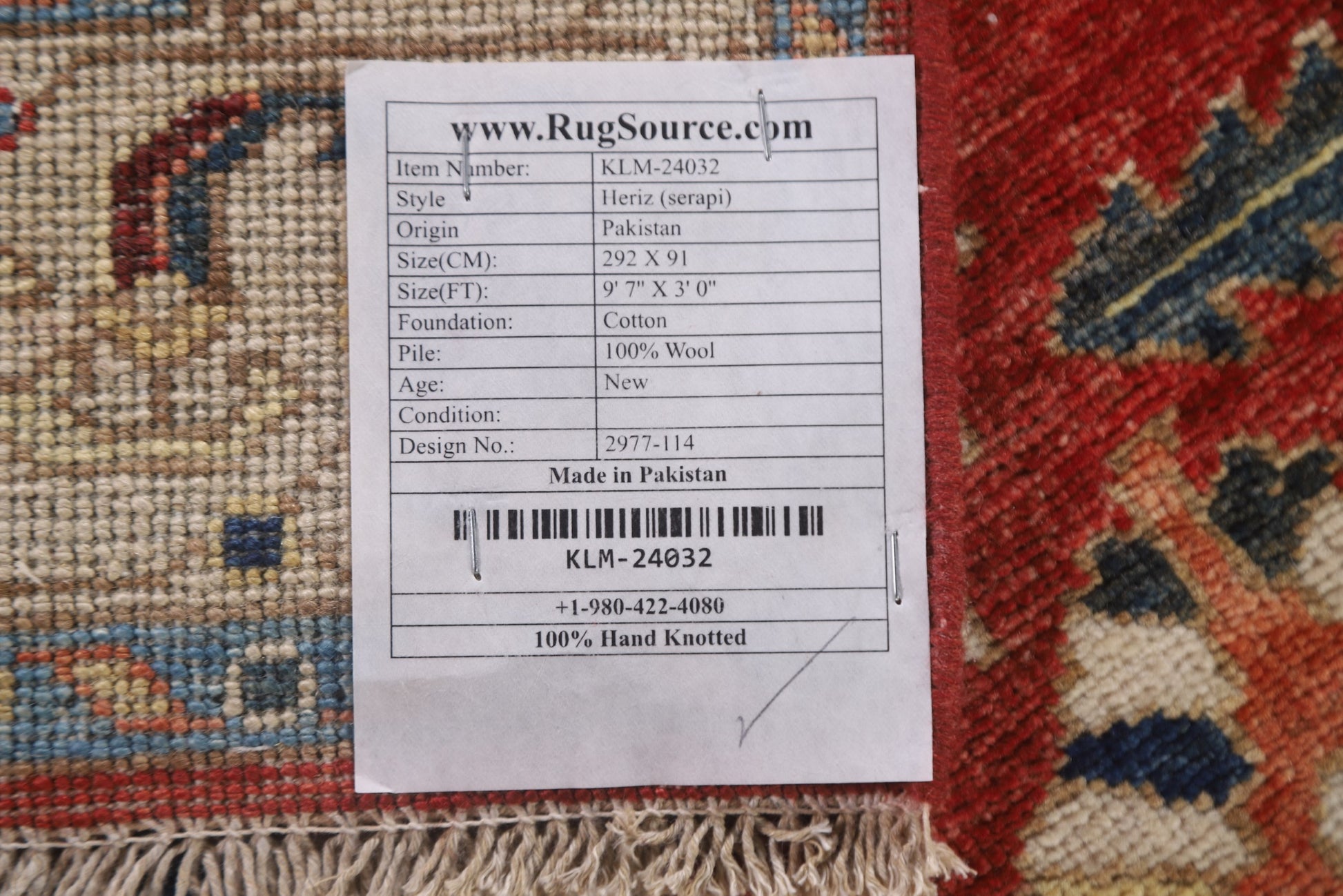 A Beautiful Genuine Pakistan Heriz (serapi) rug is Hand Knotted by skillful weavers in Pakistan with 100% Wool Material. This rug is in New, First Quality condition. dimensions are 9' 7'' X 3' 0'' in foot and 292 X 91 in centimeter. the primary color is Red.