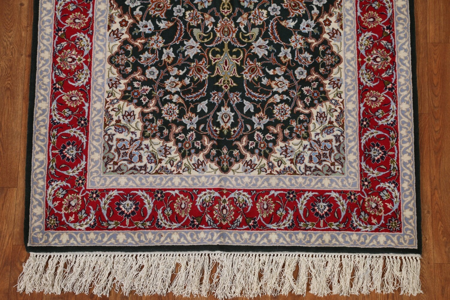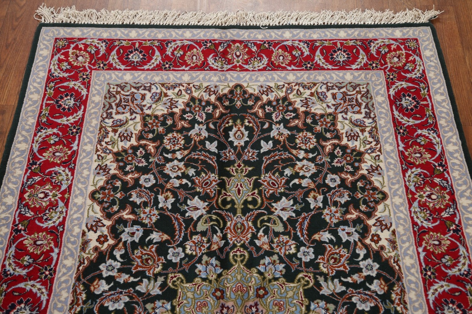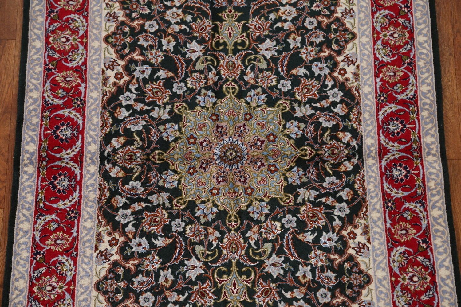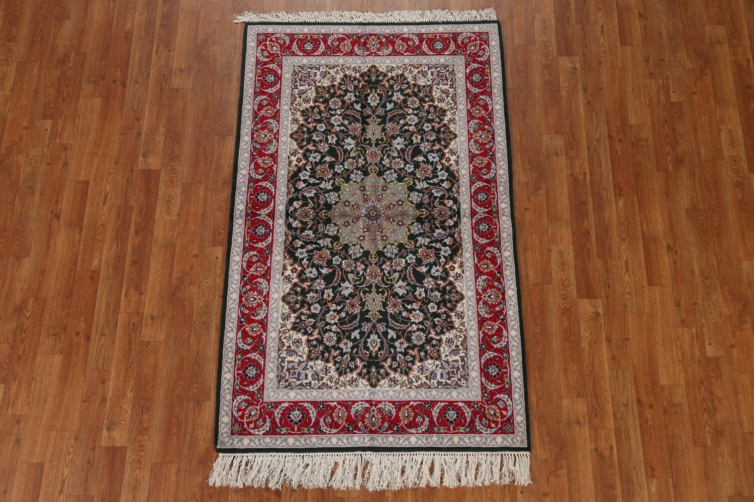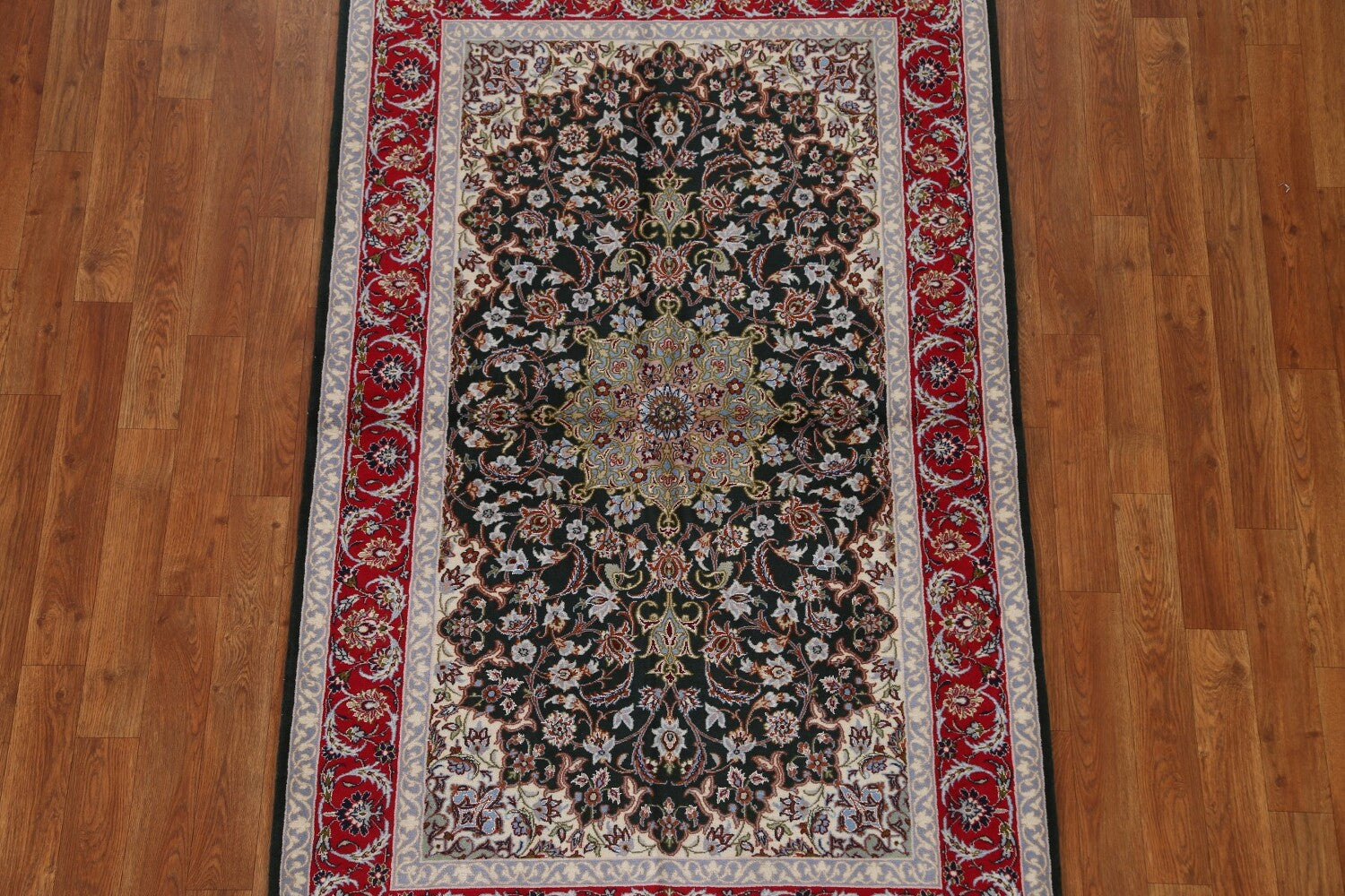 A Beautiful Genuine Persia ( Persia ) Isfahan rug is Hand Knotted by skillful weavers in Persia ( Persia ) with Wool & Silk Material. This rug is in condition. dimensions are 5' 6'' X 3' 4'' in foot and 168 X 102 in centimeter. the primary color is Black.