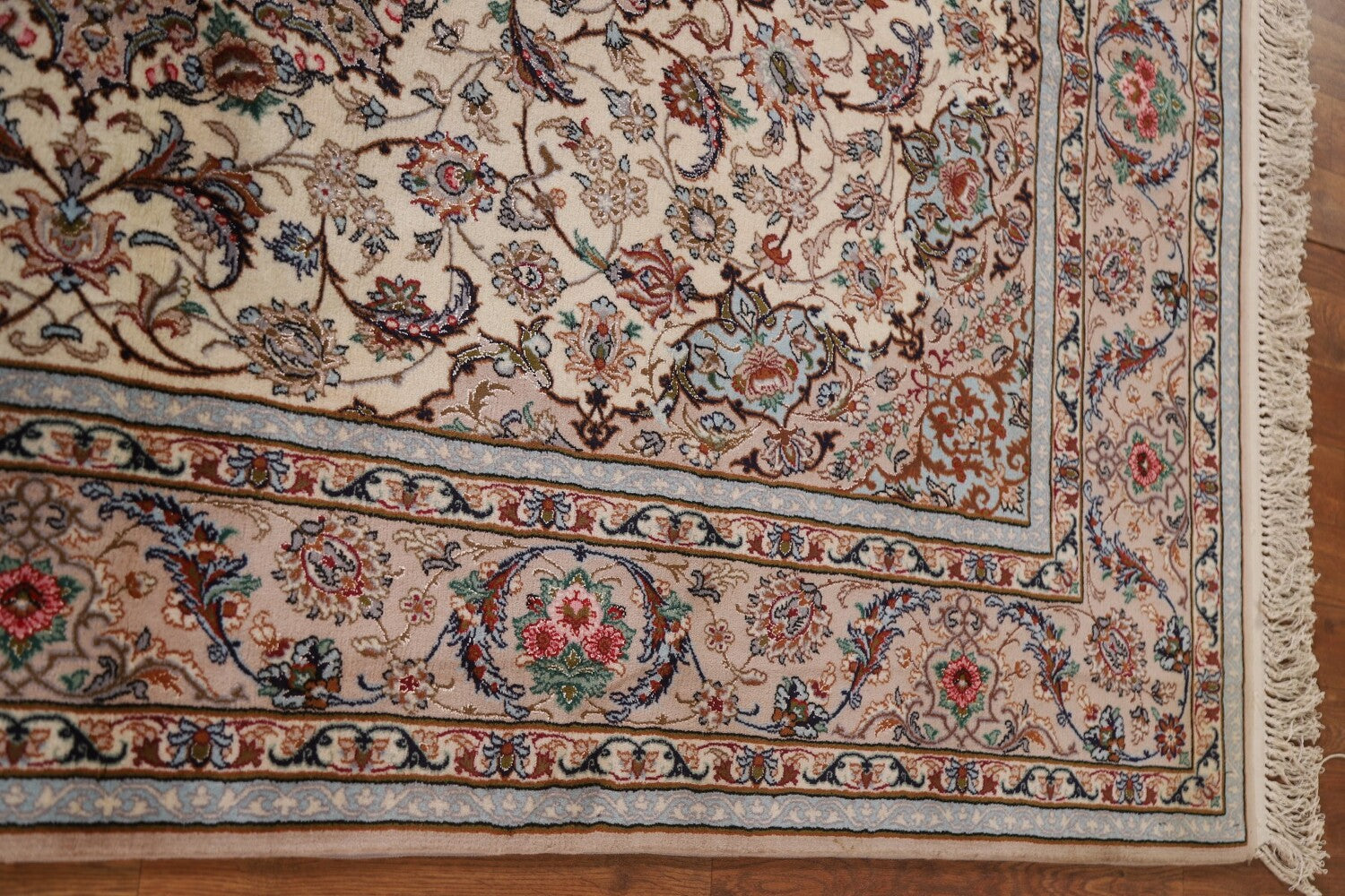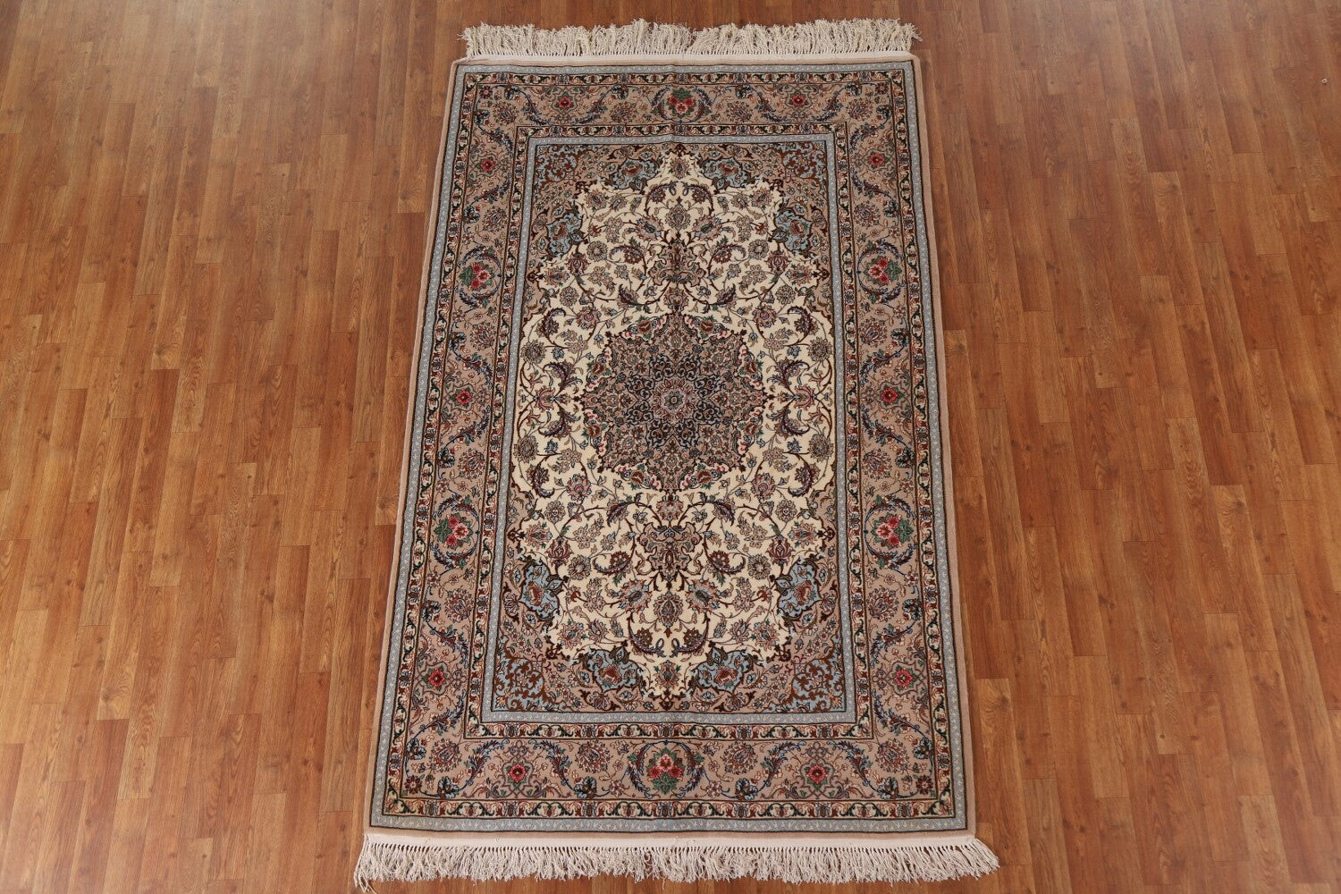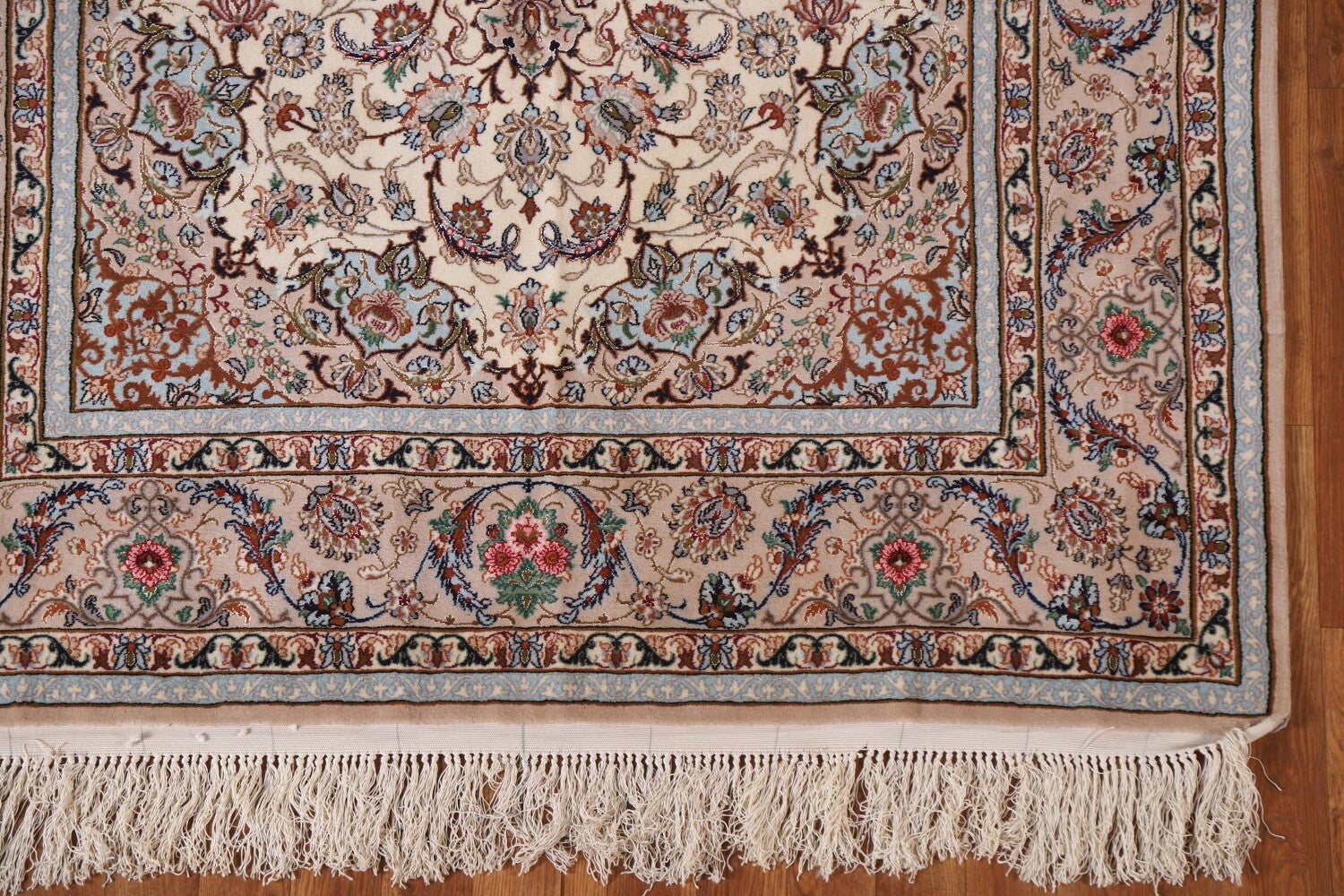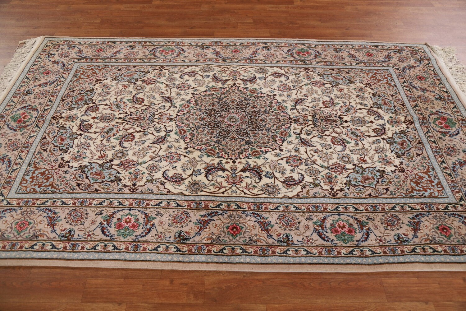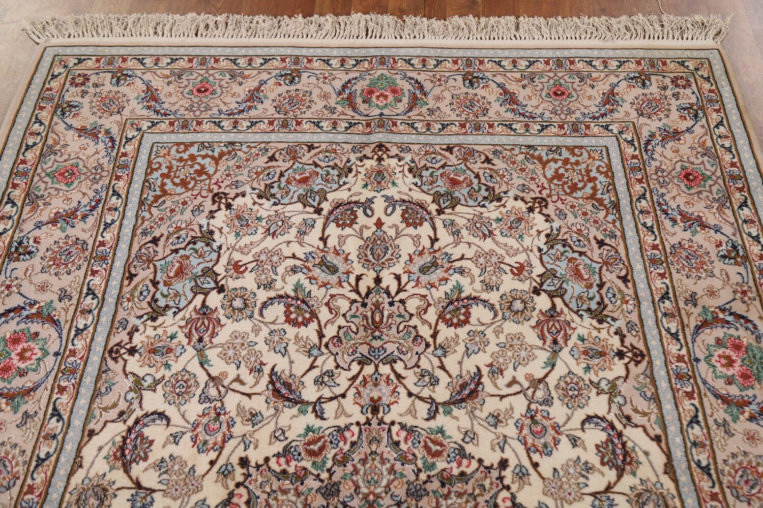 A Beautiful Genuine Persia ( Persia ) Isfahan rug is Hand Knotted by skillful weavers in Persia ( Persia ) with Wool & Silk Material. This rug is in New, First Quality condition. dimensions are 7' 11'' X 4' 11'' in foot and 241 X 150 in centimeter. the primary color is Beige & Ivories.