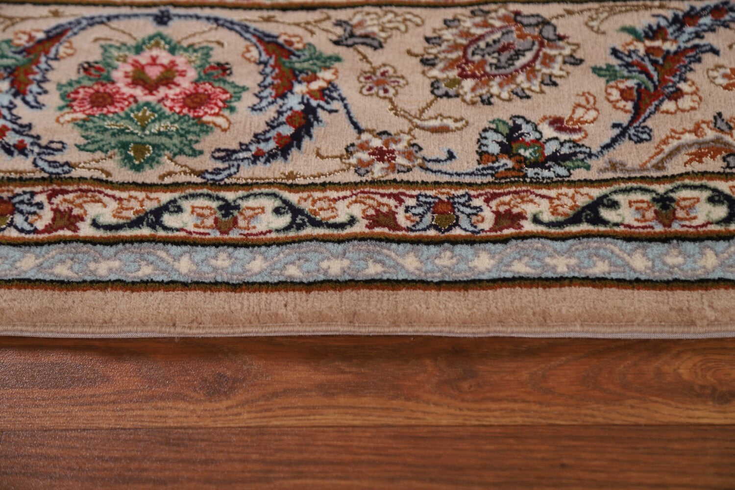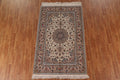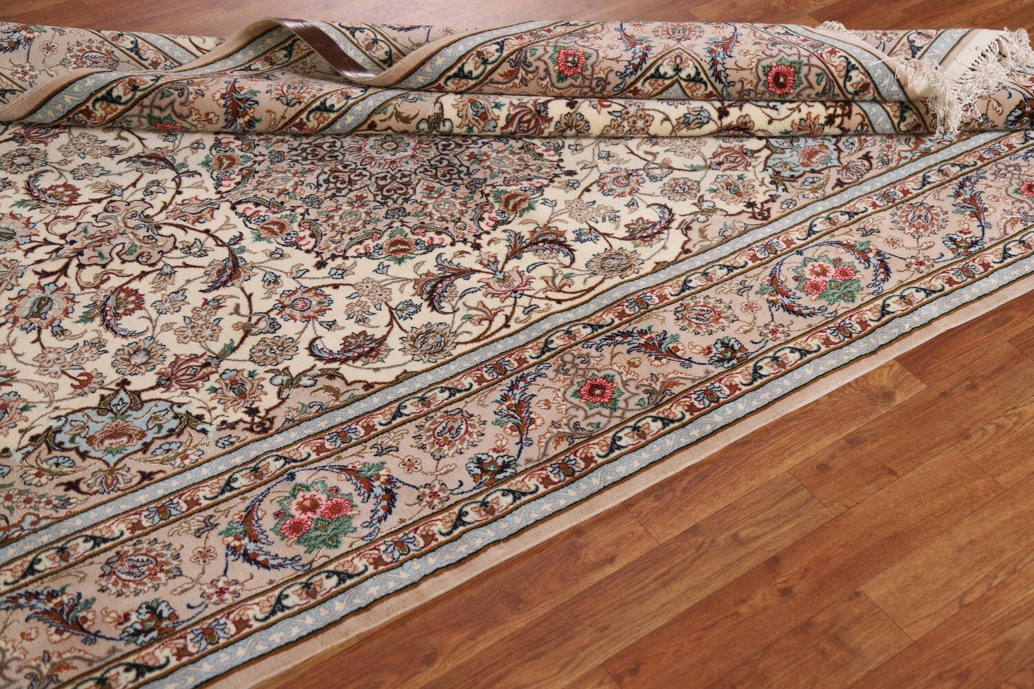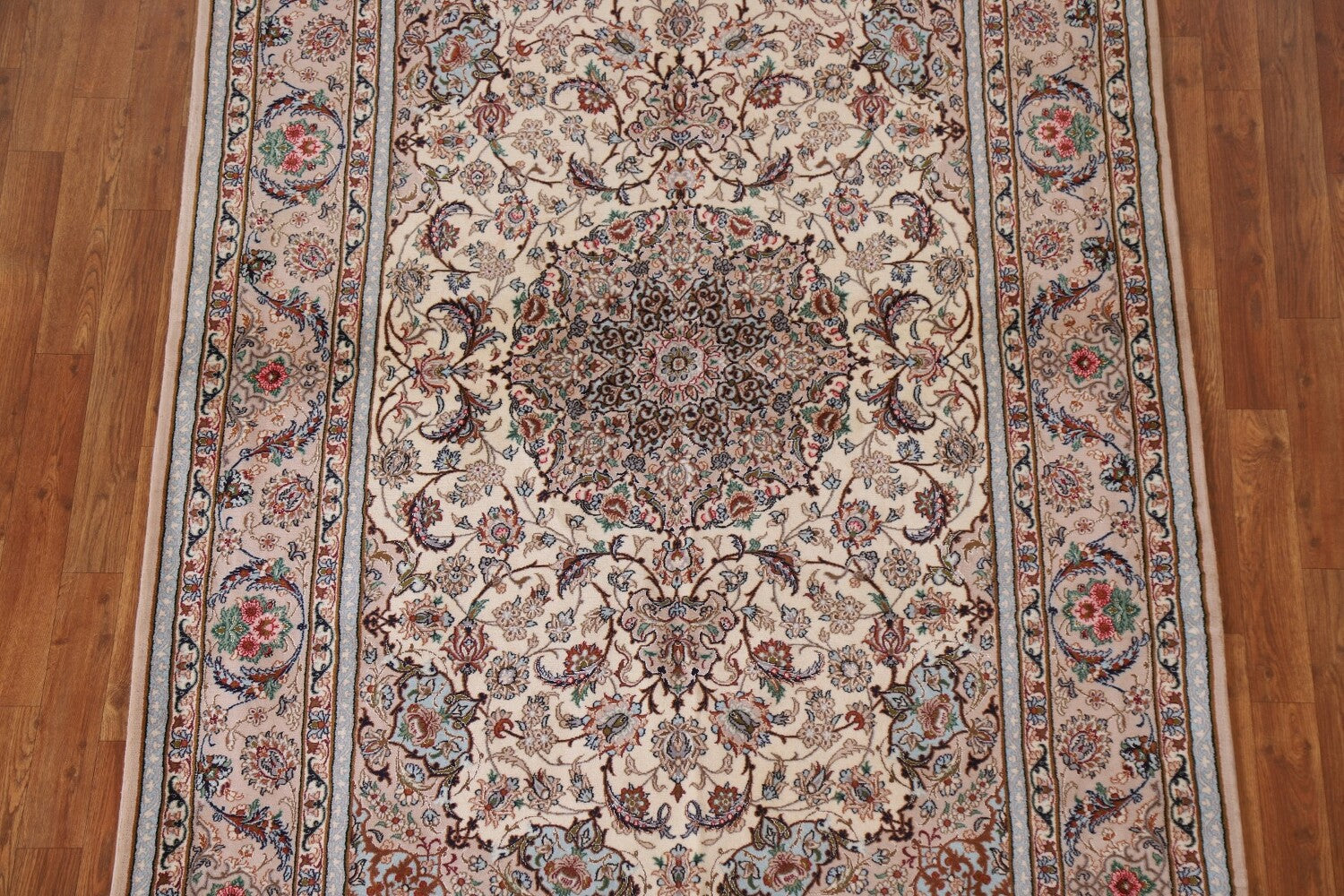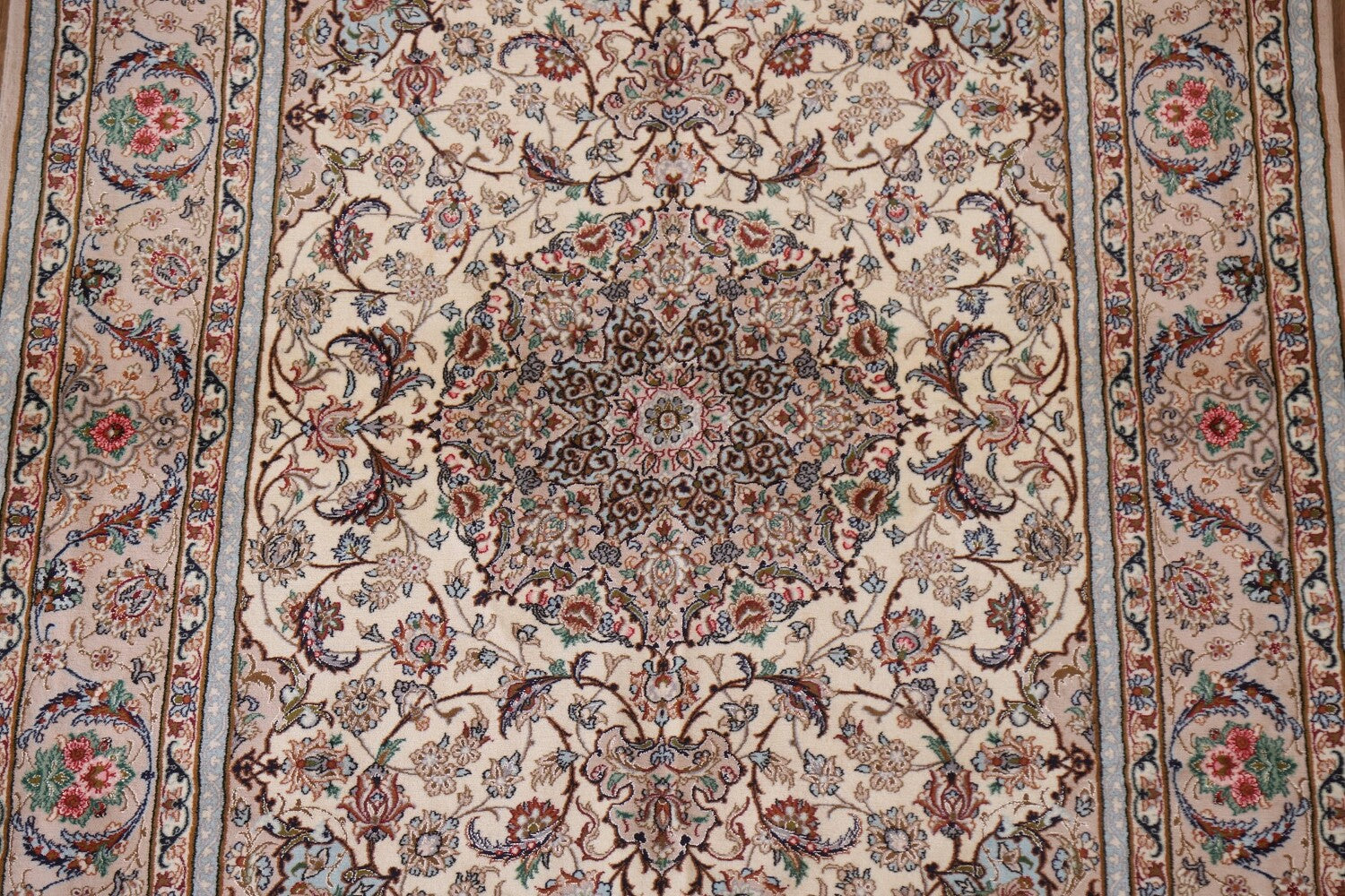 A Beautiful Genuine Persia ( Persia ) Isfahan rug is Hand Knotted by skillful weavers in Persia ( Persia ) with Wool & Silk Material. This rug is in New, First Quality condition. dimensions are 7' 11'' X 4' 11'' in foot and 241 X 150 in centimeter. the primary color is Beige & Ivories.