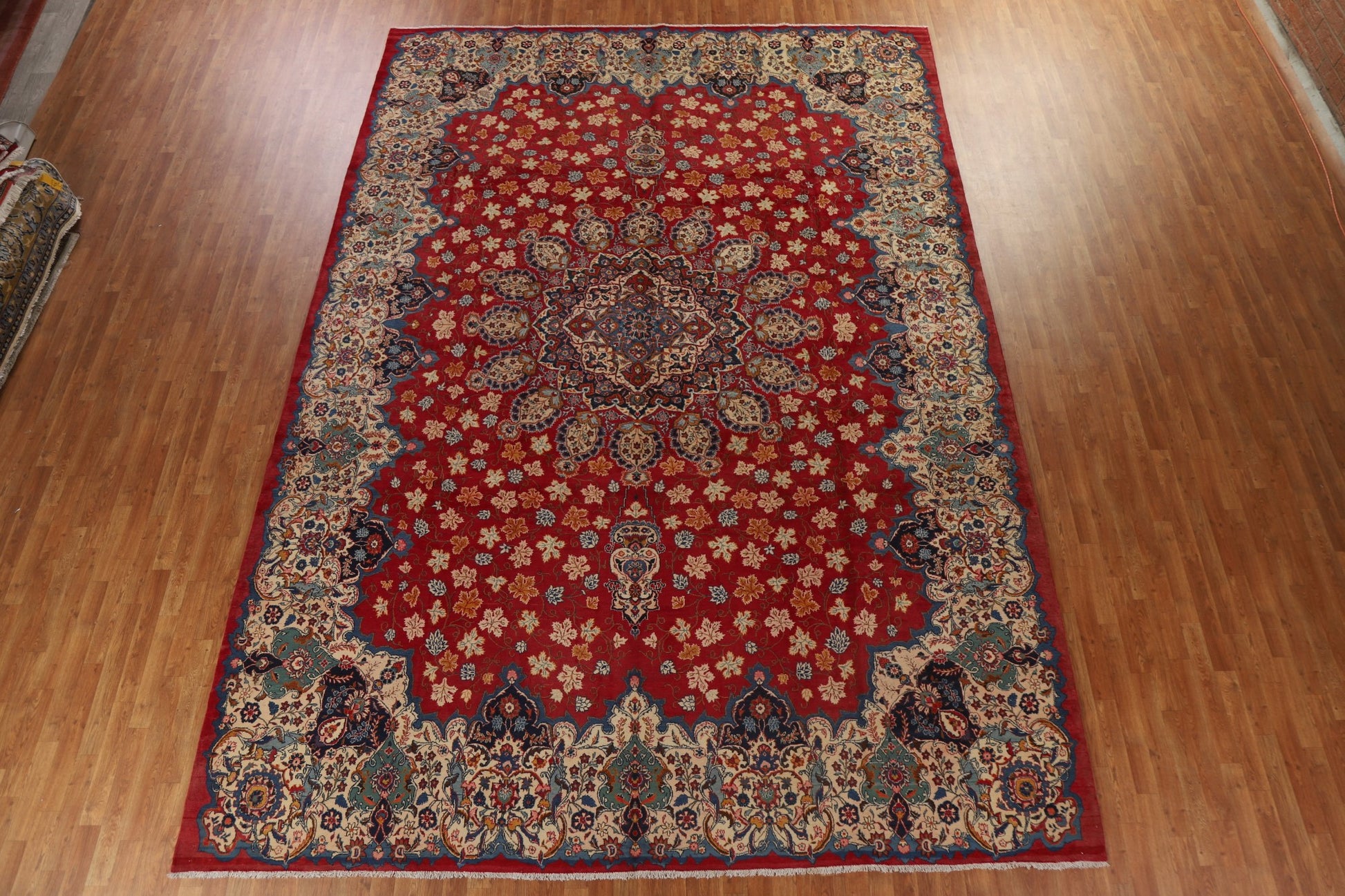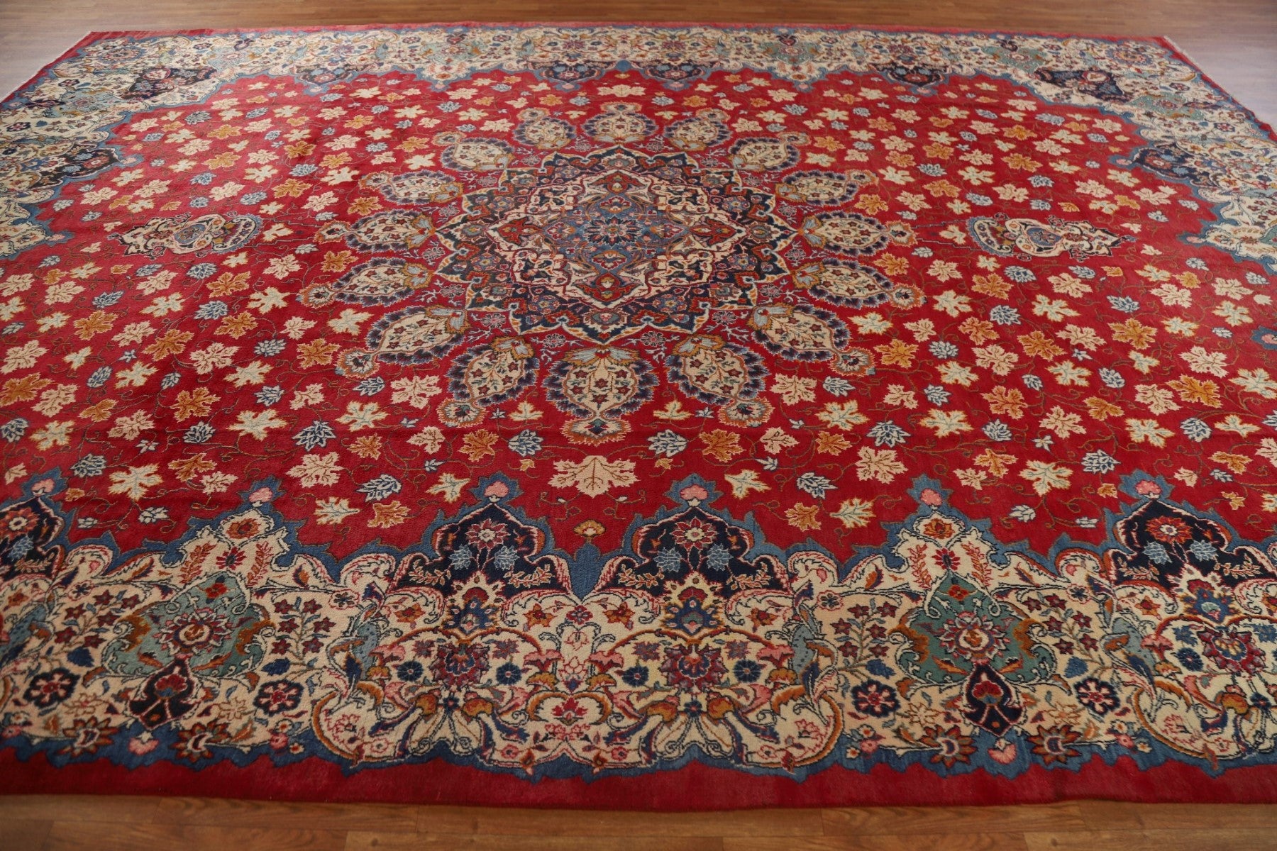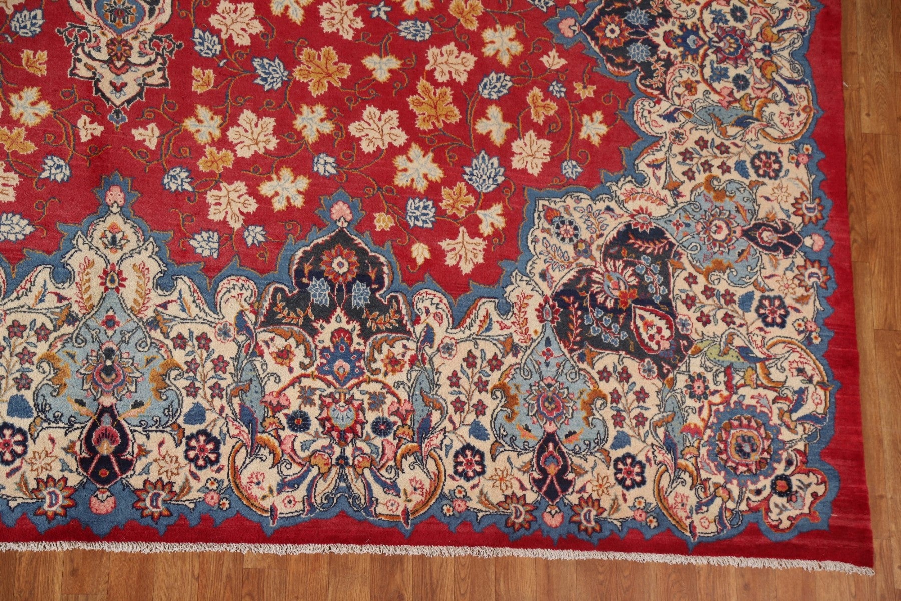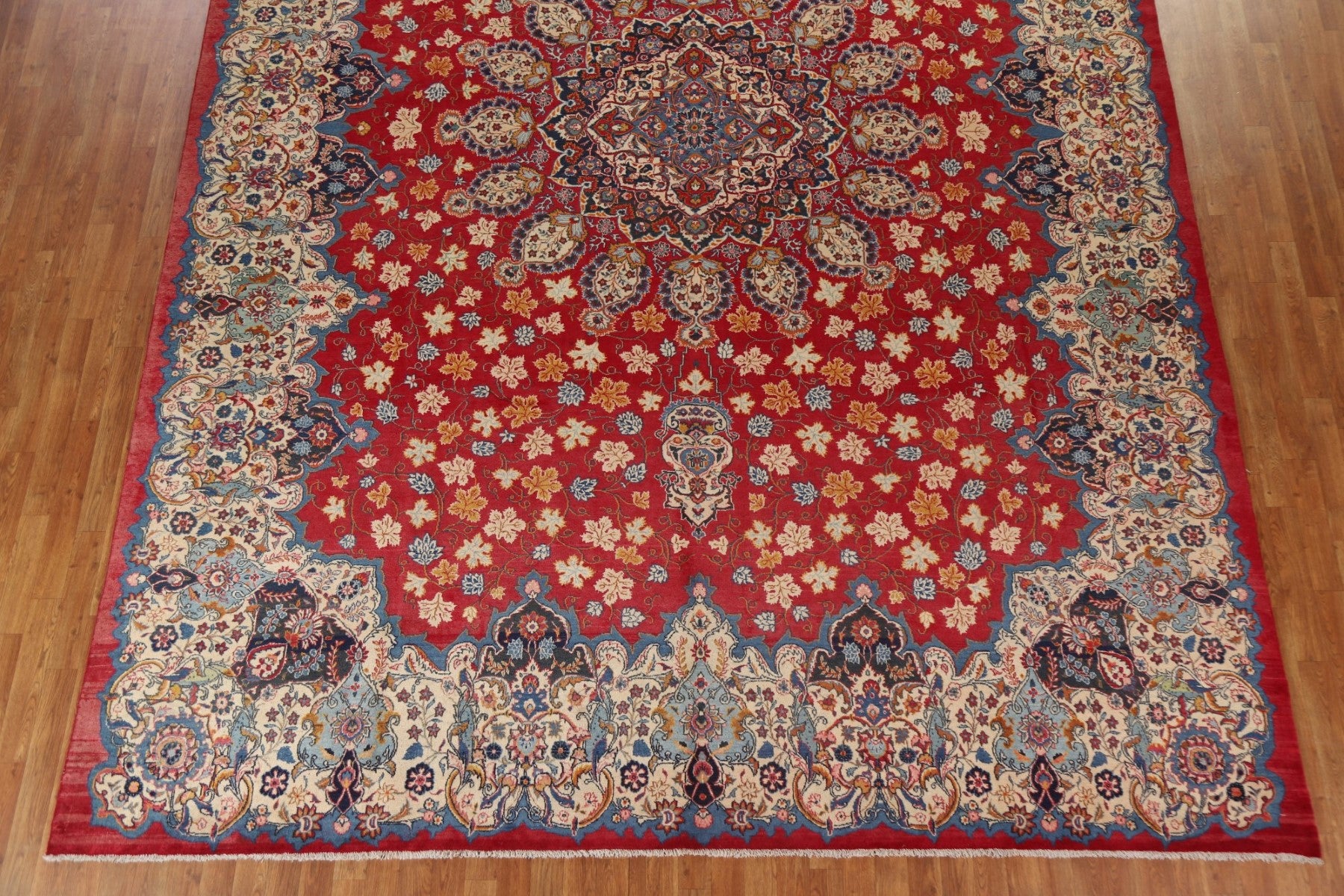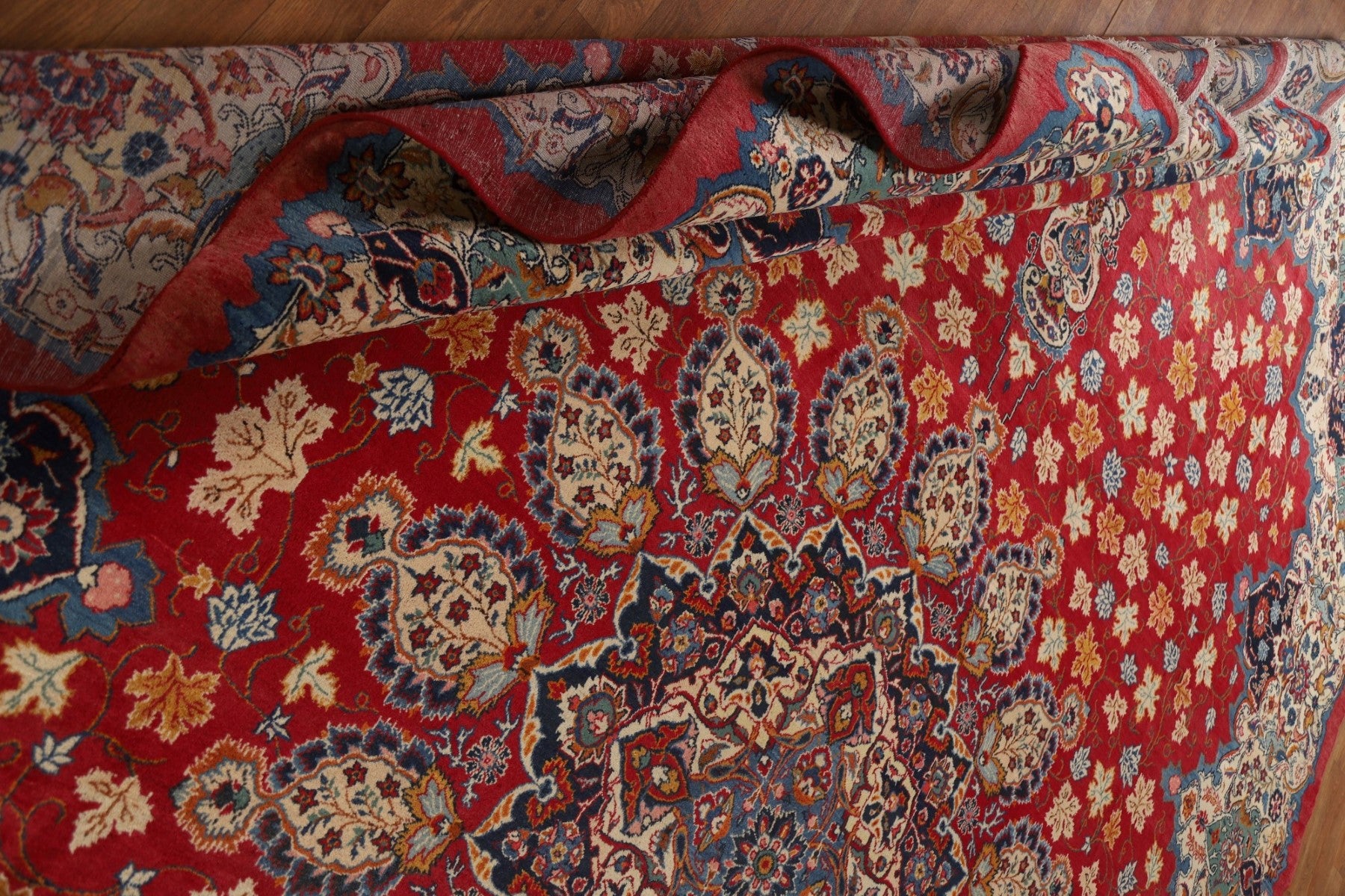 A Beautiful Genuine Persia ( Persia ) Isfahan rug is Hand Knotted by skillful weavers in Persia ( Persia ) with 100% Wool Material. This rug is in Very Good condition. dimensions are 15' 4'' X 10' 9'' in foot and 467 X 328 in centimeter. the primary color is Red.