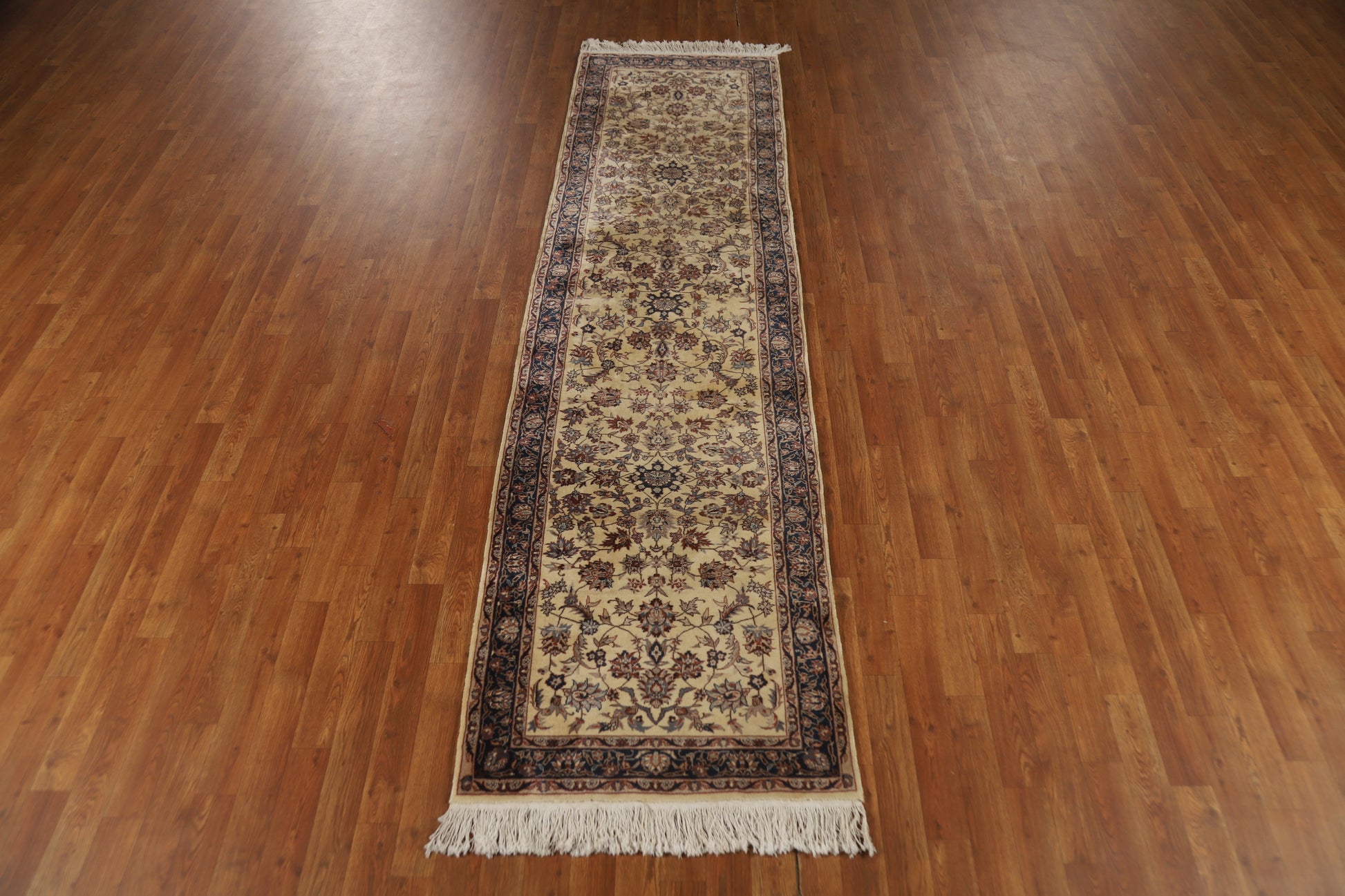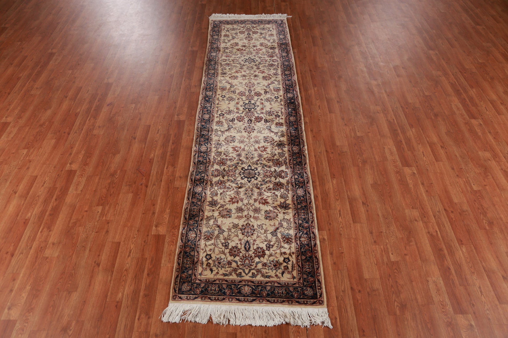 A Beautiful Genuine China Kashan rug is Hand Knotted by skillful weavers in China with 100% Wool Material. This rug is in Very Good condition. dimensions are 10' 0'' X 2' 7'' in foot and 305 X 79 in centimeter. the primary color is Beige & Ivories.