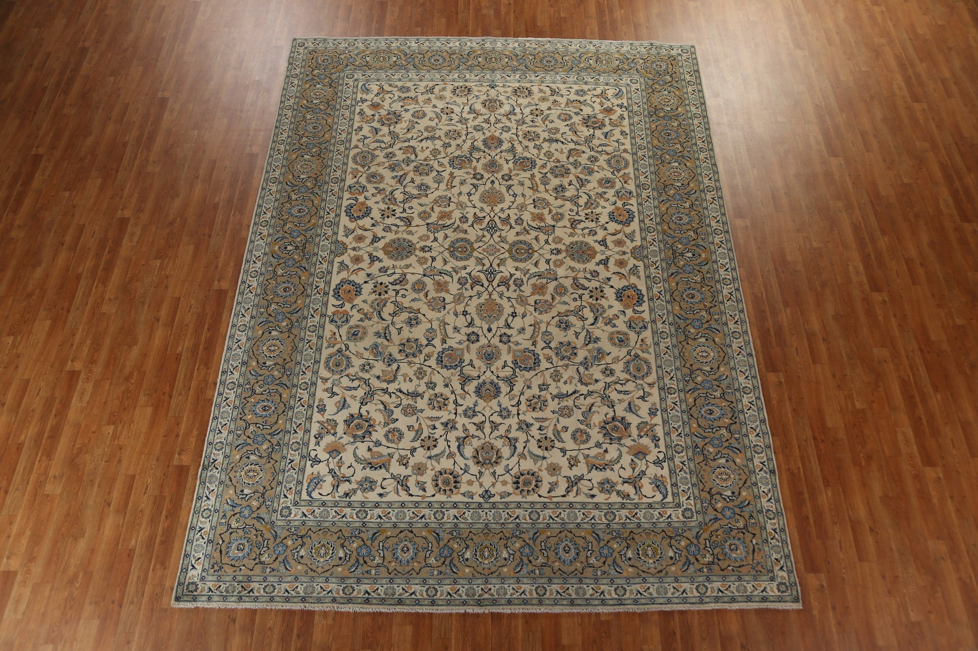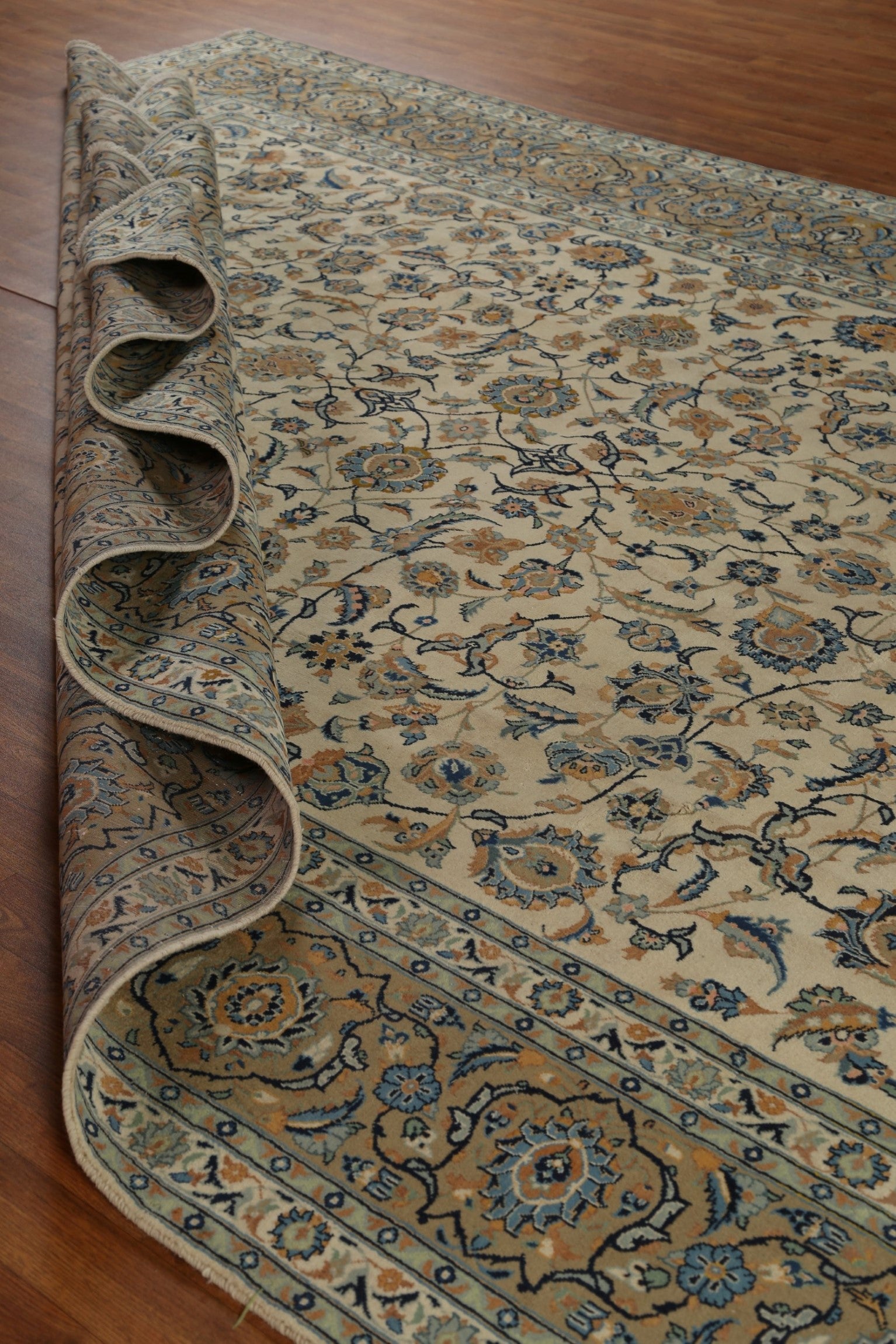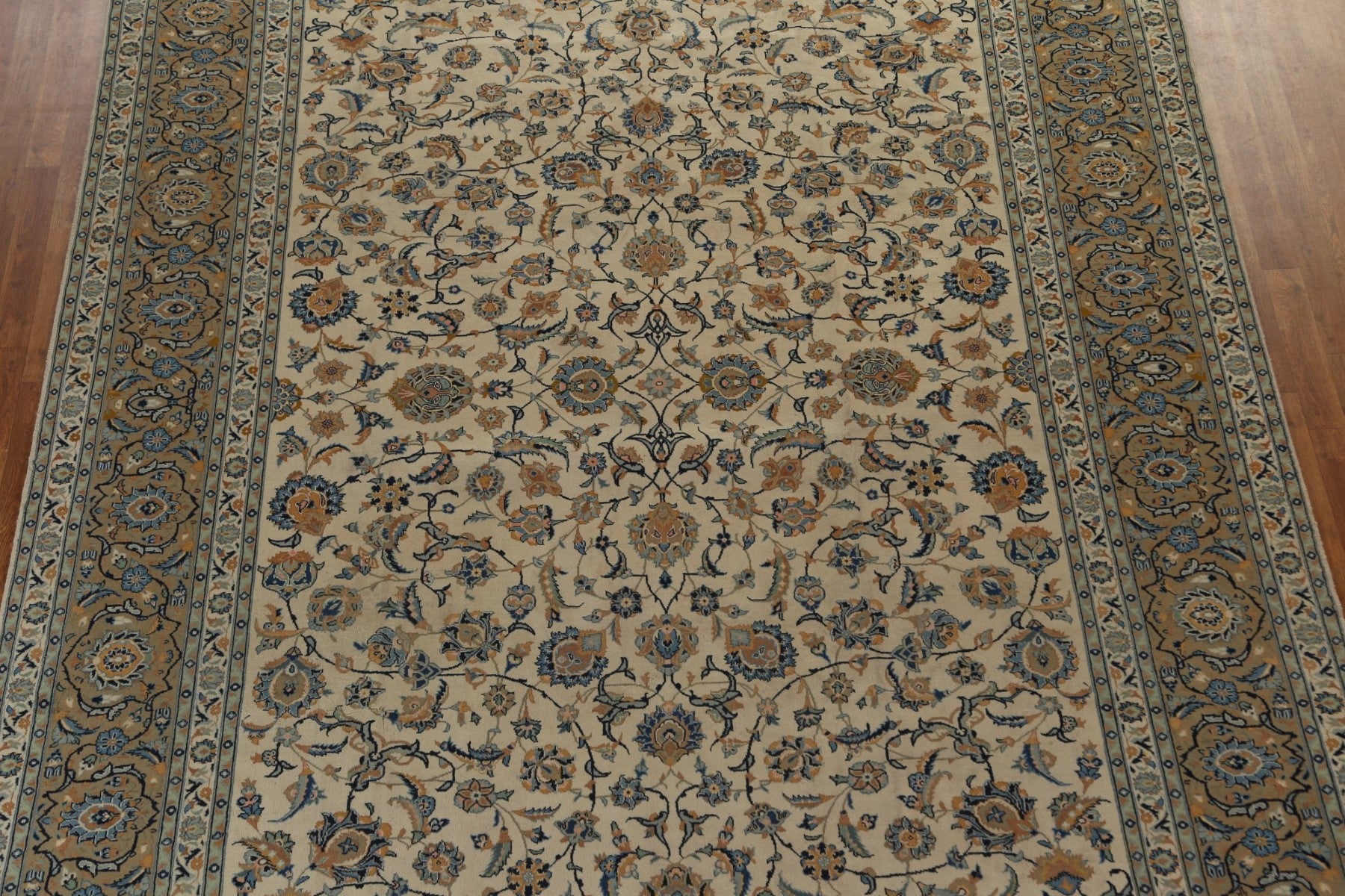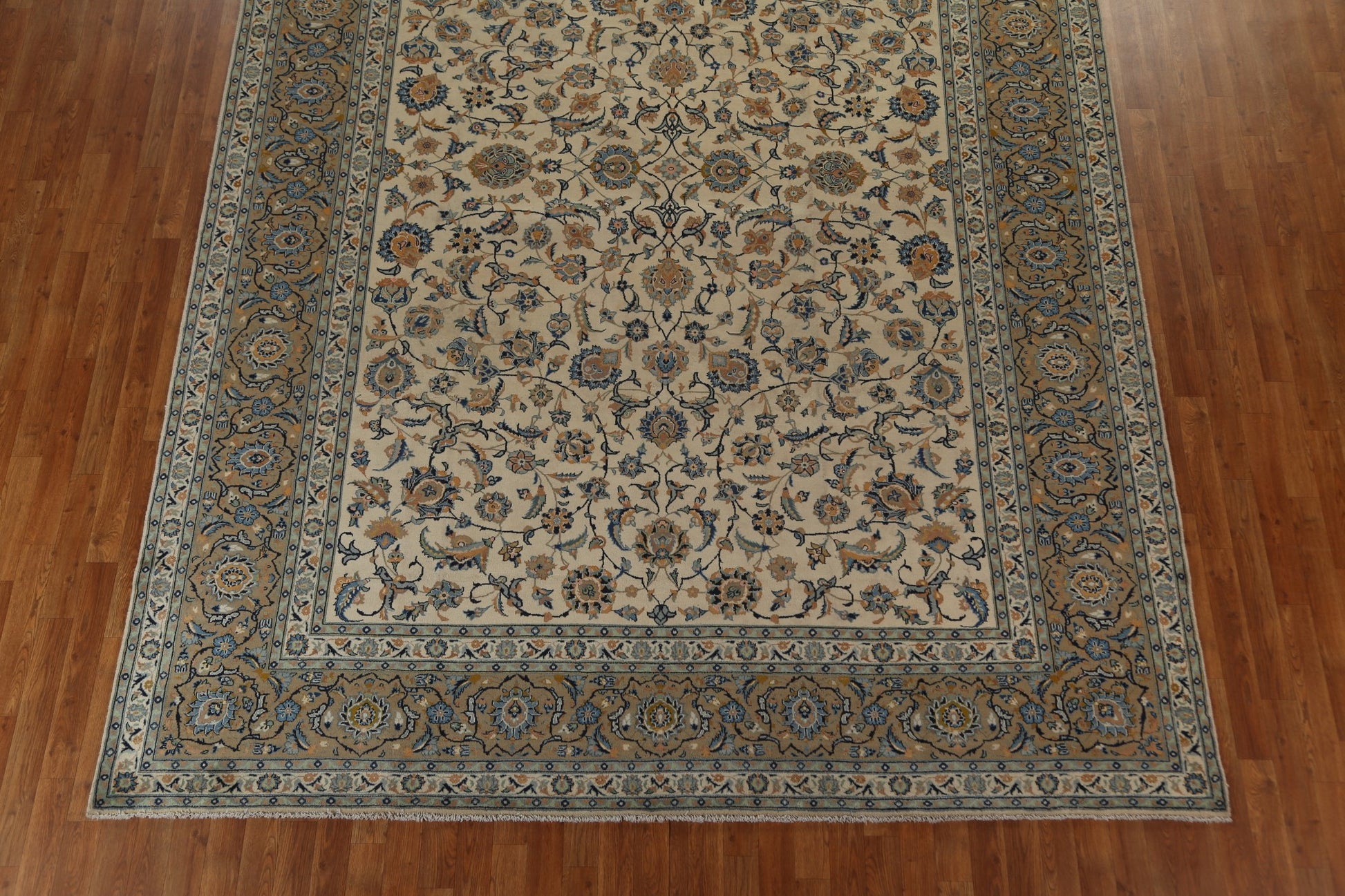 A Beautiful Genuine Persia ( Persia ) Kashan rug is Hand Knotted by skillful weavers in Persia ( Persia ) with 100% Wool Material. This rug is in Very Good condition. dimensions are 12' 2'' X 8' 11'' in foot and 371 X 272 in centimeter. the primary color is Beige & Ivories.