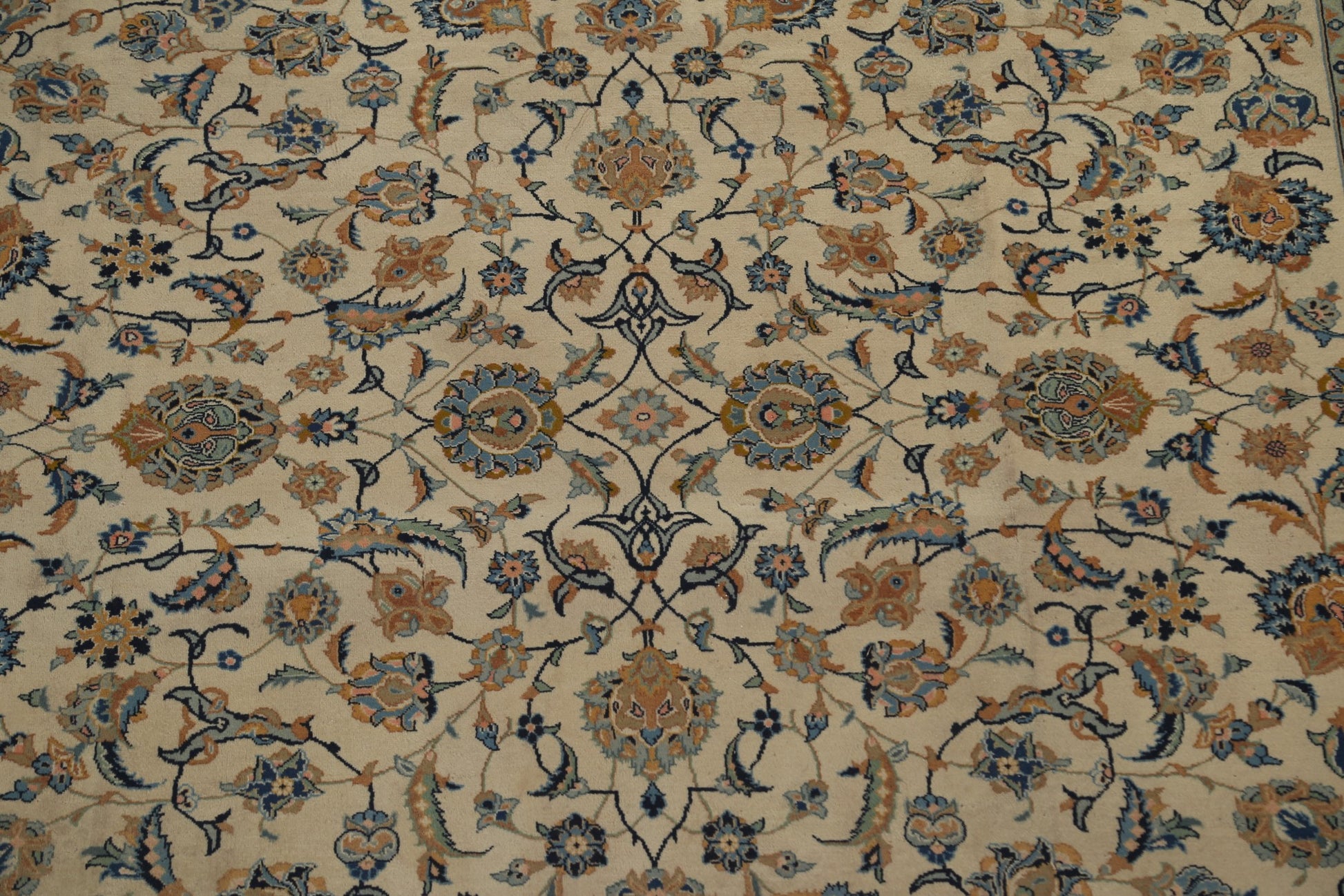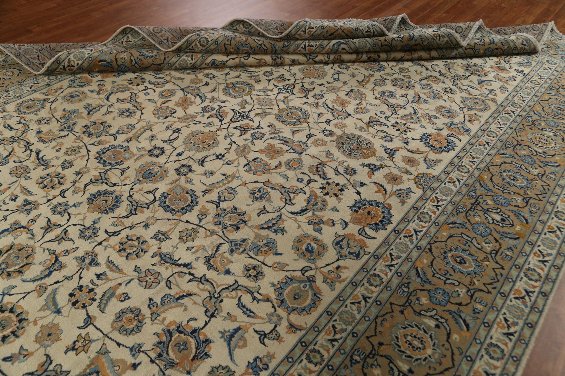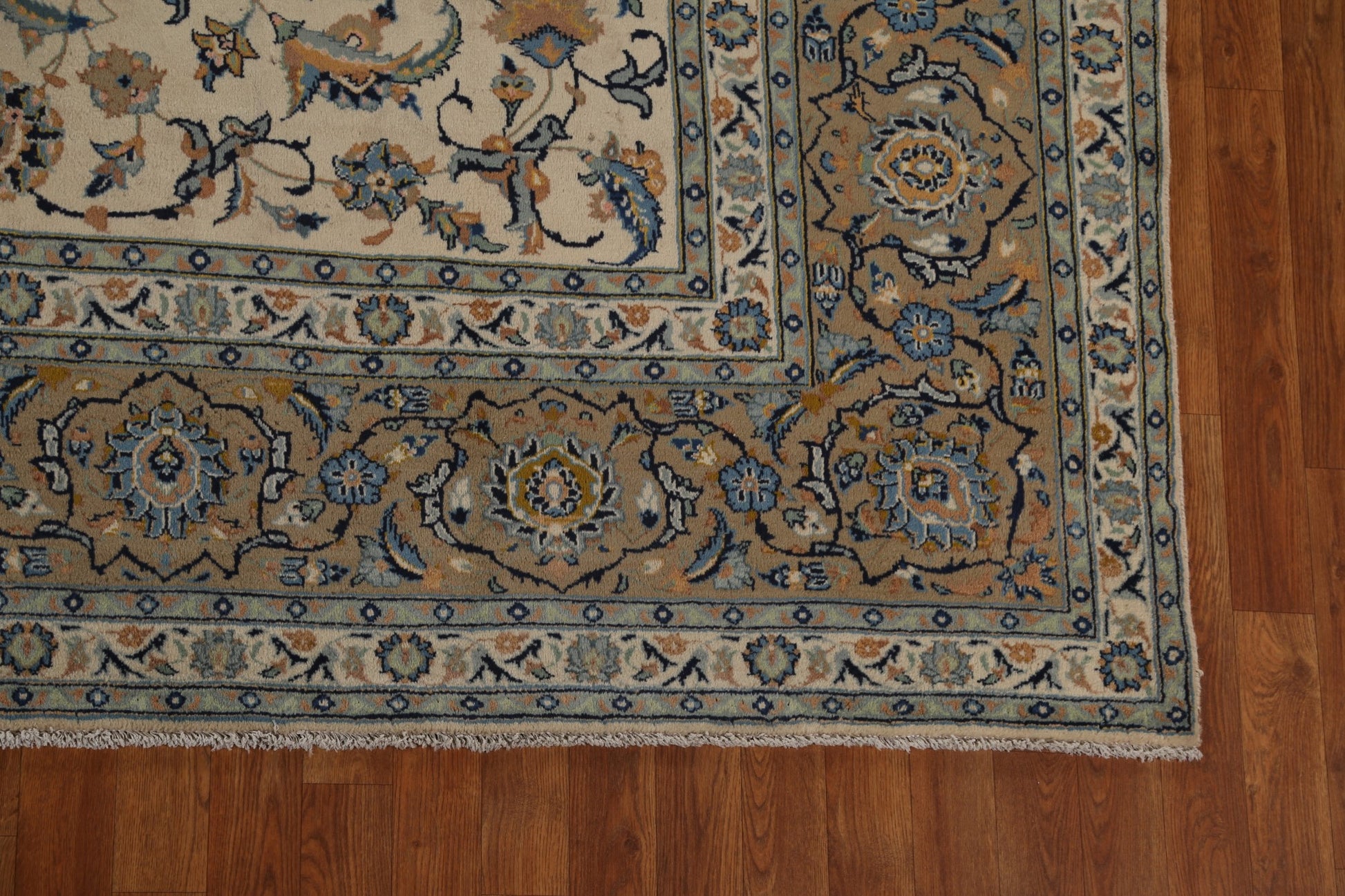 A Beautiful Genuine Persia ( Persia ) Kashan rug is Hand Knotted by skillful weavers in Persia ( Persia ) with 100% Wool Material. This rug is in Very Good condition. dimensions are 12' 2'' X 8' 11'' in foot and 371 X 272 in centimeter. the primary color is Beige & Ivories.
