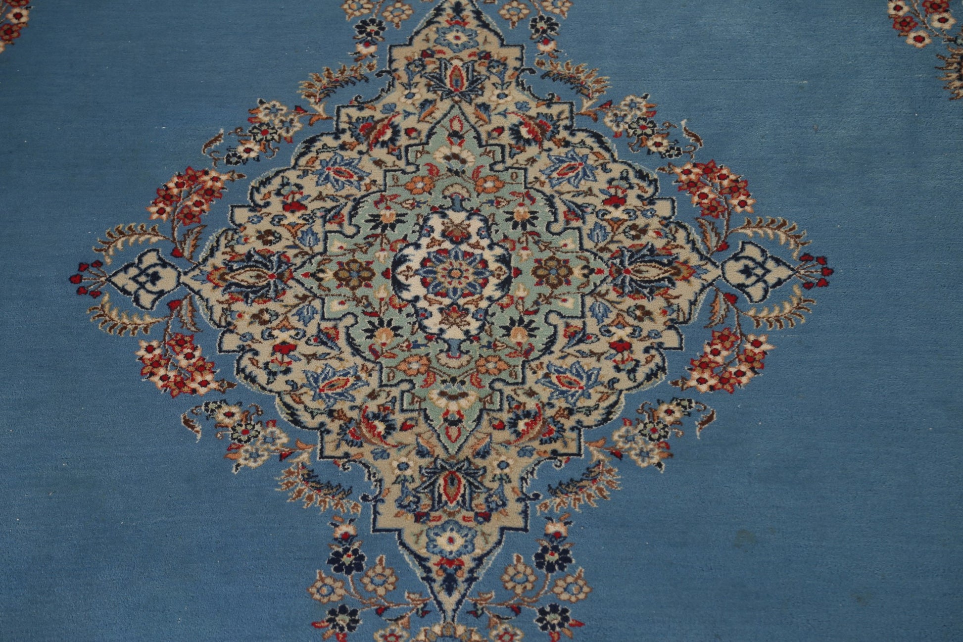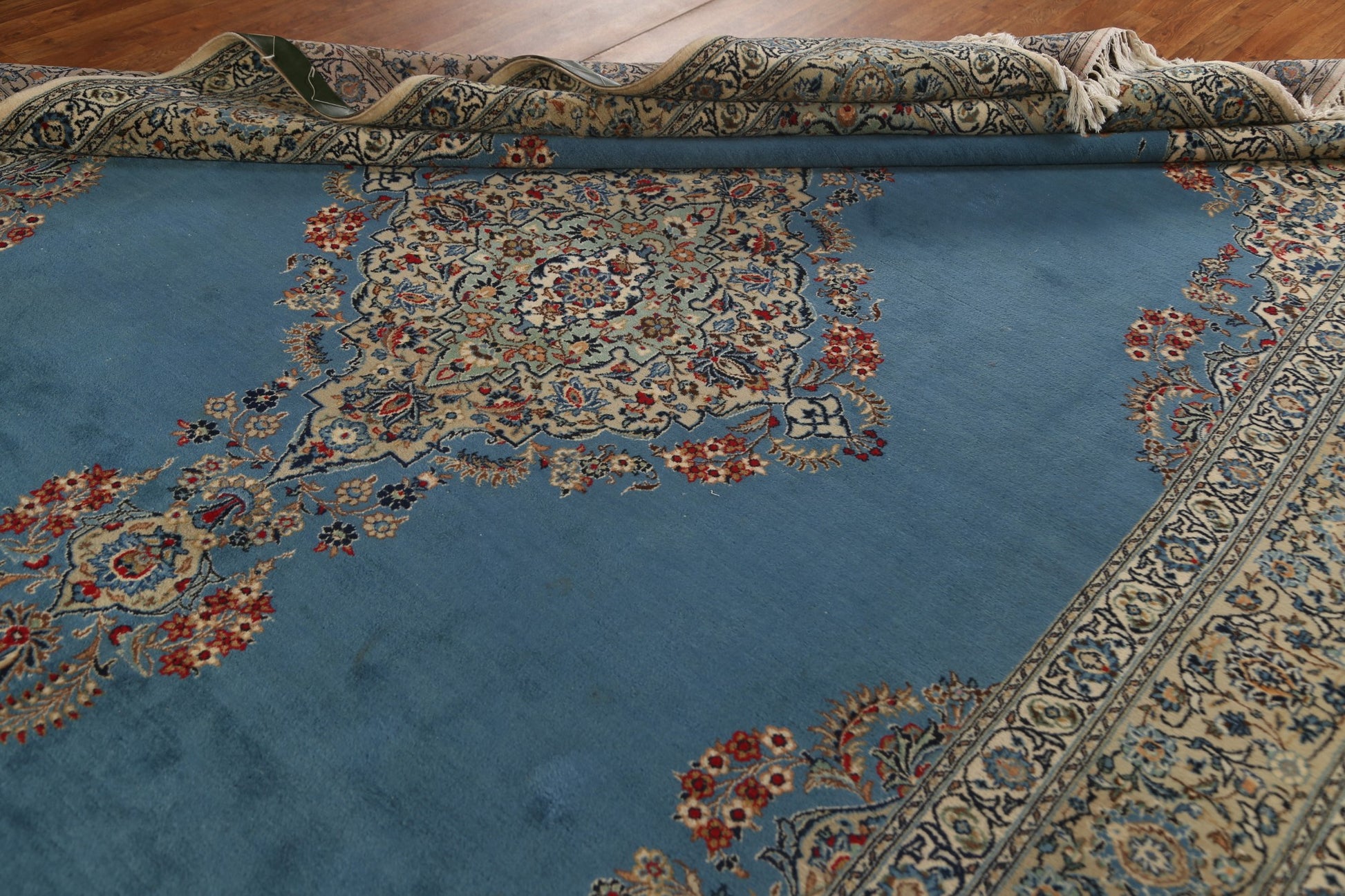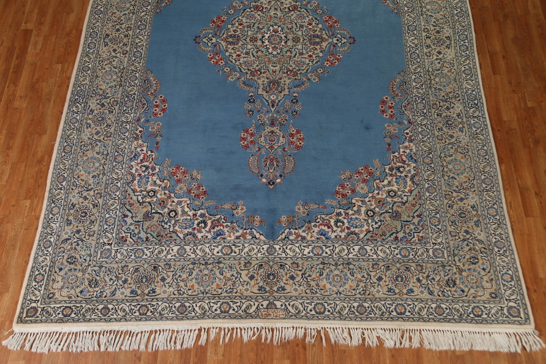 A Beautiful Genuine Persia ( Persia ) Kashan rug is Hand Knotted by skillful weavers in Persia ( Persia ) with 100% Wool Material. This rug is in Very Good ( Low Pile ) condition. dimensions are 12' 9'' X 8' 9'' in foot and 389 X 267 in centimeter. the primary color is Navy Blue & Blues.