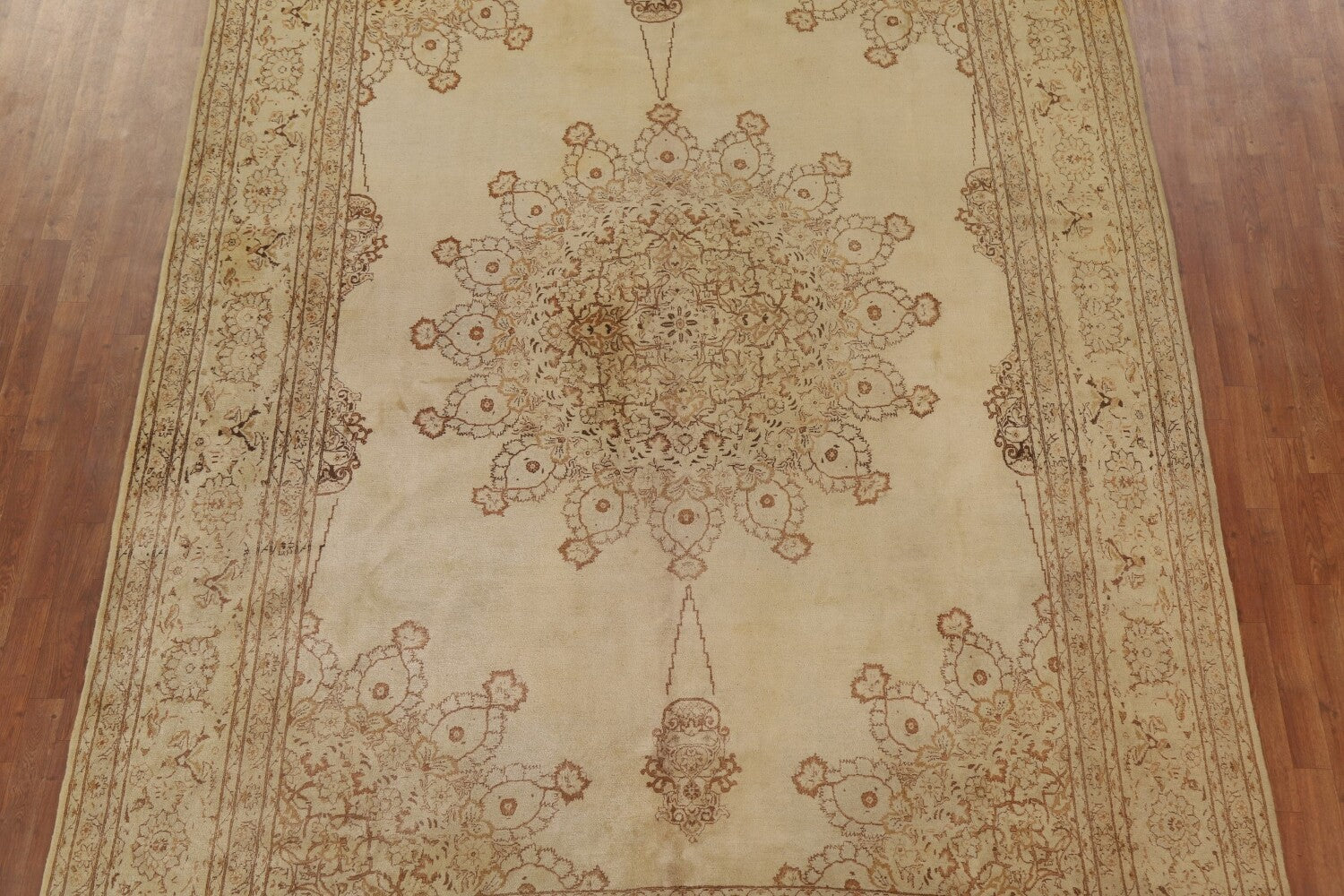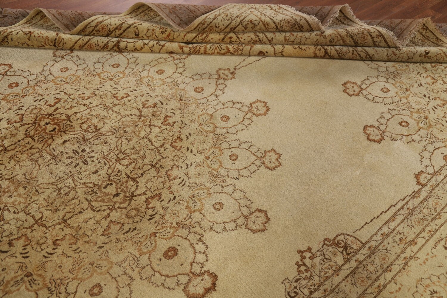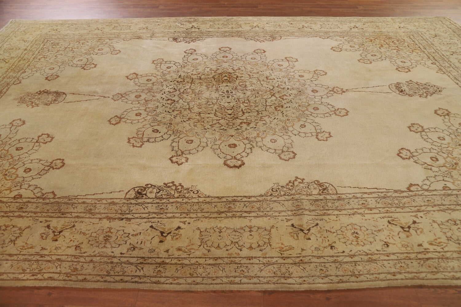 A Beautiful Genuine Persia ( Persia ) Kashan rug is Hand Knotted by skillful weavers in Persia ( Persia ) with 100% Wool Material. This rug is in Very Good condition. dimensions are 13' 4'' X 8' 11'' in foot and 406 X 272 in centimeter. the primary color is Yellow & Gold.