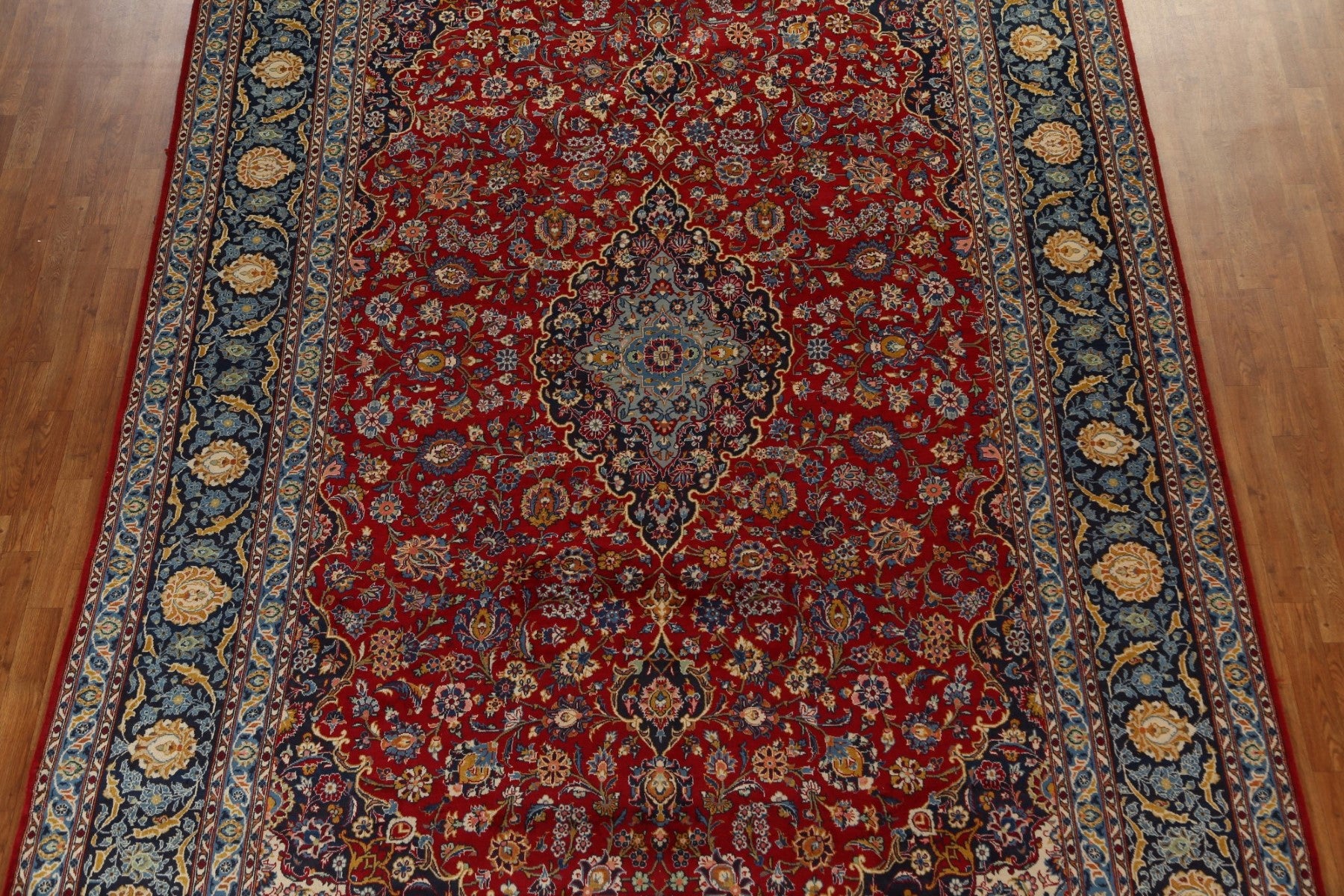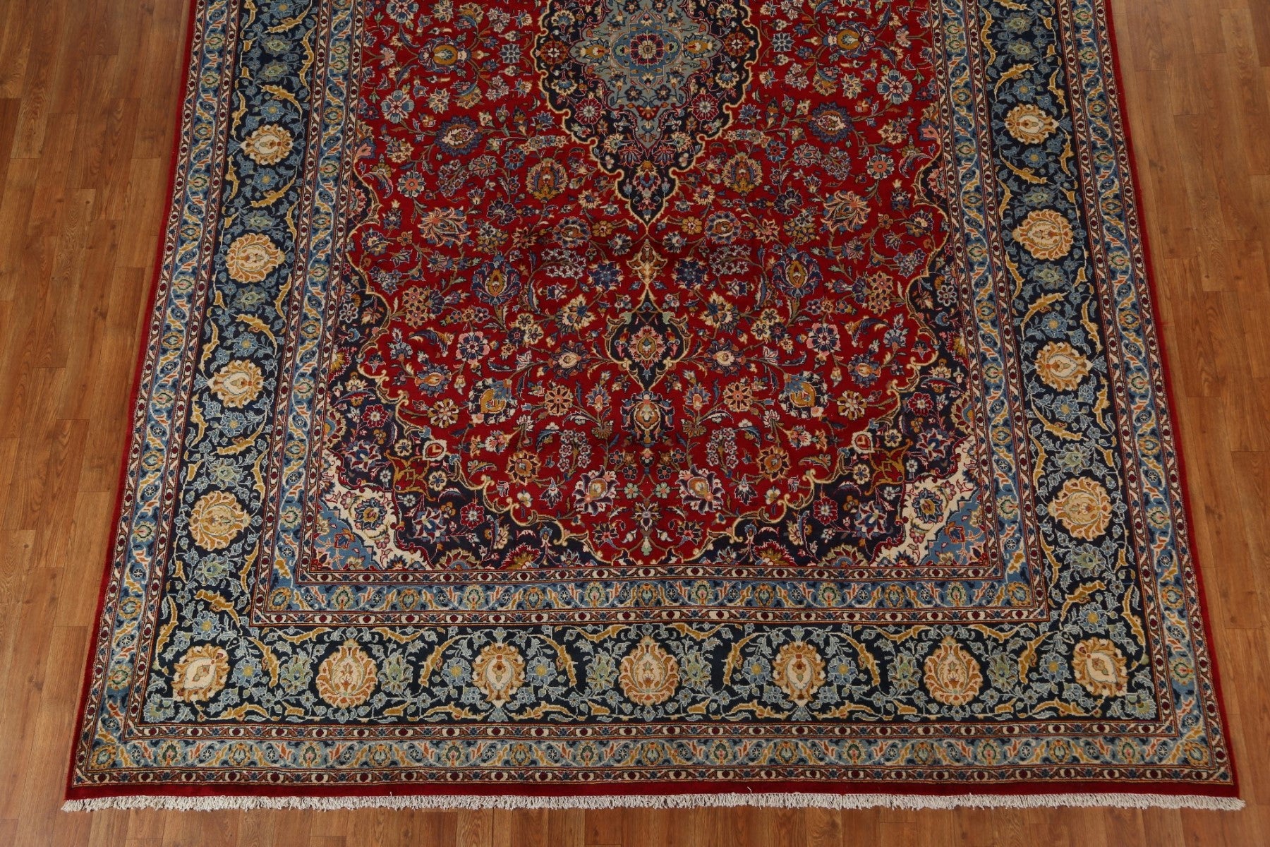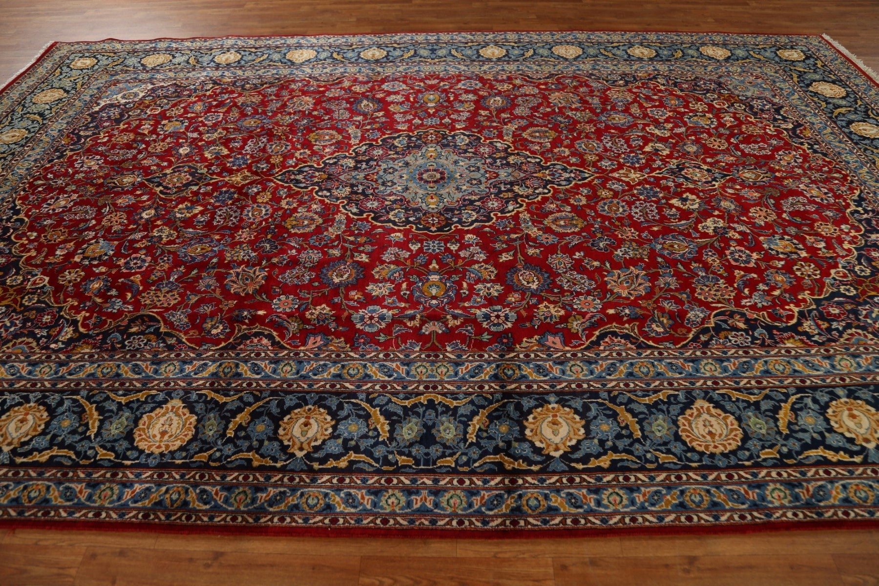A Beautiful Genuine Persia ( Persia ) Kashan rug is Hand Knotted by skillful weavers in Persia ( Persia ) with 100% Wool Material. This rug is in Excellent condition. dimensions are 13' 10'' X 8' 9'' in foot and 422 X 267 in centimeter. the primary color is Red.
