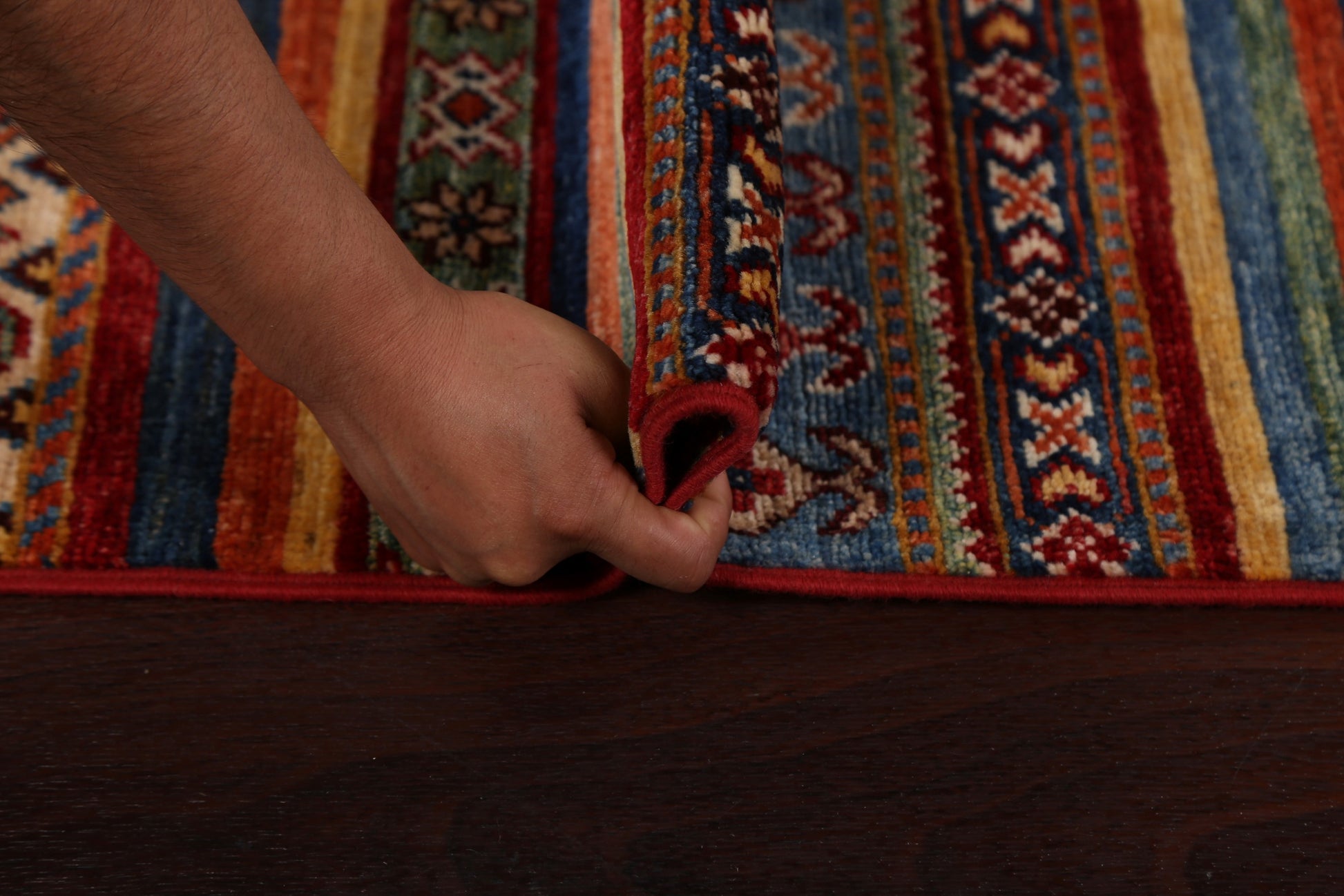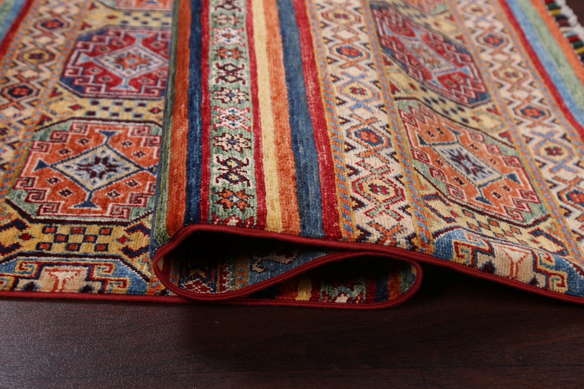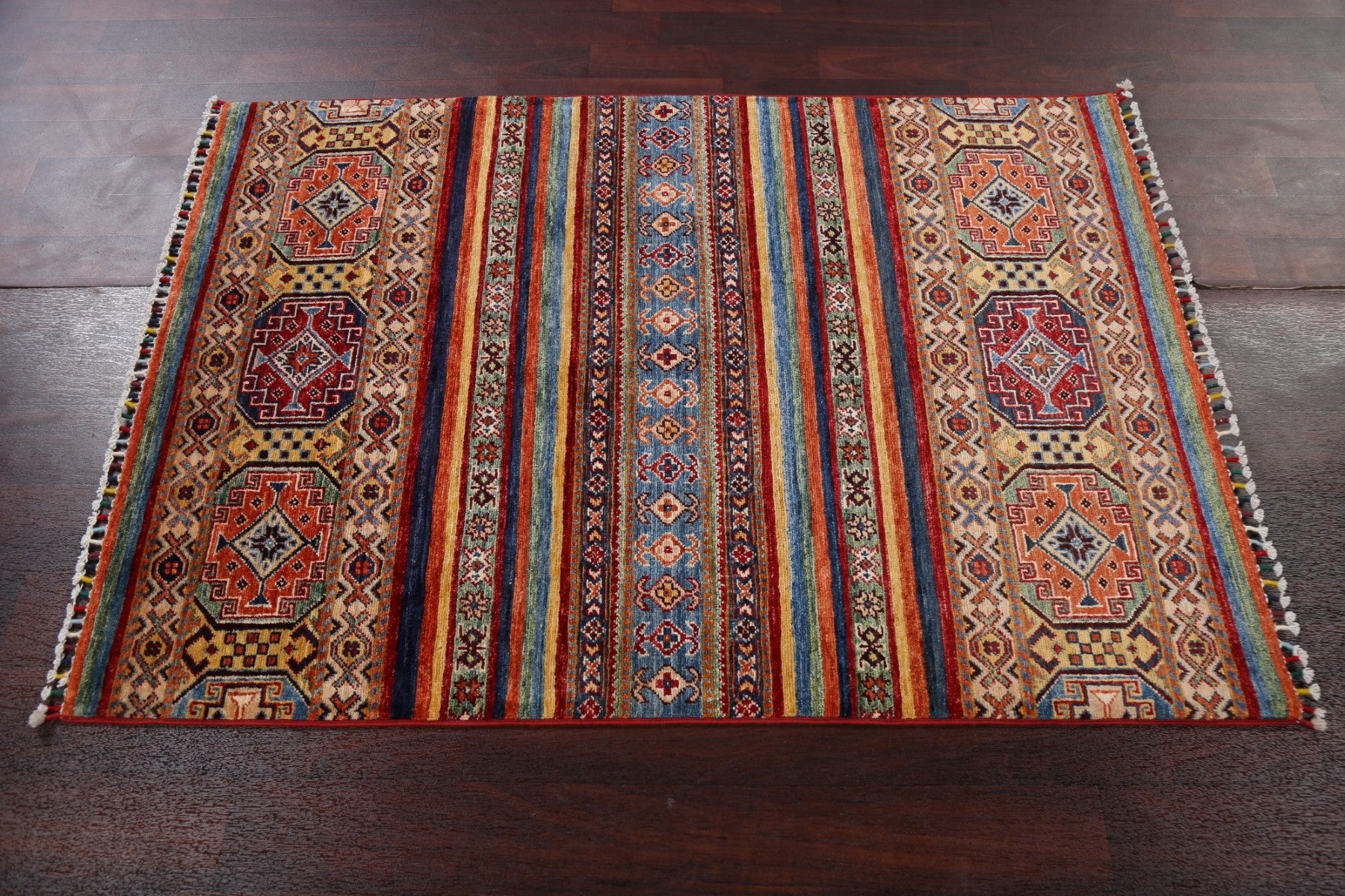 A Beautiful Genuine Pakistan Kazak rug is Hand Knotted by skillful weavers in Pakistan with 100% Wool Material. This rug is in New, First Quality condition. dimensions are 4' 10'' X 3' 4'' in foot and 147 X 102 in centimeter. the primary color is Multi-Colored.