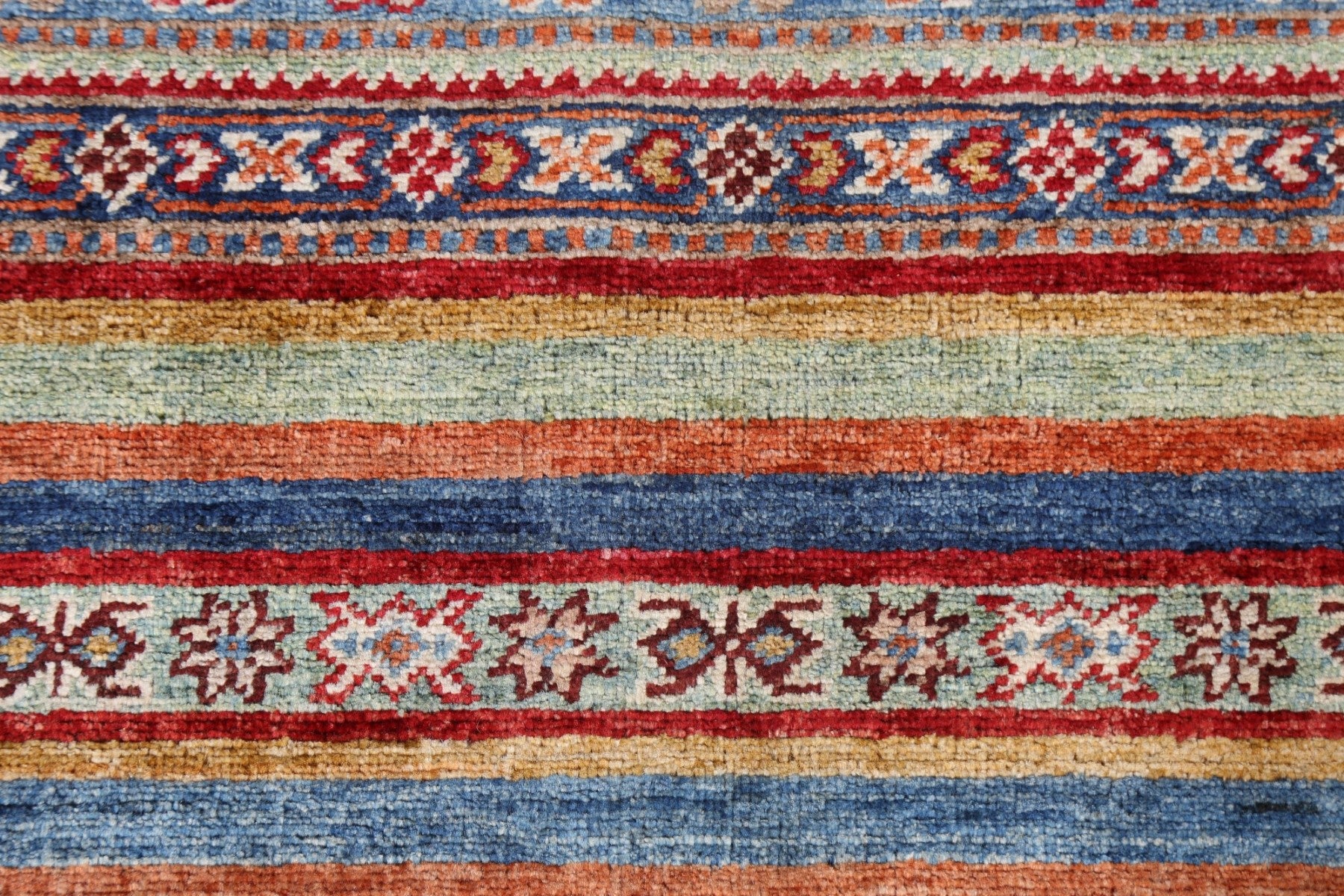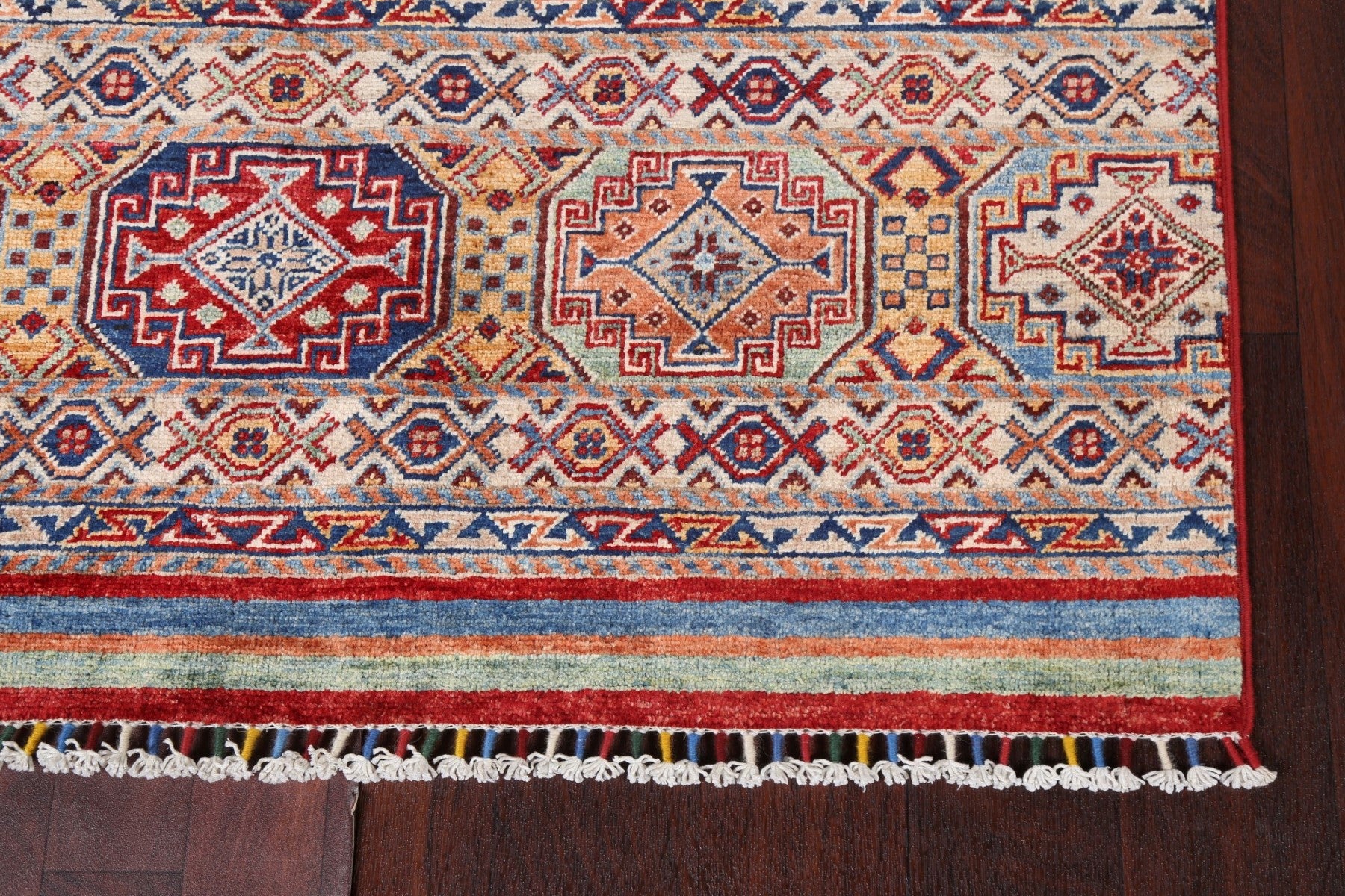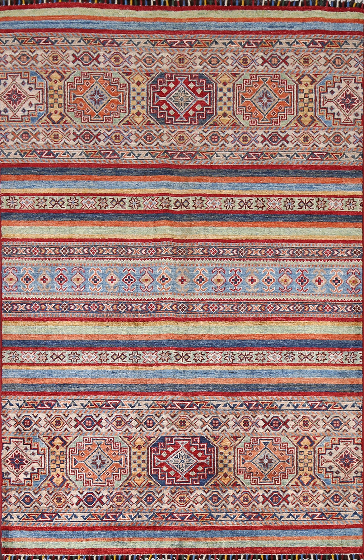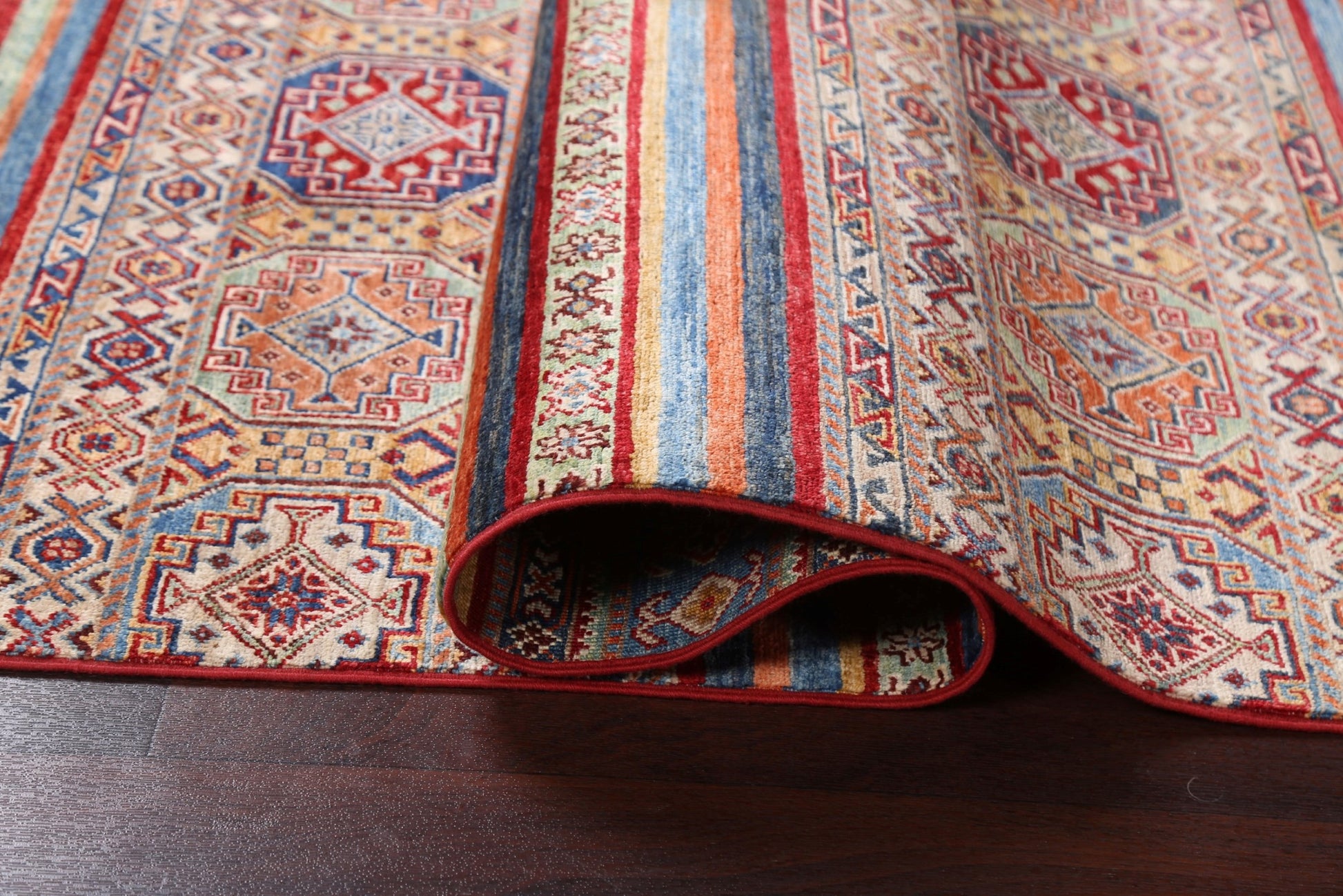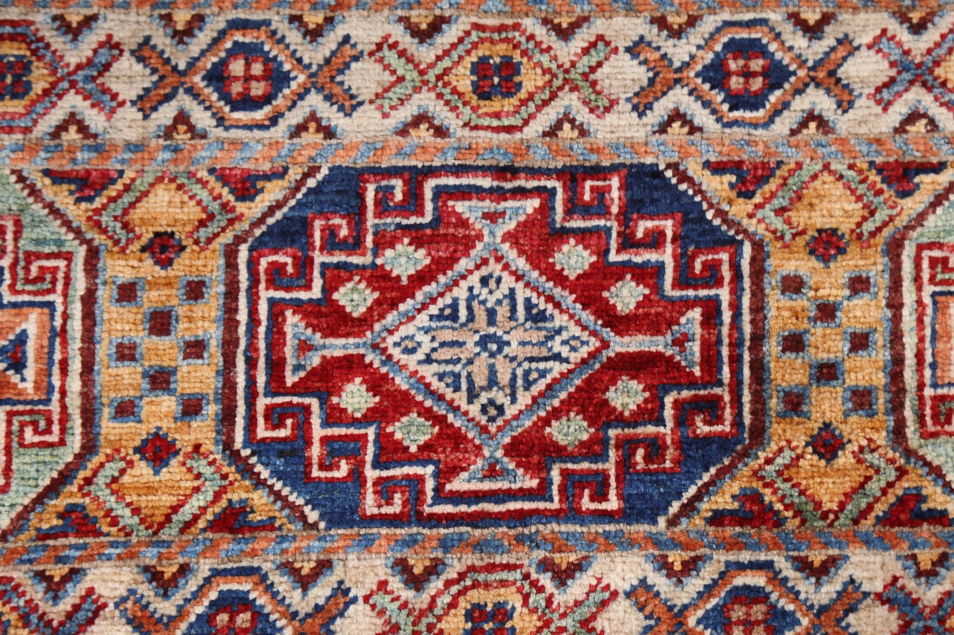 A Beautiful Genuine Pakistan Kazak rug is Hand Knotted by skillful weavers in Pakistan with 100% Wool Material. This rug is in New, First Quality condition. dimensions are 5' 10'' X 4' 1'' in foot and 178 X 124 in centimeter. the primary color is Multi-Colored.
