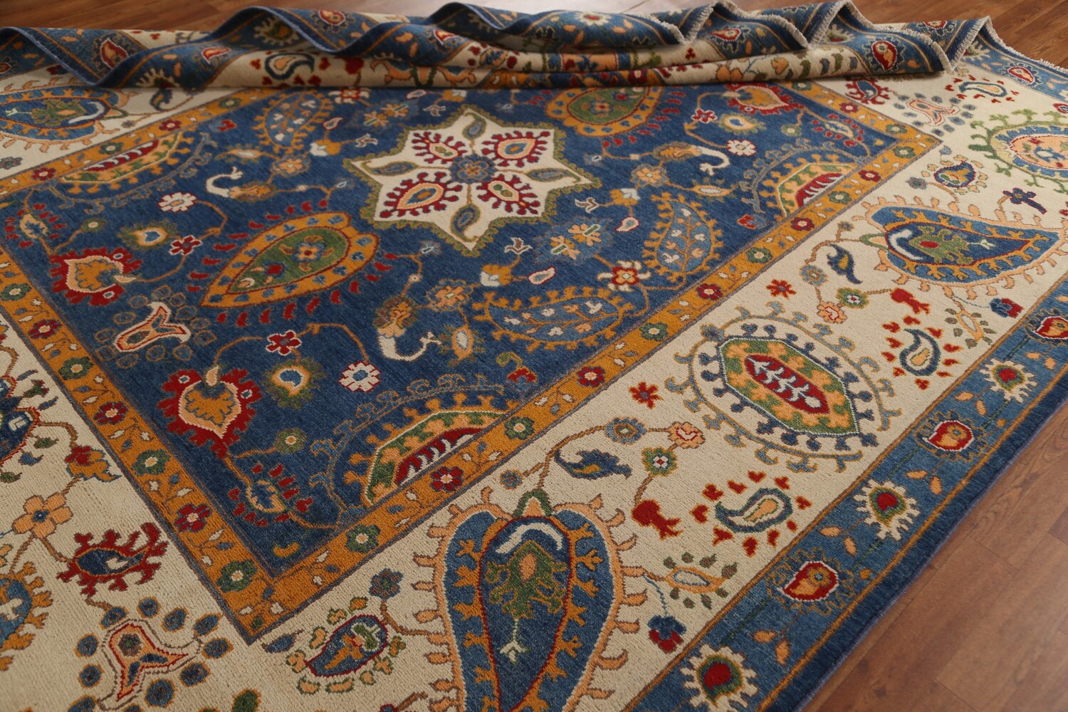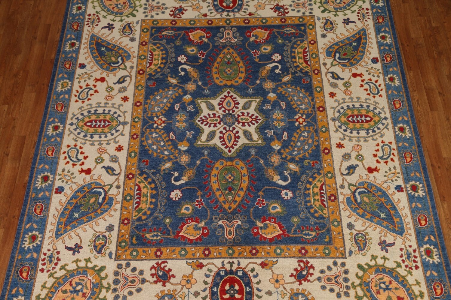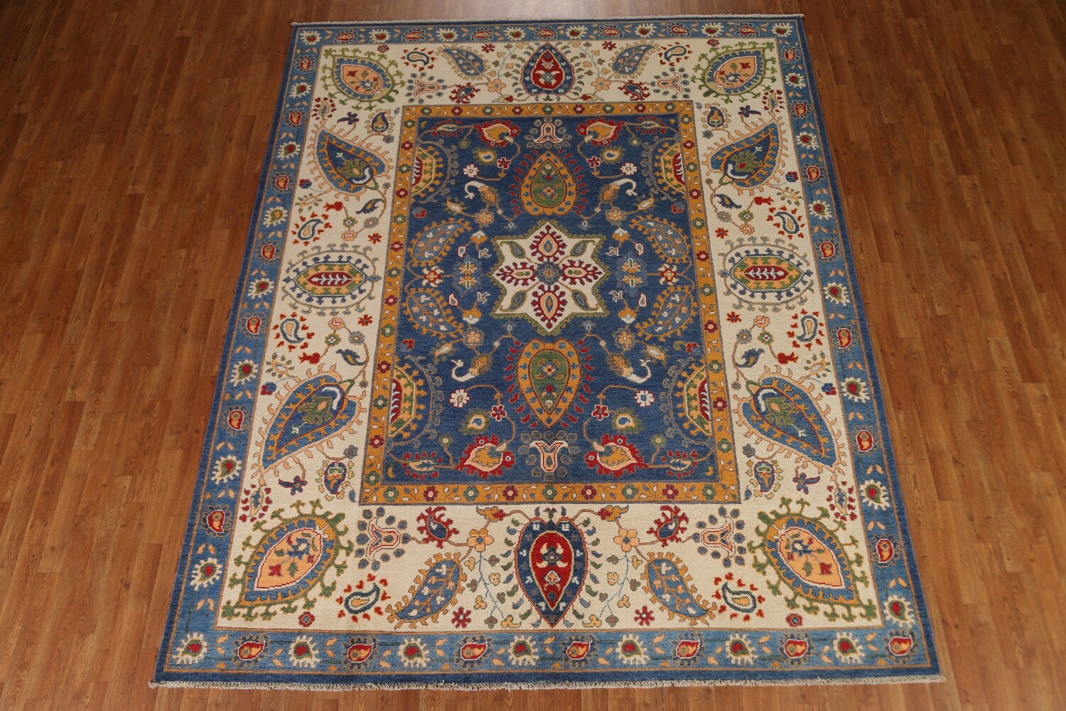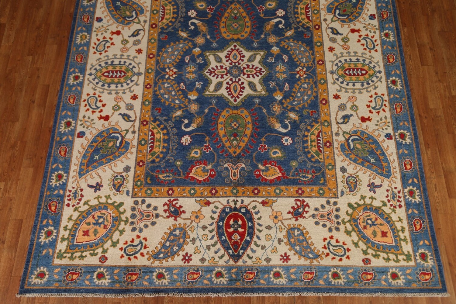 A Beautiful Genuine Pakistan Kazak rug is Hand Knotted by skillful weavers in Pakistan with 100% Wool Material. This rug is in condition. dimensions are 10' 0'' X 8' 1'' in foot and 305 X 246 in centimeter. the primary color is Navy Blue & Blues.