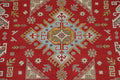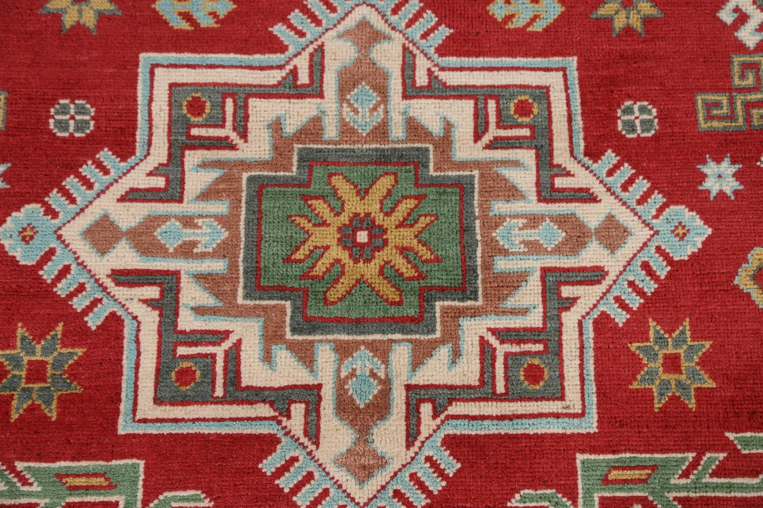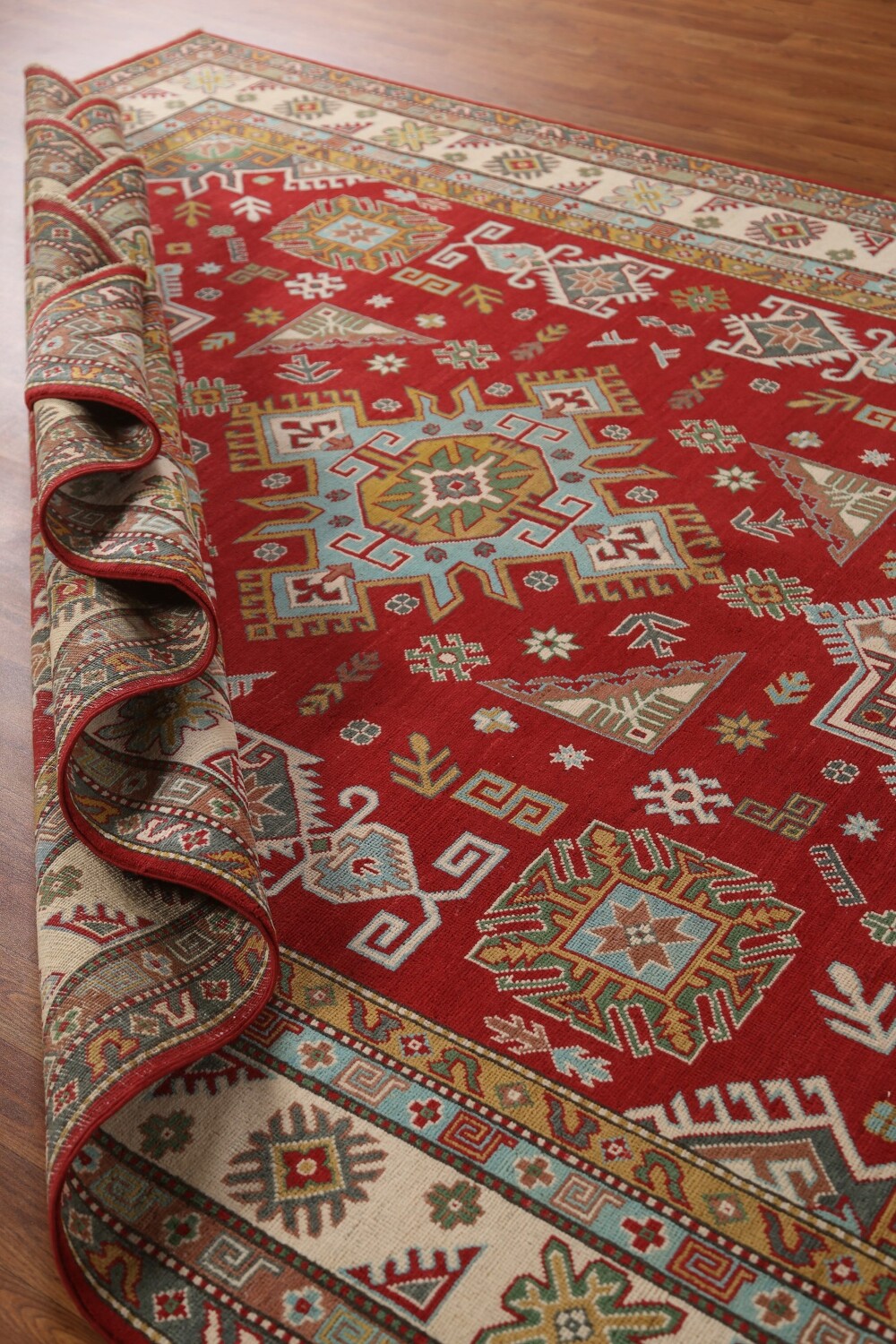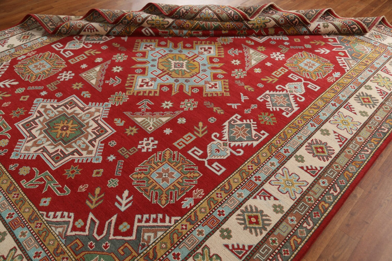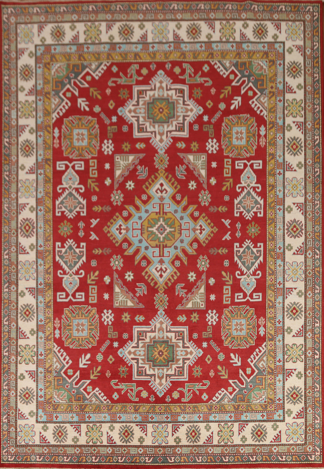 A Beautiful Genuine Pakistan Kazak rug is Hand Knotted by skillful weavers in Pakistan with 100% Wool Material. This rug is in New, First Quality condition. dimensions are 9' 10'' X 7' 9'' in foot and 300 X 236 in centimeter. the primary color is Red.