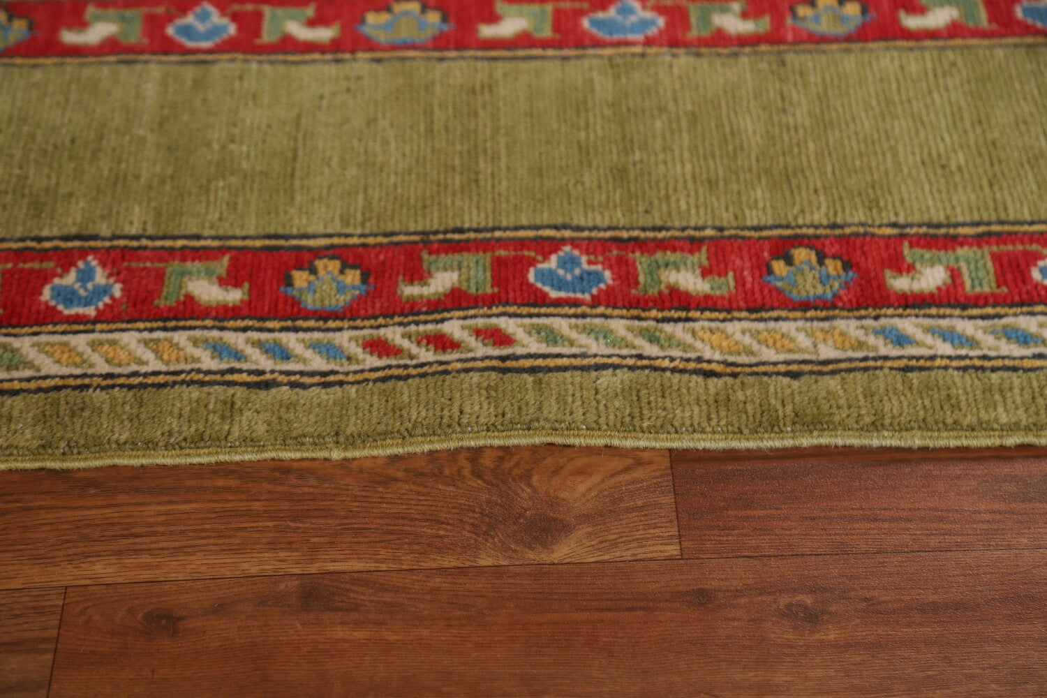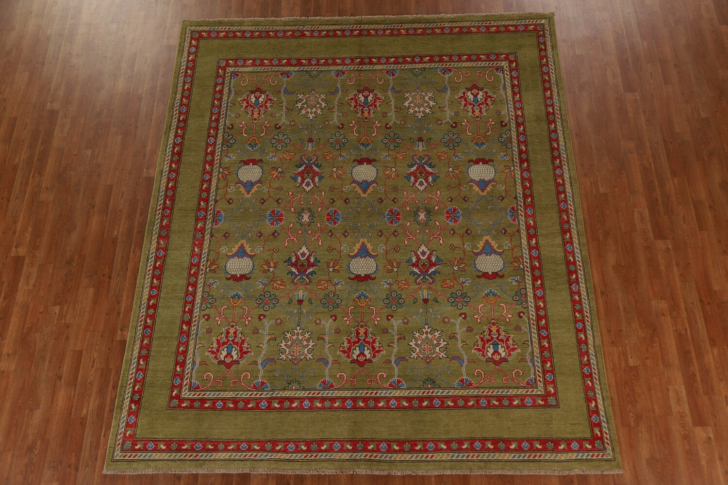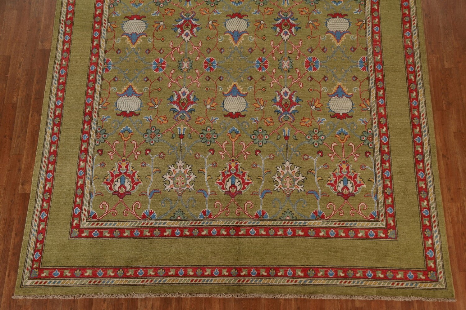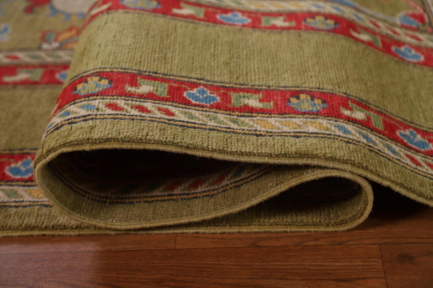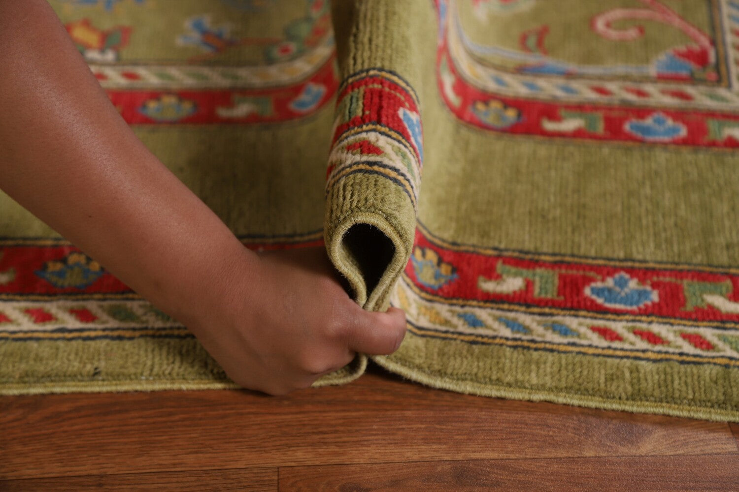 A Beautiful Genuine Pakistan Kazak rug is Hand Knotted by skillful weavers in Pakistan with 100% Wool Material. This rug is in condition. dimensions are 9' 3'' X 8' 1'' in foot and 282 X 246 in centimeter. the primary color is Green.