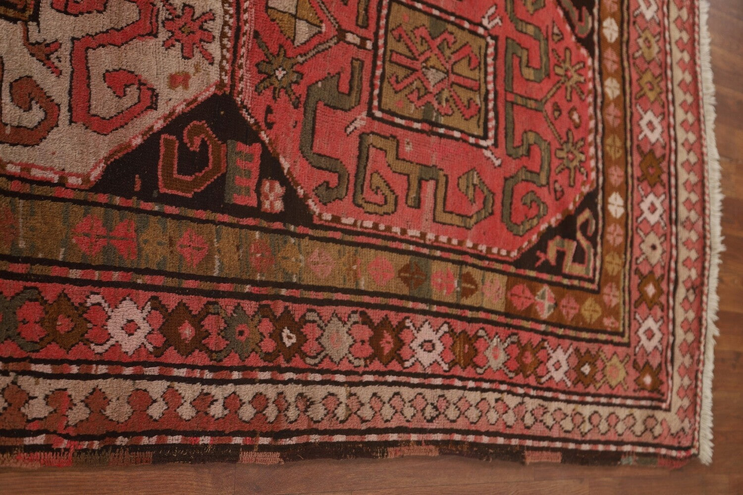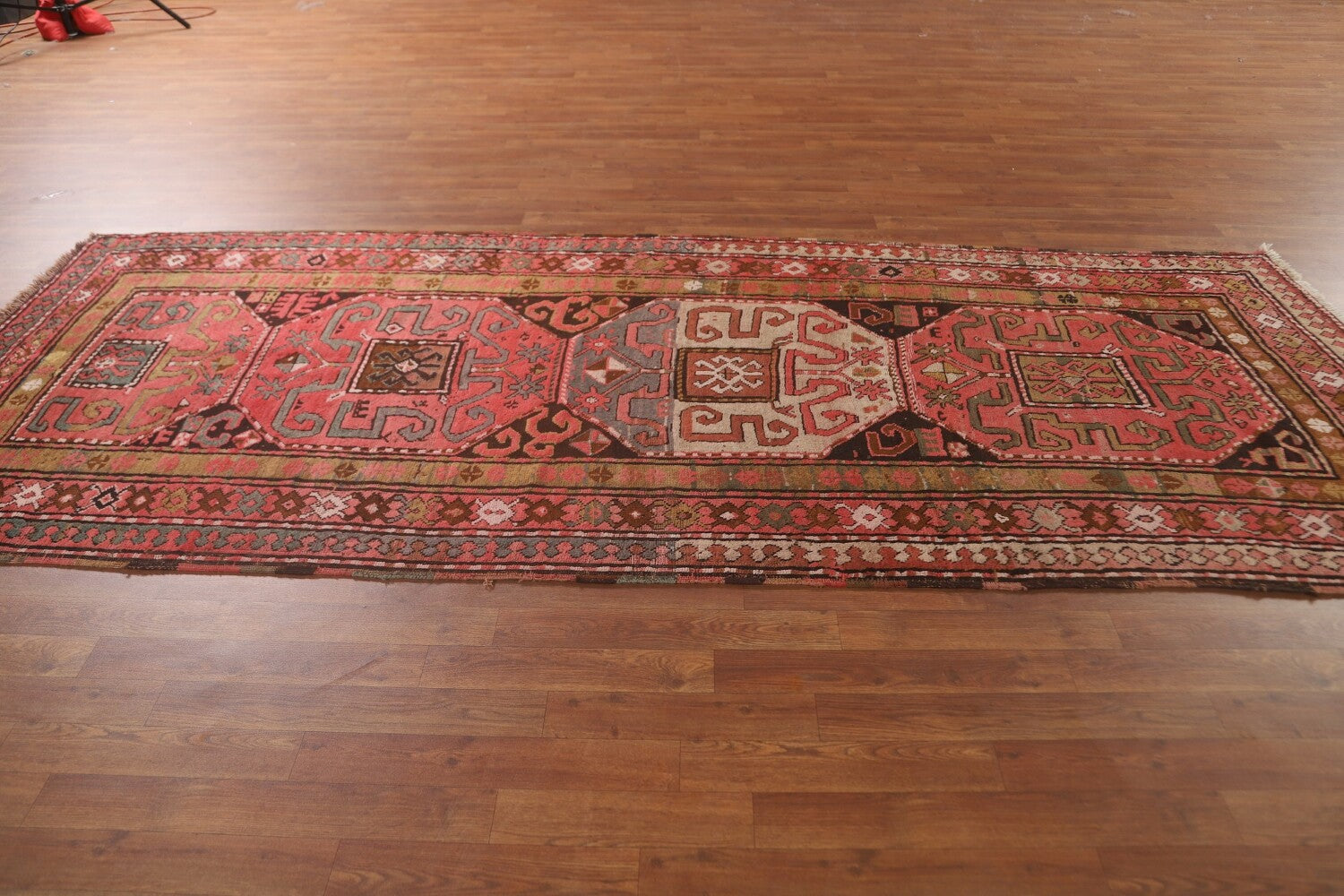 A Beautiful Genuine Russia Kazak rug is Hand Knotted by skillful weavers in Russia with 100% Wool Material. This rug is in Very Good (Low Pile) condition. dimensions are 10' 10'' X 4' 3'' in foot and 330 X 130 in centimeter. the primary color is Pink.