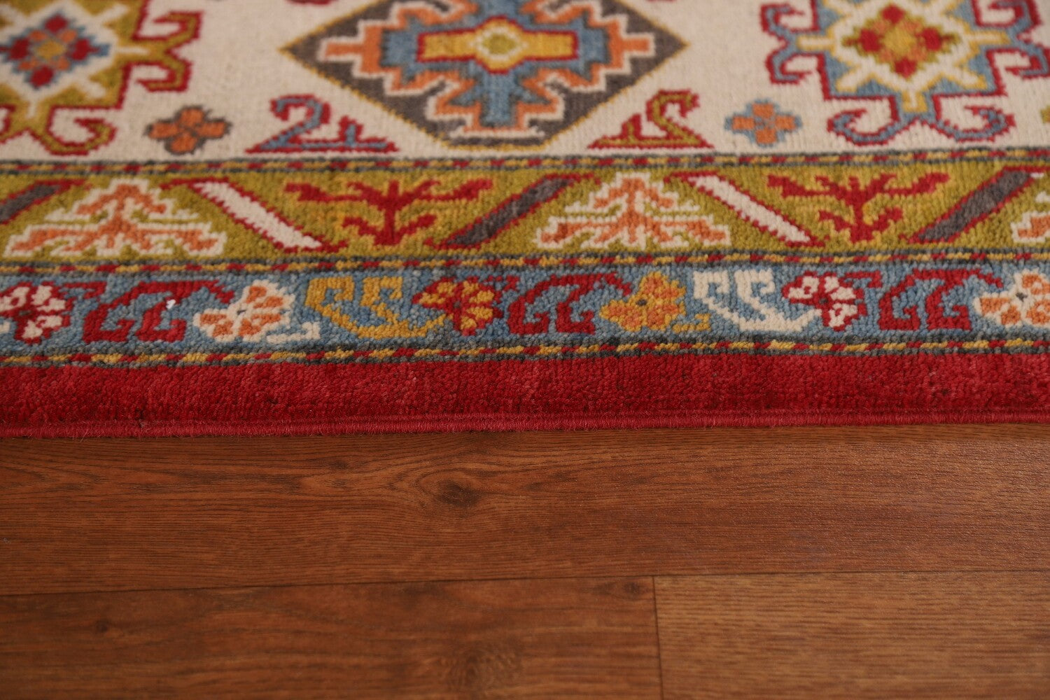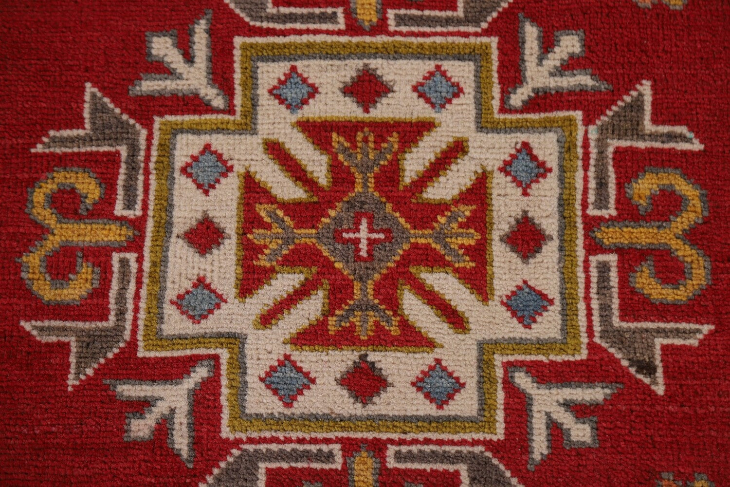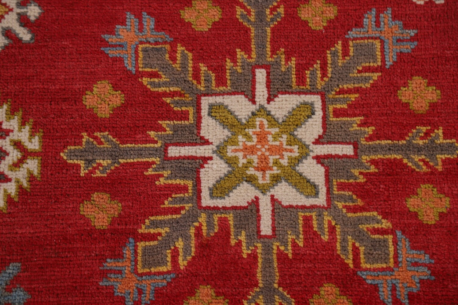 A Beautiful Genuine Pakistan Kazak rug is Hand Knotted by skillful weavers in Pakistan with 100% Wool Material. This rug is in New, First Quality condition. dimensions are 9' 11'' X 8' 1'' in foot and 302 X 246 in centimeter. the primary color is Red.