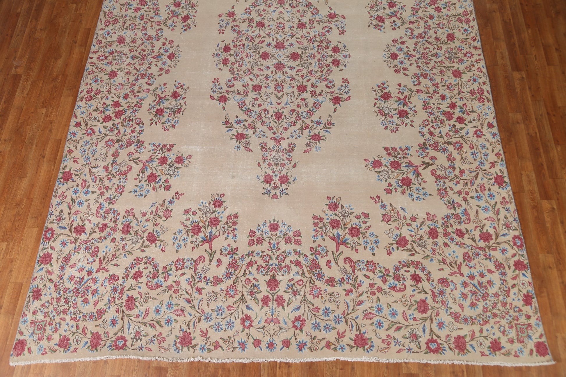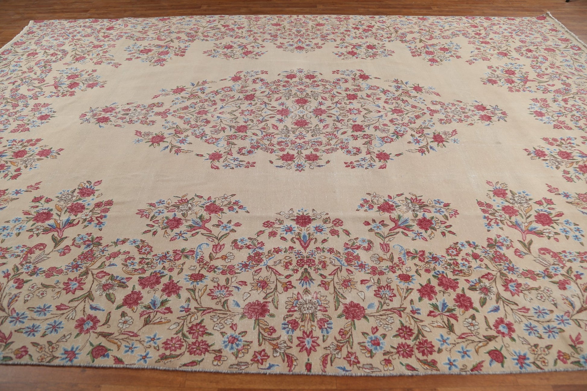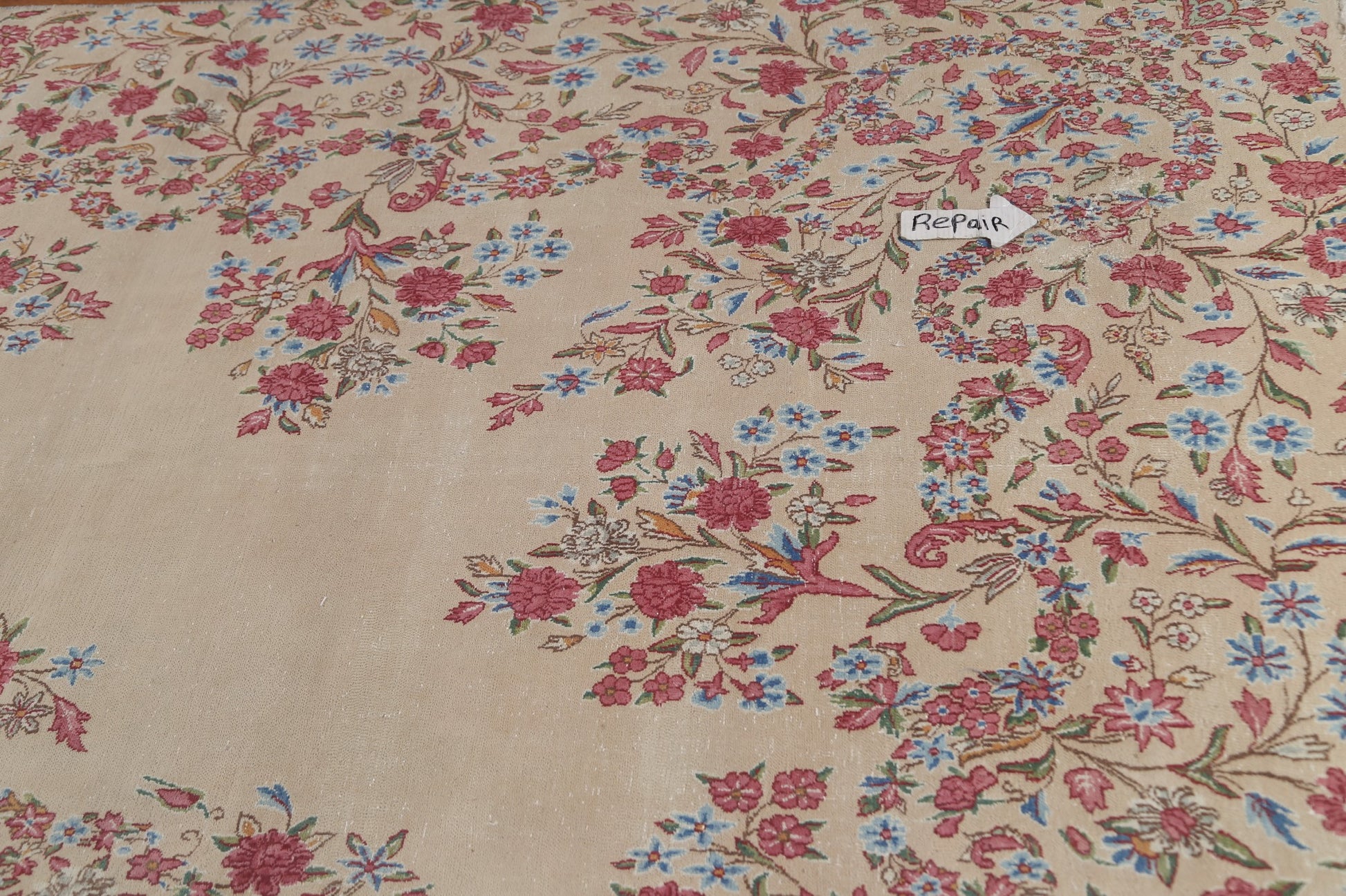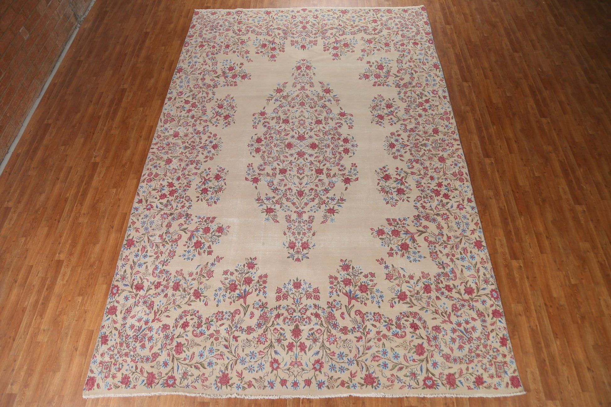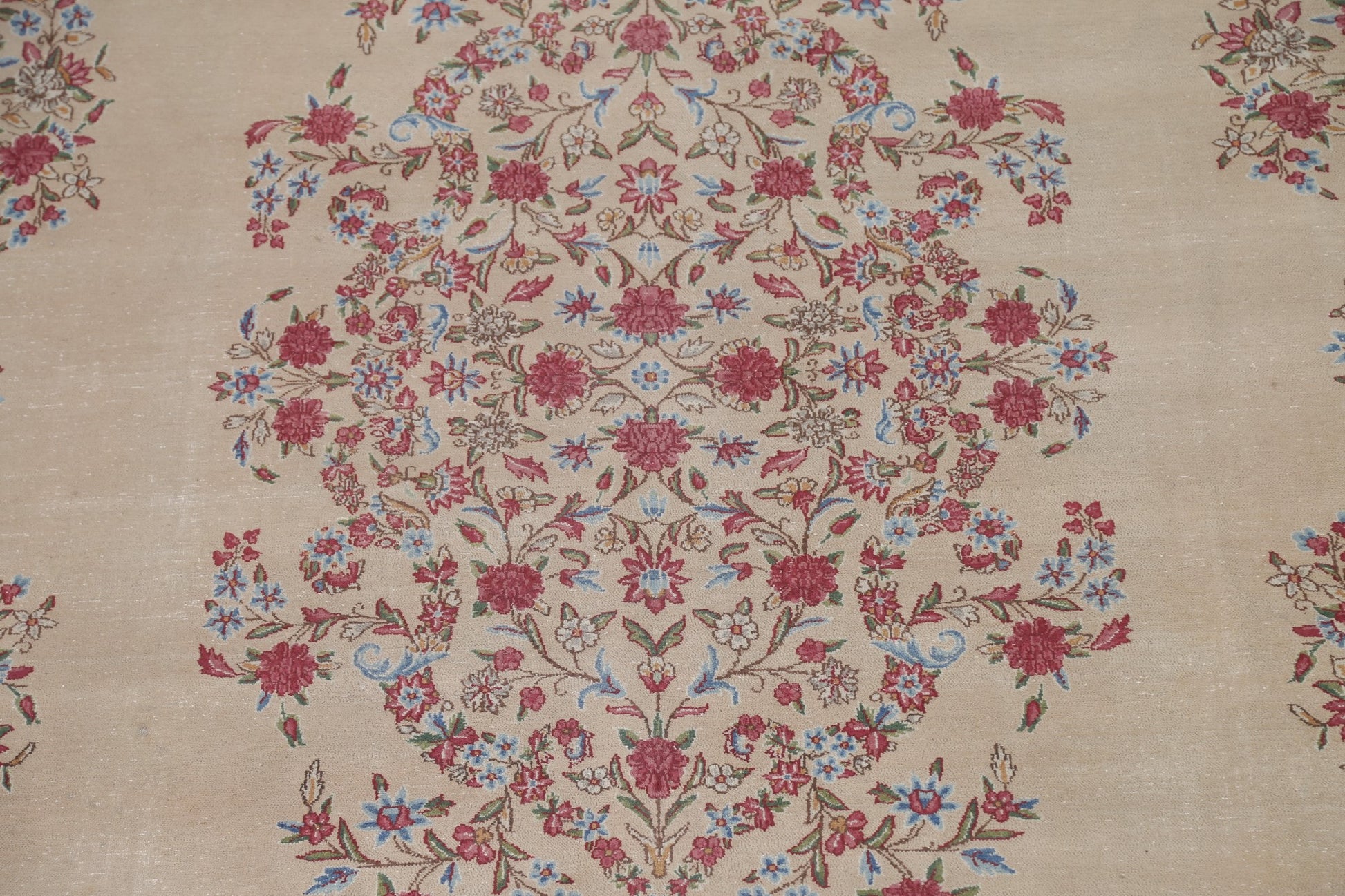 A Beautiful Genuine Persia ( Persia ) Kerman rug is Hand Knotted by skillful weavers in Persia ( Persia ) with 100% Wool Material. This rug is in Very Good (Evenly Low Pile-small Repair) condition. dimensions are 14' 3'' X 9' 5'' in foot and 434 X 287 in centimeter. the primary color is Beige & Ivories.
