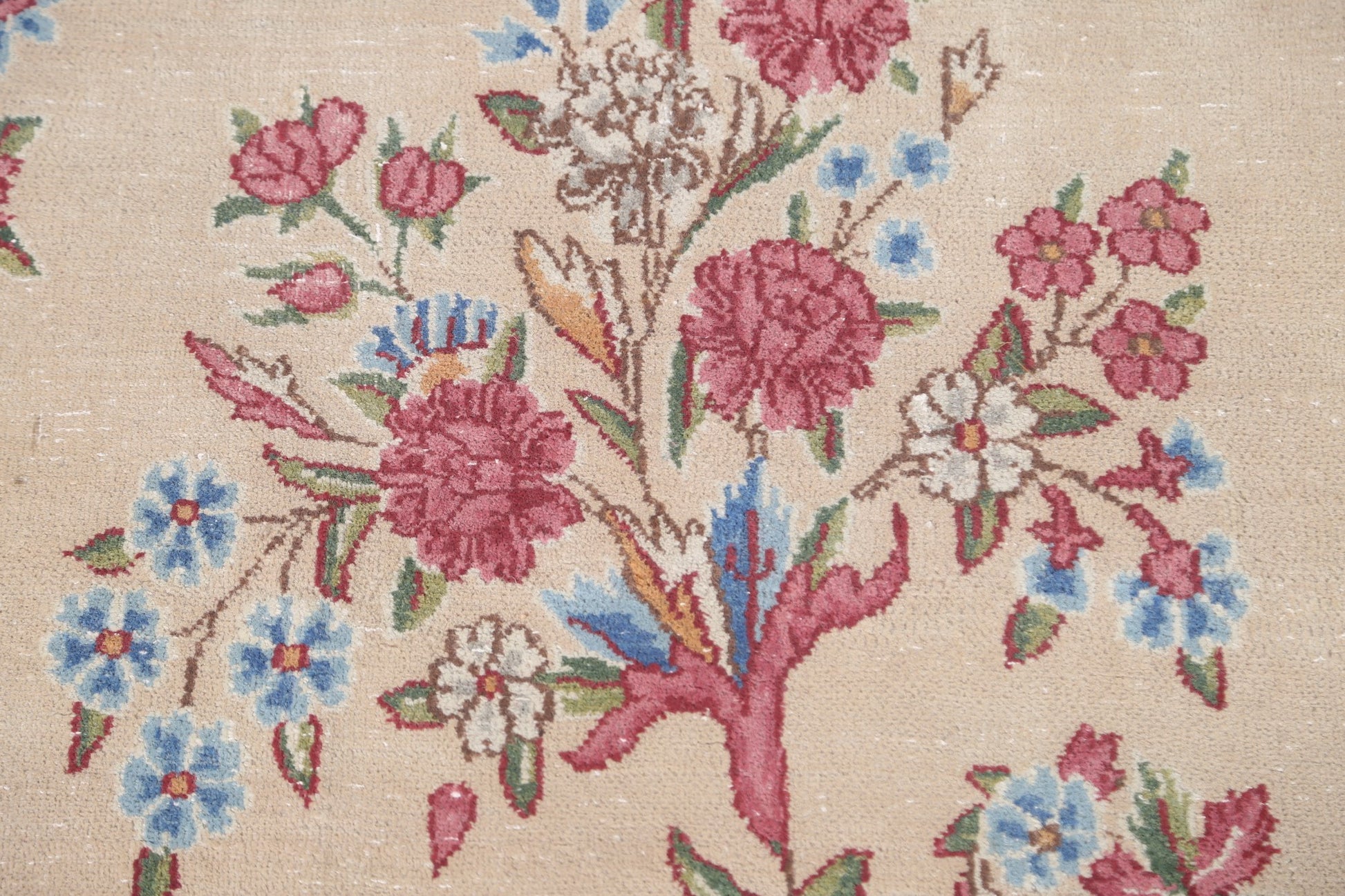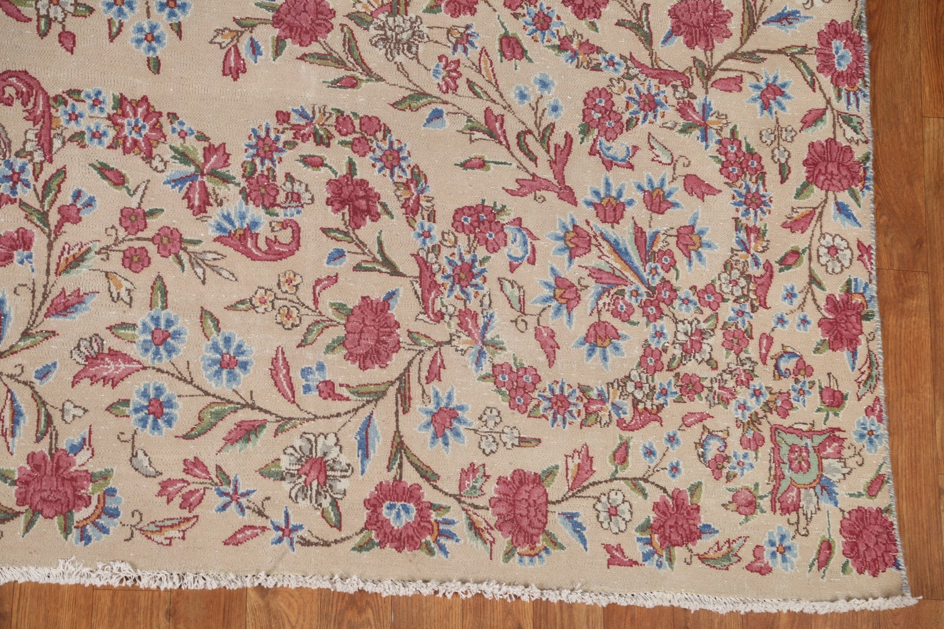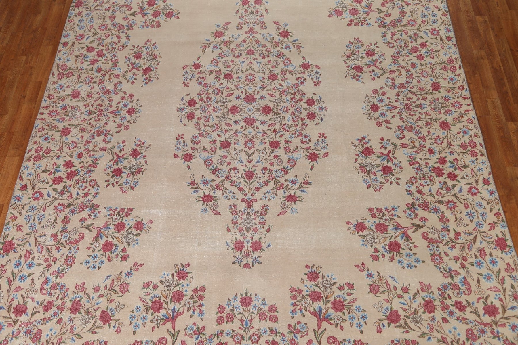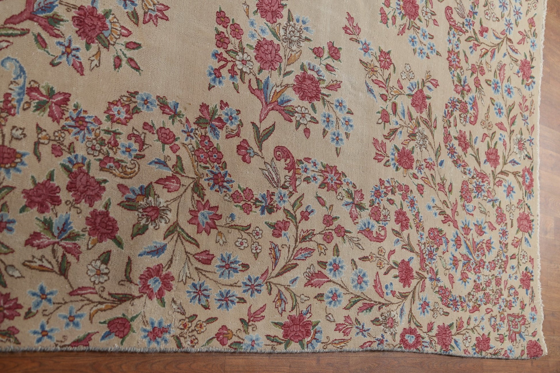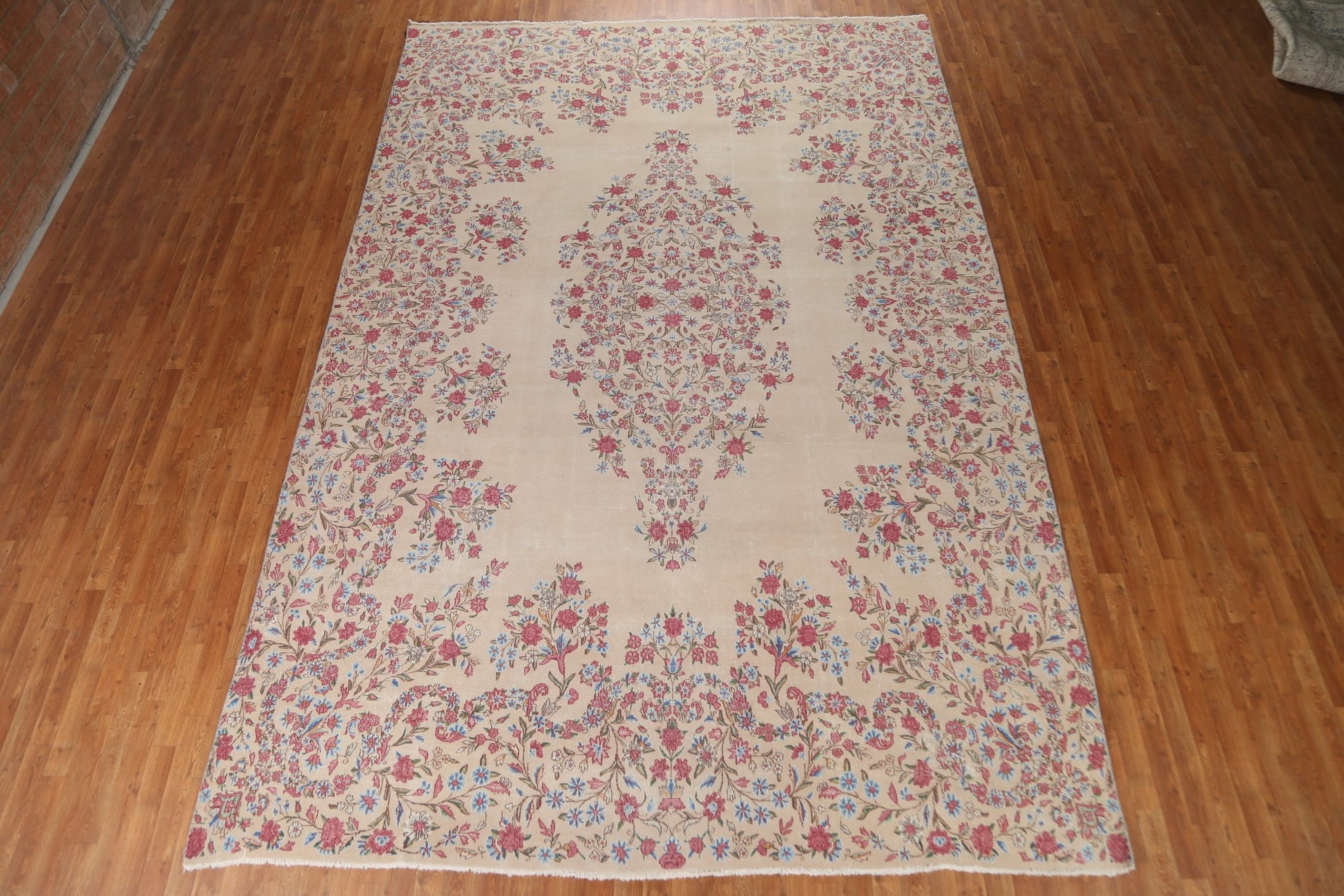 A Beautiful Genuine Persia ( Persia ) Kerman rug is Hand Knotted by skillful weavers in Persia ( Persia ) with 100% Wool Material. This rug is in Very Good (Evenly Low Pile-small Repair) condition. dimensions are 14' 3'' X 9' 5'' in foot and 434 X 287 in centimeter. the primary color is Beige & Ivories.