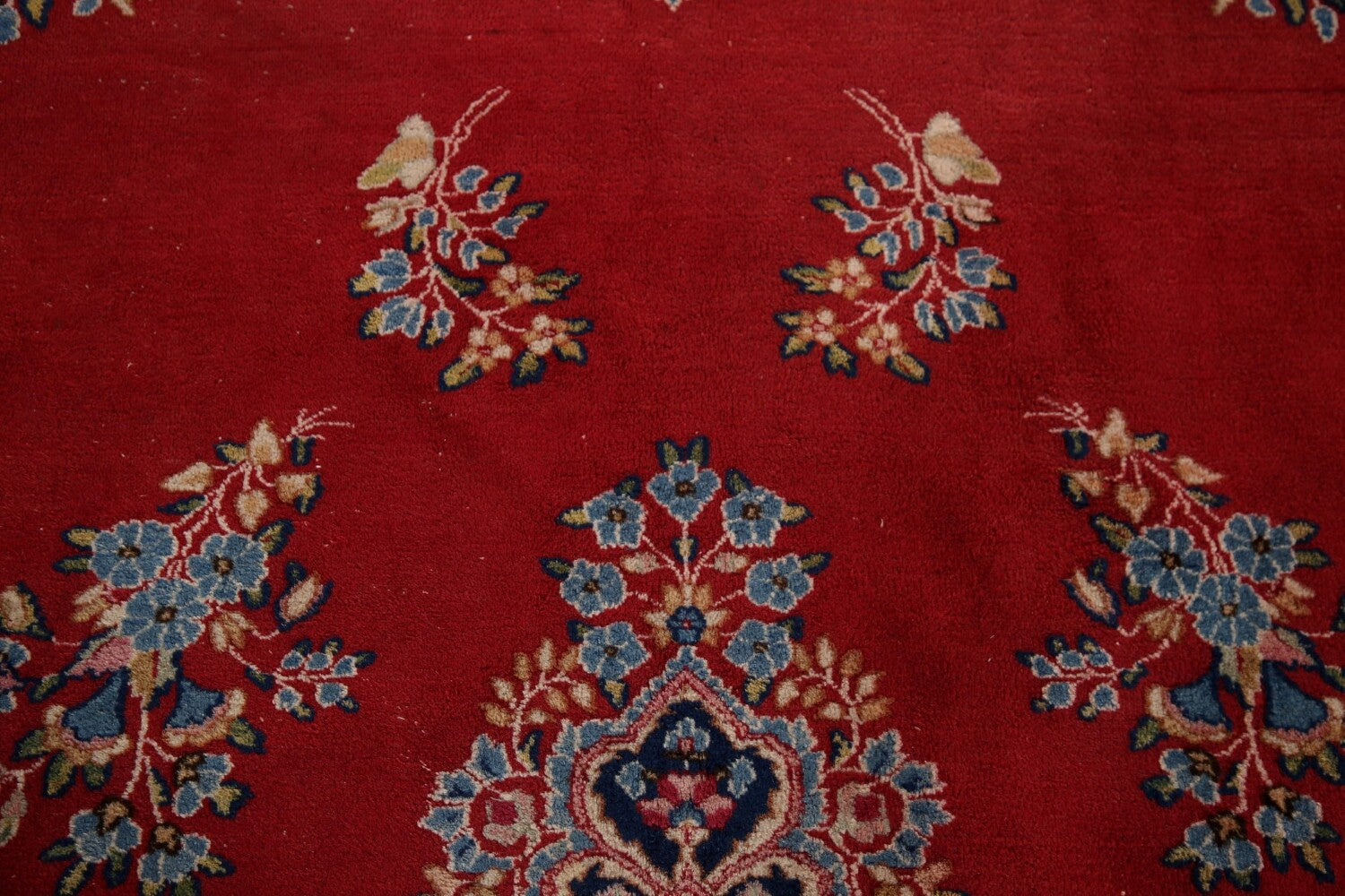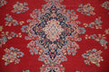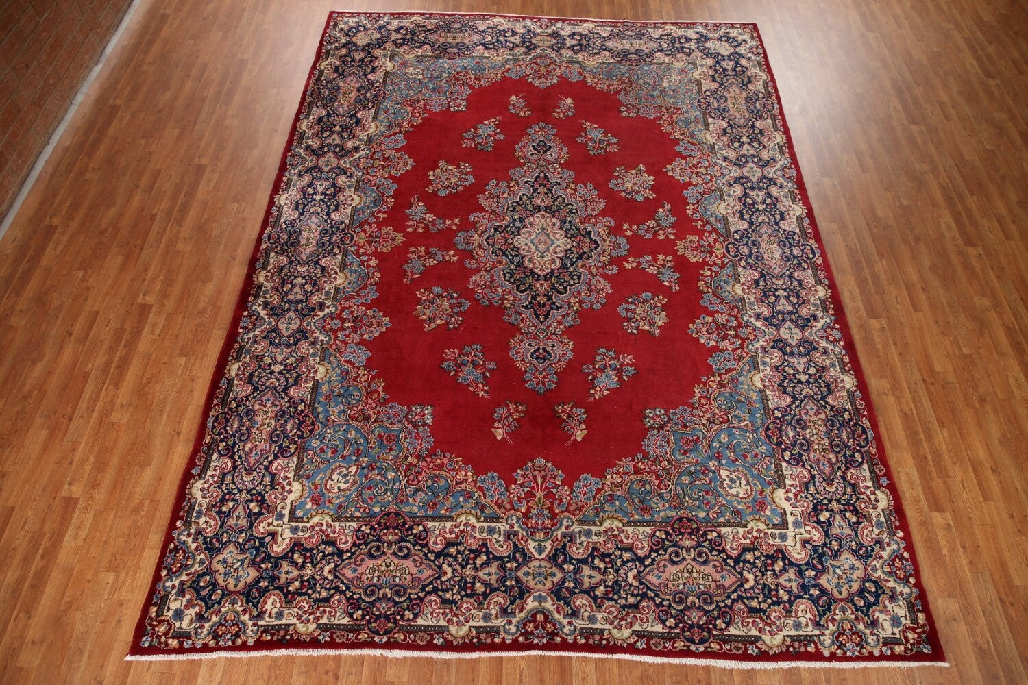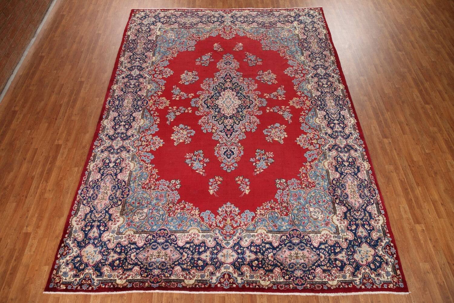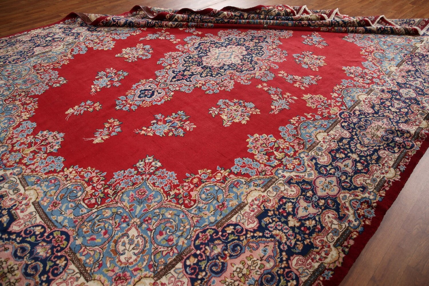 A Beautiful Genuine Persia ( Persia ) Kerman rug is Hand Knotted by skillful weavers in Persia ( Persia ) with 100% Wool Material. This rug is in Very Good (Low Pile) condition. dimensions are 13' 6'' X 9' 9'' in foot and 411 X 297 in centimeter. the primary color is Red.