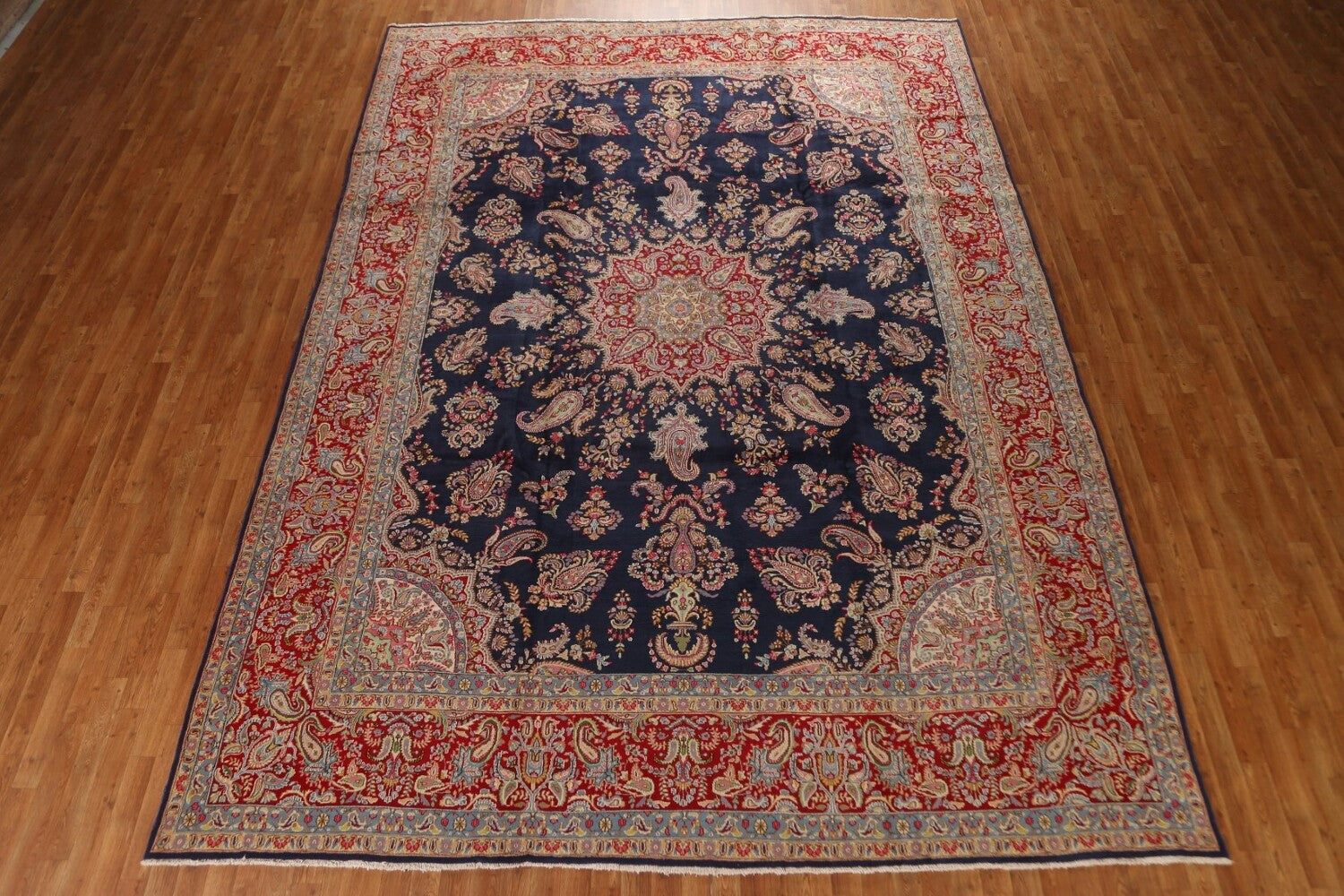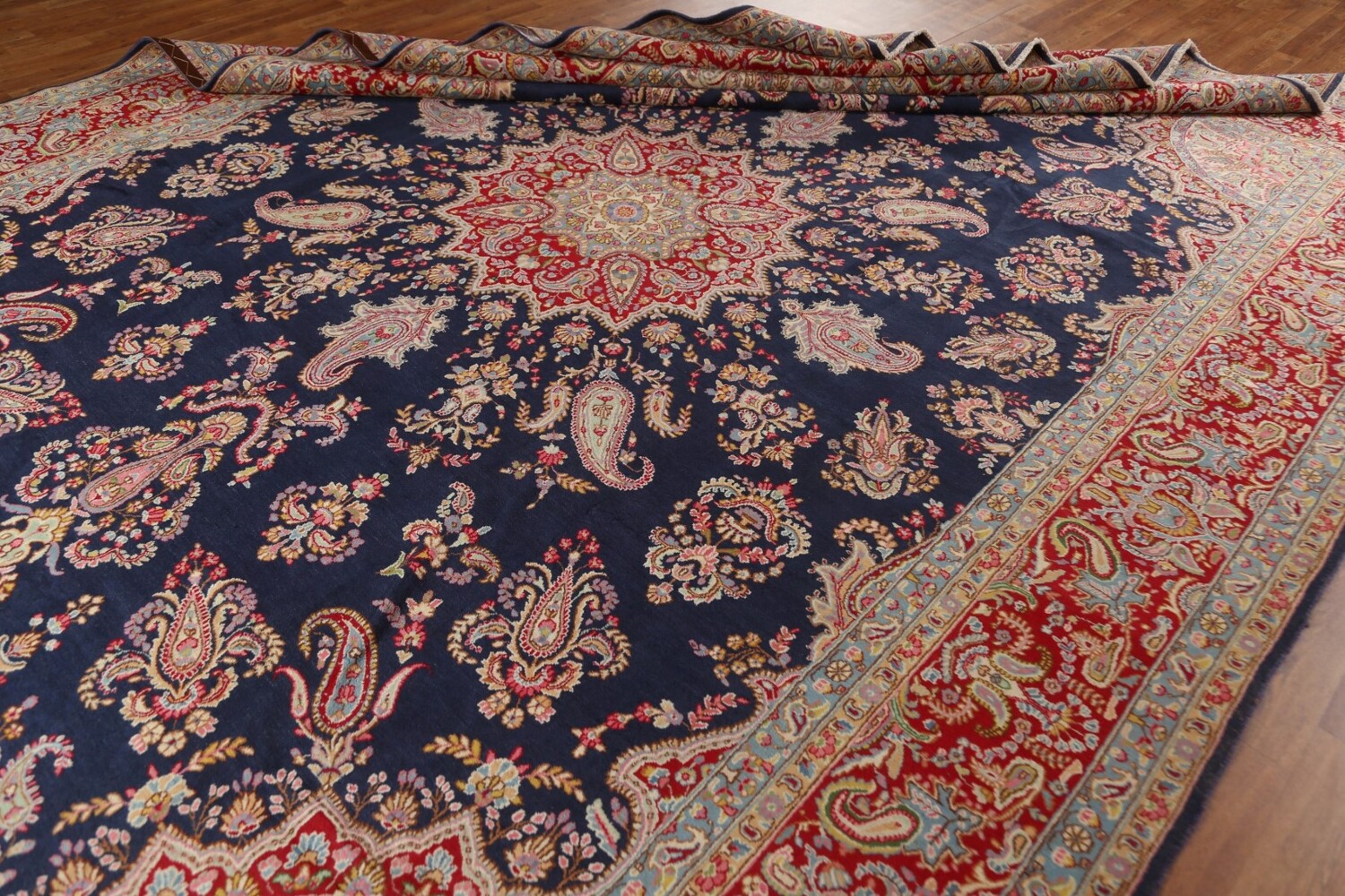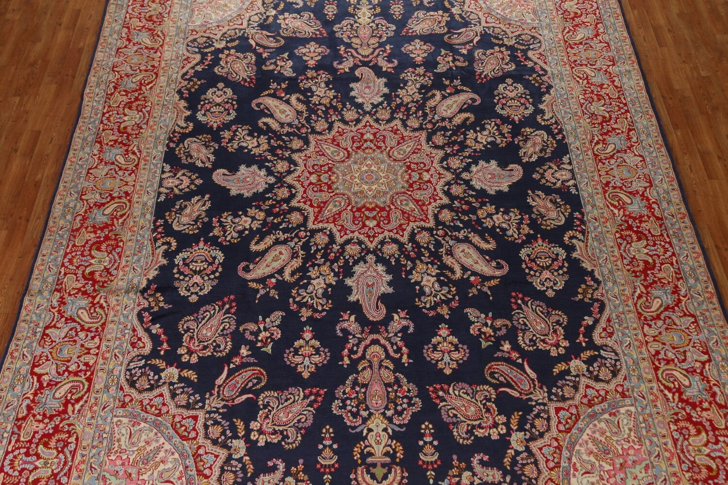 A Beautiful Genuine Persia ( Persia ) Kerman rug is Hand Knotted by skillful weavers in Persia ( Persia ) with 100% Wool Material. This rug is in Excellent condition. dimensions are 13' 9'' X 10' 0'' in foot and 419 X 305 in centimeter. the primary color is Navy Blue & Blues.