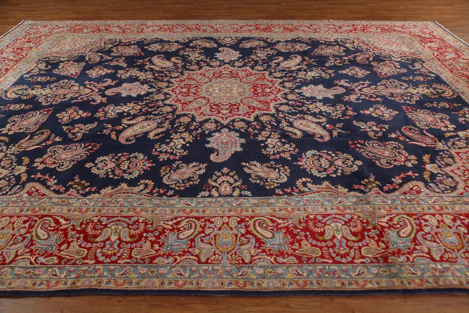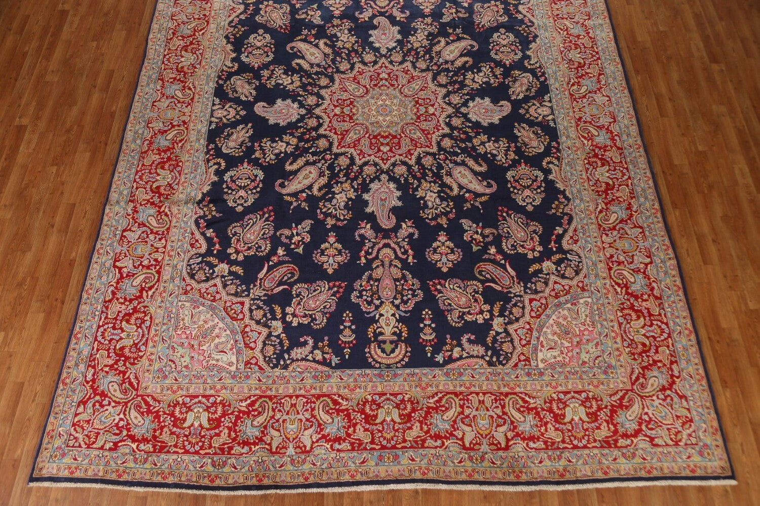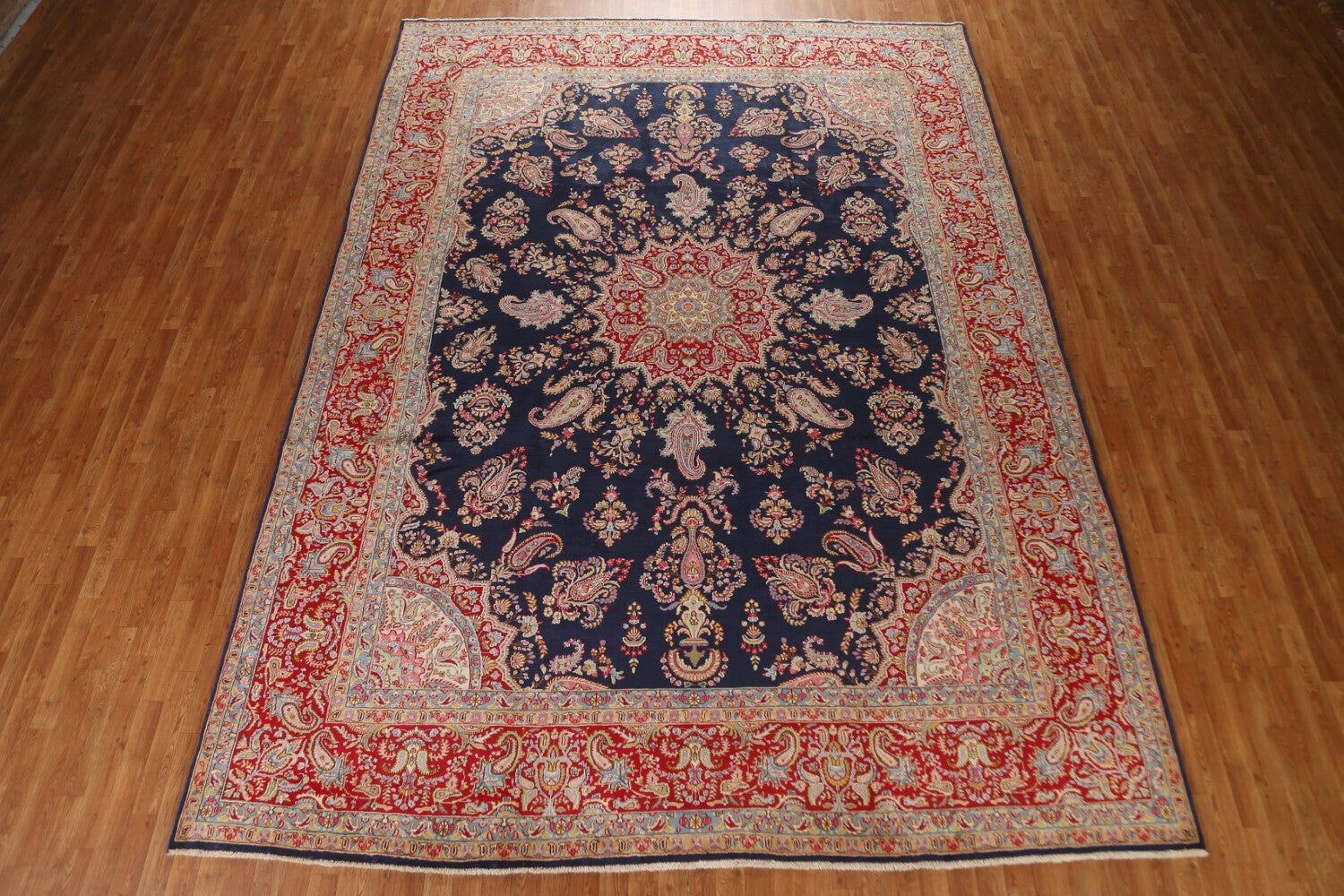 A Beautiful Genuine Persia ( Persia ) Kerman rug is Hand Knotted by skillful weavers in Persia ( Persia ) with 100% Wool Material. This rug is in Excellent condition. dimensions are 13' 9'' X 10' 0'' in foot and 419 X 305 in centimeter. the primary color is Navy Blue & Blues.