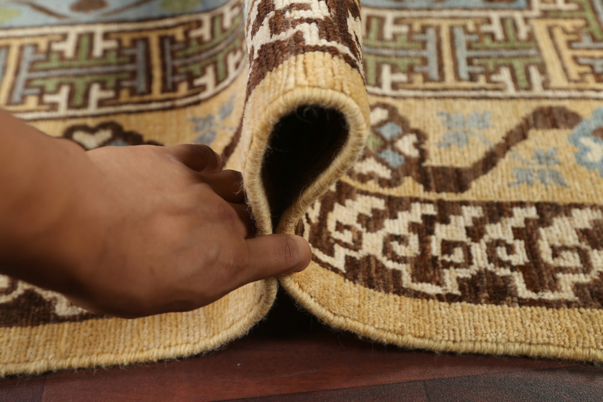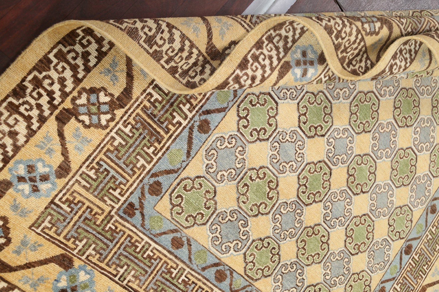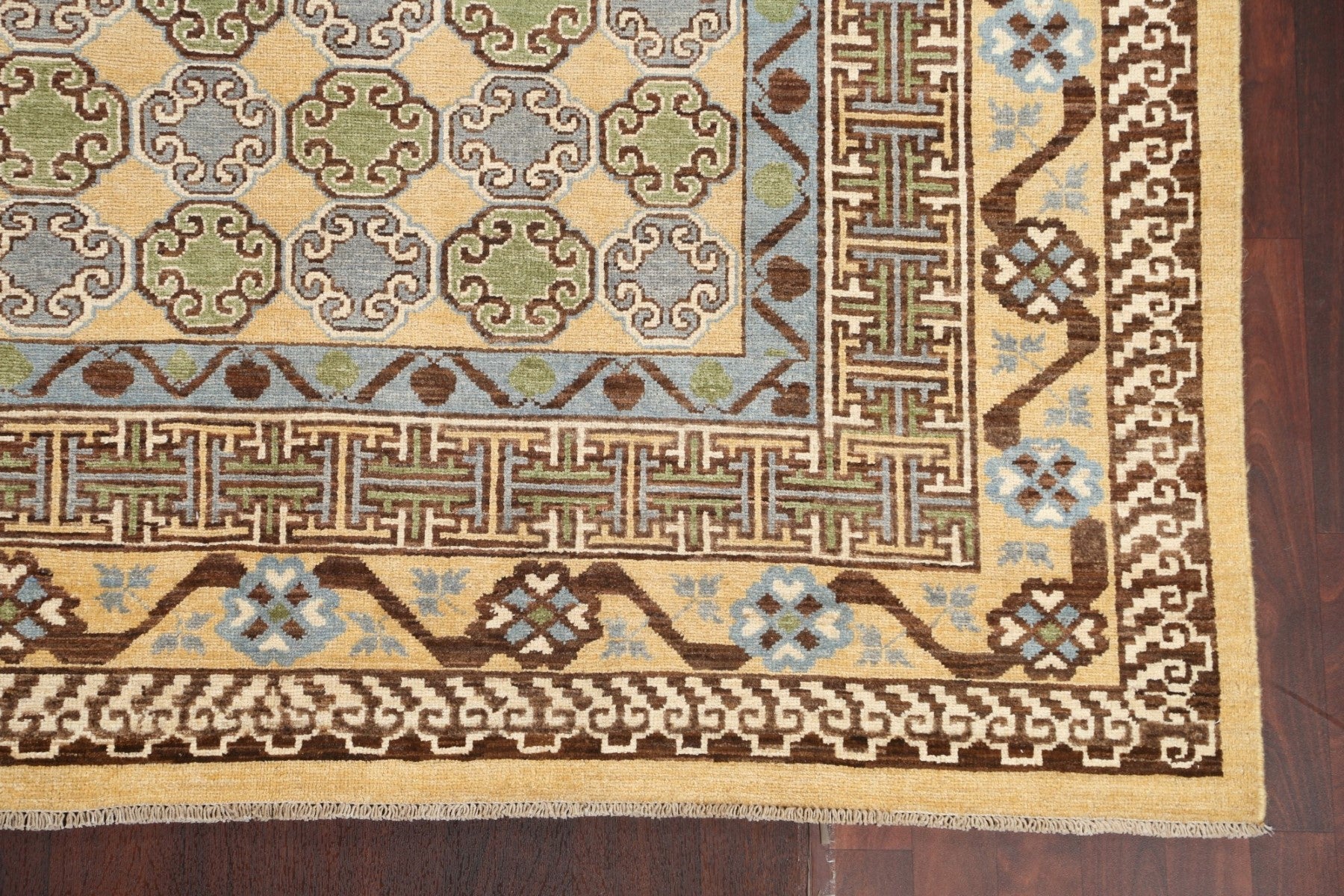 A Beautiful Genuine Pakistan Khotan rug is Hand Knotted by skillful weavers in Pakistan with 100% Wool Material. This rug is in New, First Quality condition. dimensions are 9' 4'' X 6' 4'' in foot and 284 X 193 in centimeter. the primary color is Yellow & Gold.