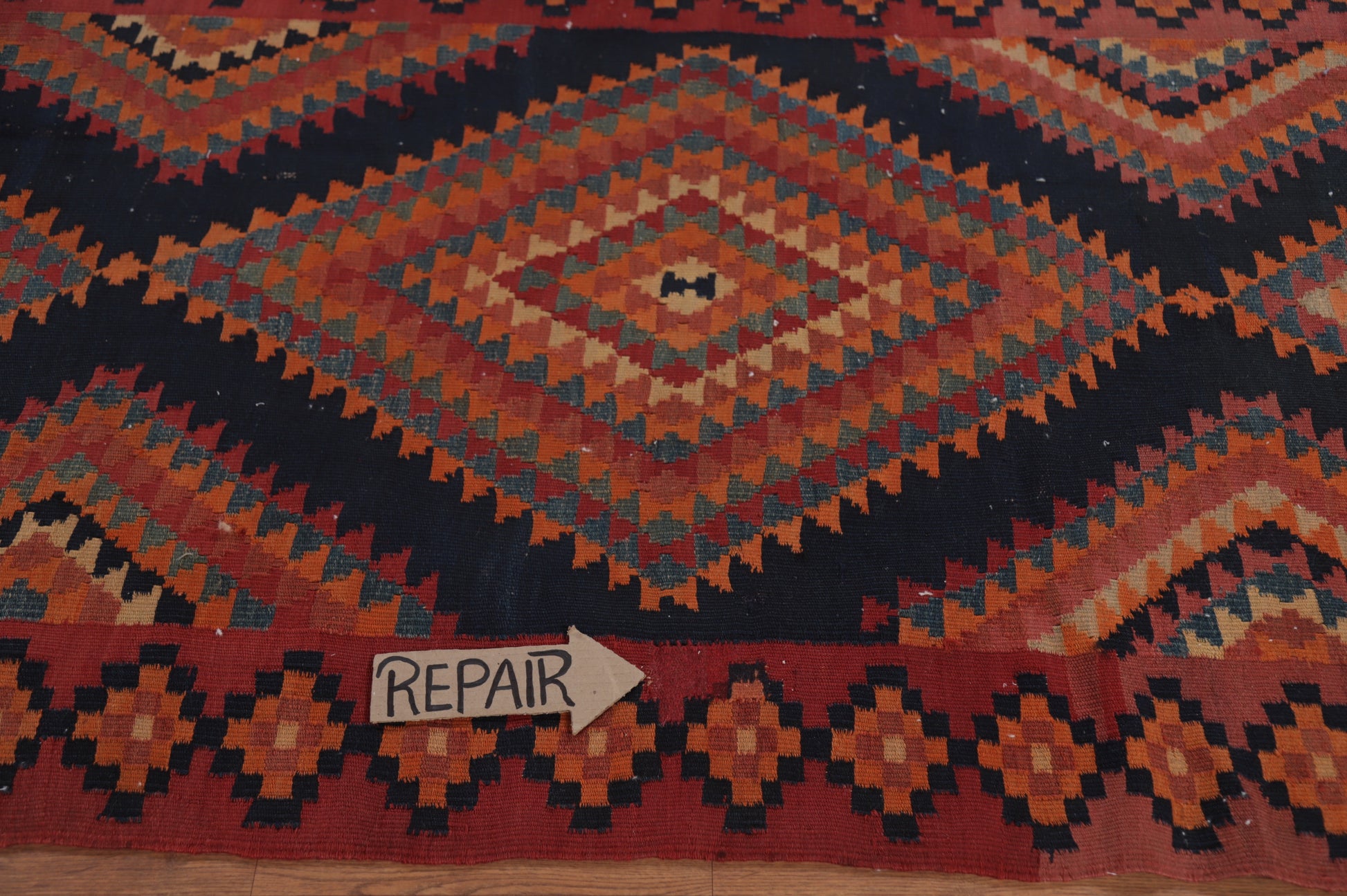 A Beautiful Genuine Persia ( Persia ) Kilim rug is Hand Woven by skillful weavers in Persia ( Persia ) with 100% Wool Material. This rug is in Very Good (Abrash-Repair) condition. dimensions are 14' 8'' X 4' 1'' in foot and 447 X 124 in centimeter. the primary color is Navy Blue & Blues.