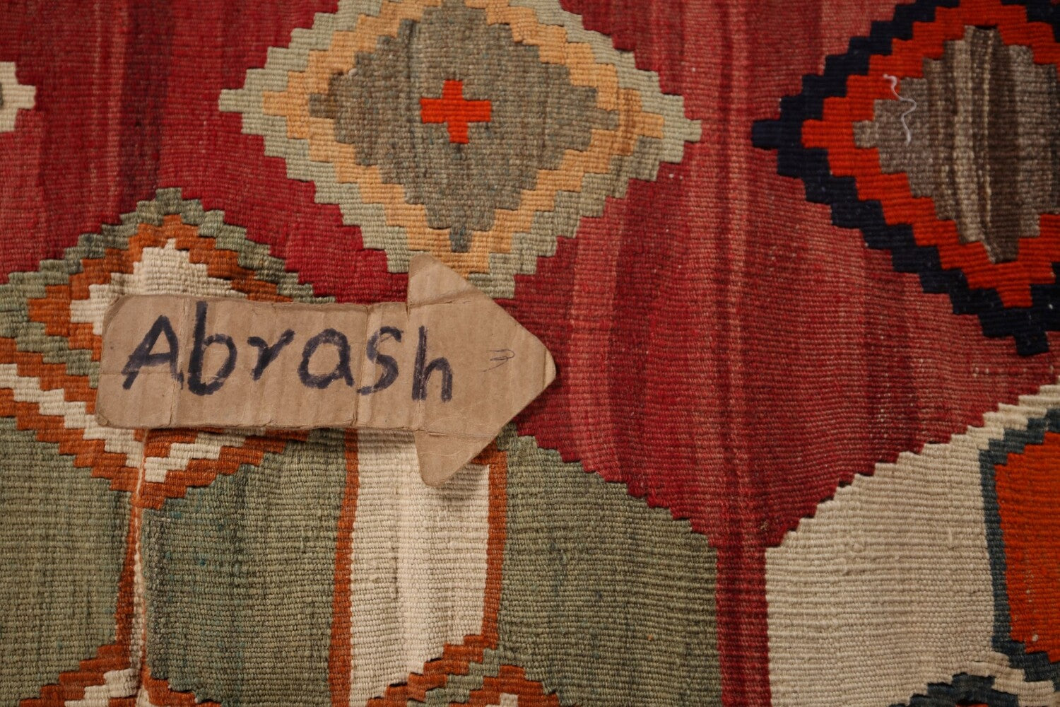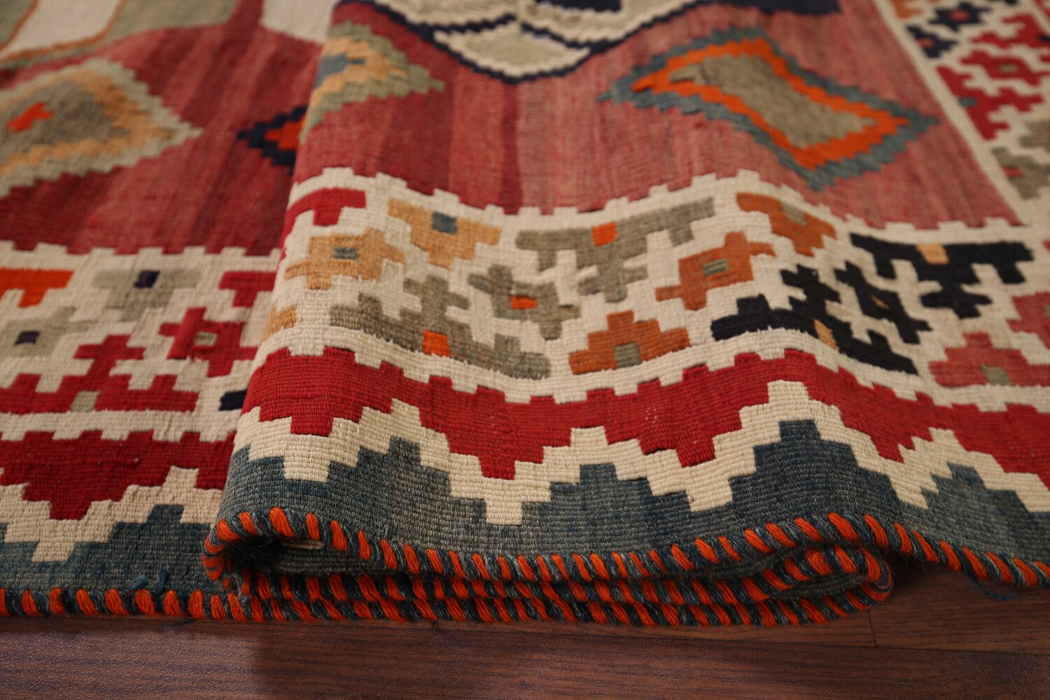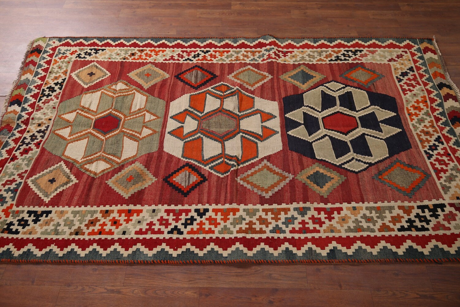 A Beautiful Genuine Persia ( Persia ) Kilim (Qashqai) rug is Hand Woven by skillful weavers in Persia ( Persia ) with 100% Wool Material. This rug is in Very Good (Abrash) condition. dimensions are 6' 9'' X 4' 2'' in foot and 206 X 127 in centimeter. the primary color is Red.