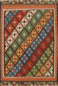 A Beautiful Genuine Persia ( Persia ) Kilim (Qashqai) rug is Hand Woven by skillful weavers in Persia ( Persia ) with 100% Wool Material. This rug is in Very Good condition. dimensions are 4' 8'' X 3' 5'' in foot and 142 X 104 in centimeter. the primary color is Multi-Colored.