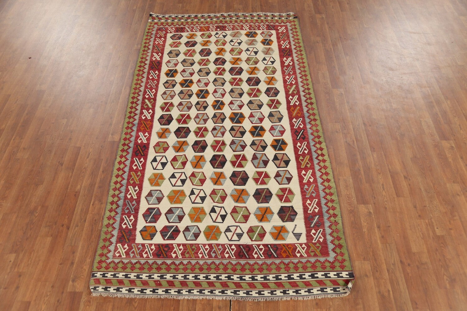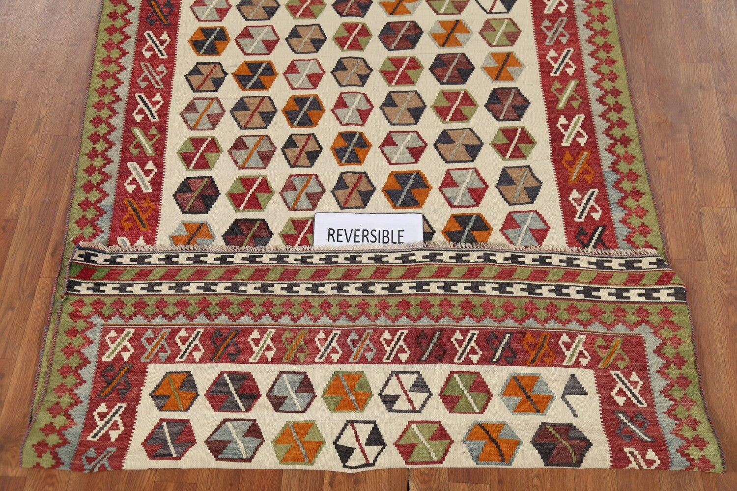 A Beautiful Genuine Persia ( Persia ) Kilim (Qashqai) rug is Hand Woven by skillful weavers in Persia ( Persia ) with 100% Wool Material. This rug is in Very Good condition. dimensions are 8' 4'' X 4' 7'' in foot and 254 X 140 in centimeter. the primary color is Beige & Ivories.