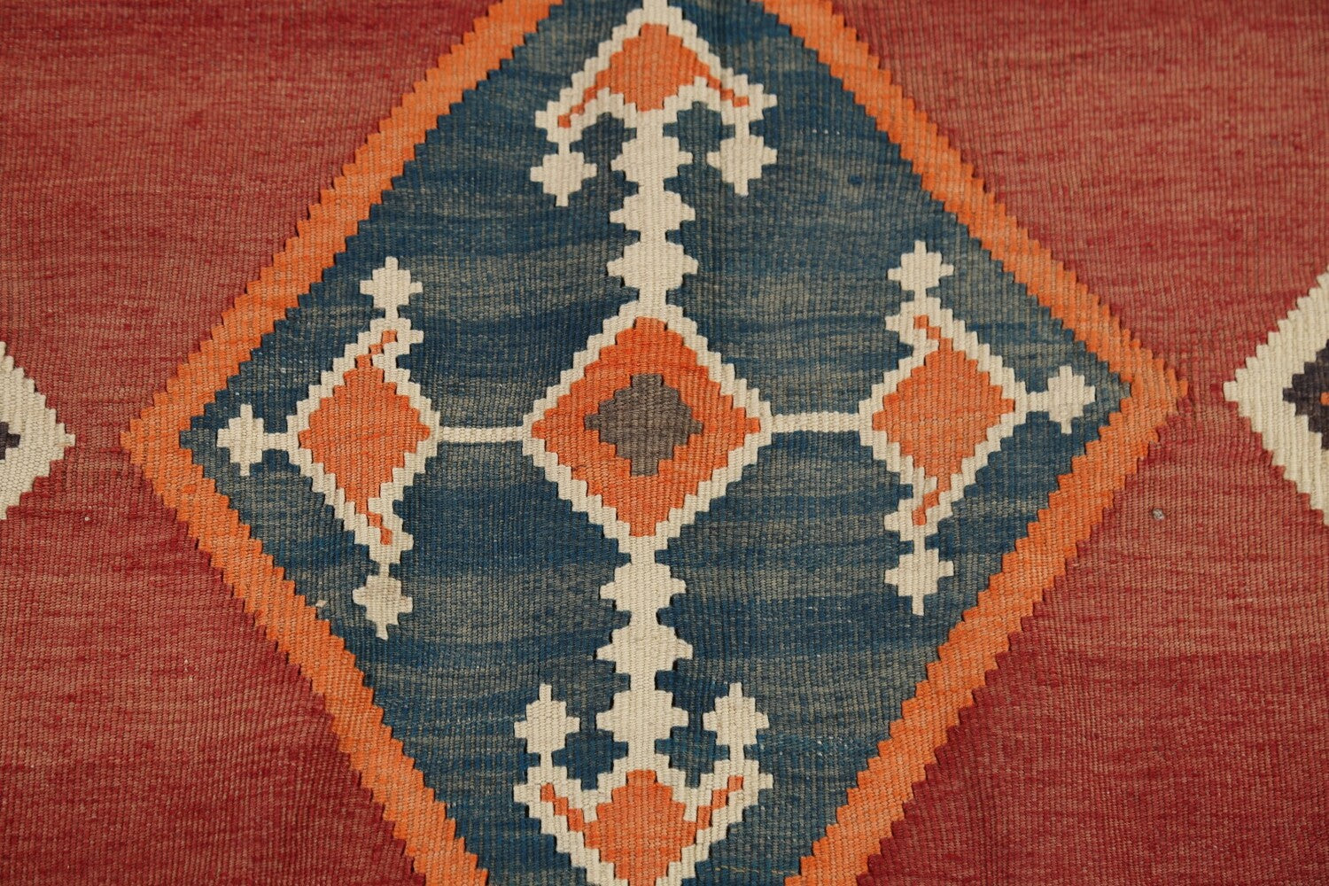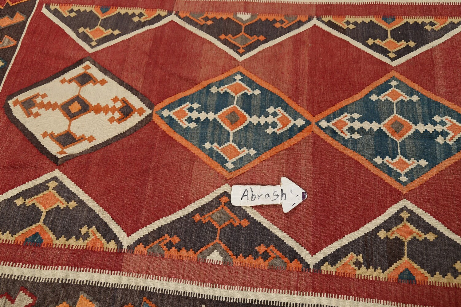 A Beautiful Genuine Persia ( Persia ) Kilim (Qashqai) rug is Hand Woven by skillful weavers in Persia ( Persia ) with 100% Wool Material. This rug is in Very Good (Abrash) condition. dimensions are 7' 10'' X 4' 6'' in foot and 239 X 137 in centimeter. the primary color is Red.