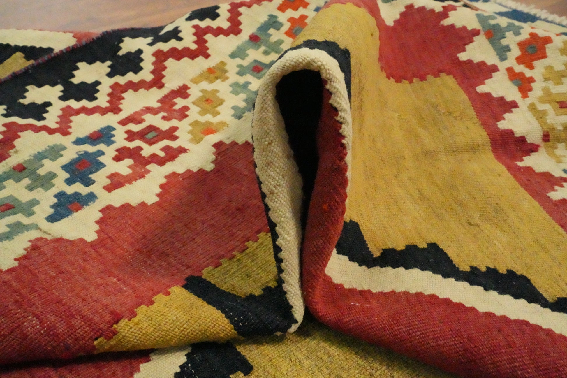 A Beautiful Genuine Persia ( Persia ) Kilim (Qashqai) rug is Hand Woven by skillful weavers in Persia ( Persia ) with 100% Wool Material. This rug is in Very Good (Abrash-Repair) condition. dimensions are 7' 11'' X 4' 6'' in foot and  241 X 137 in centimeter. the primary color is Oranges & Rust.