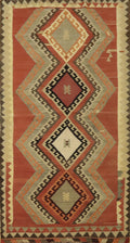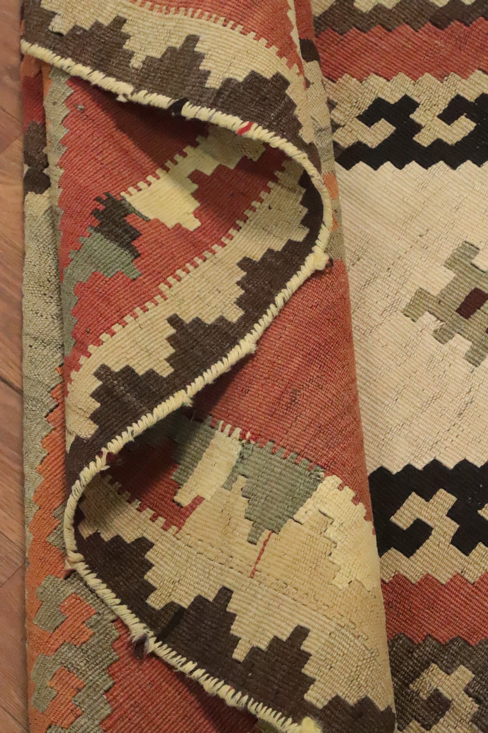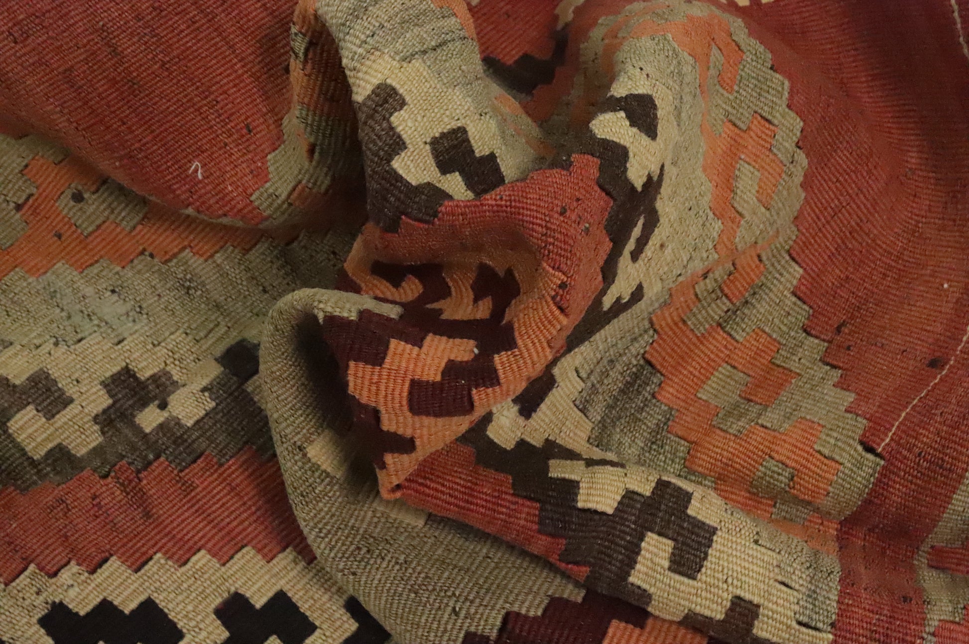 A Beautiful Genuine Persia ( Persia ) Kilim (Qashqai) rug is Hand Woven by skillful weavers in Persia ( Persia ) with 100% Wool Material. This rug is in Very Good (Abrash) condition. dimensions are 9' 3'' X 4' 9'' in foot and  282 X 145 in centimeter. the primary color is Oranges & Rust.